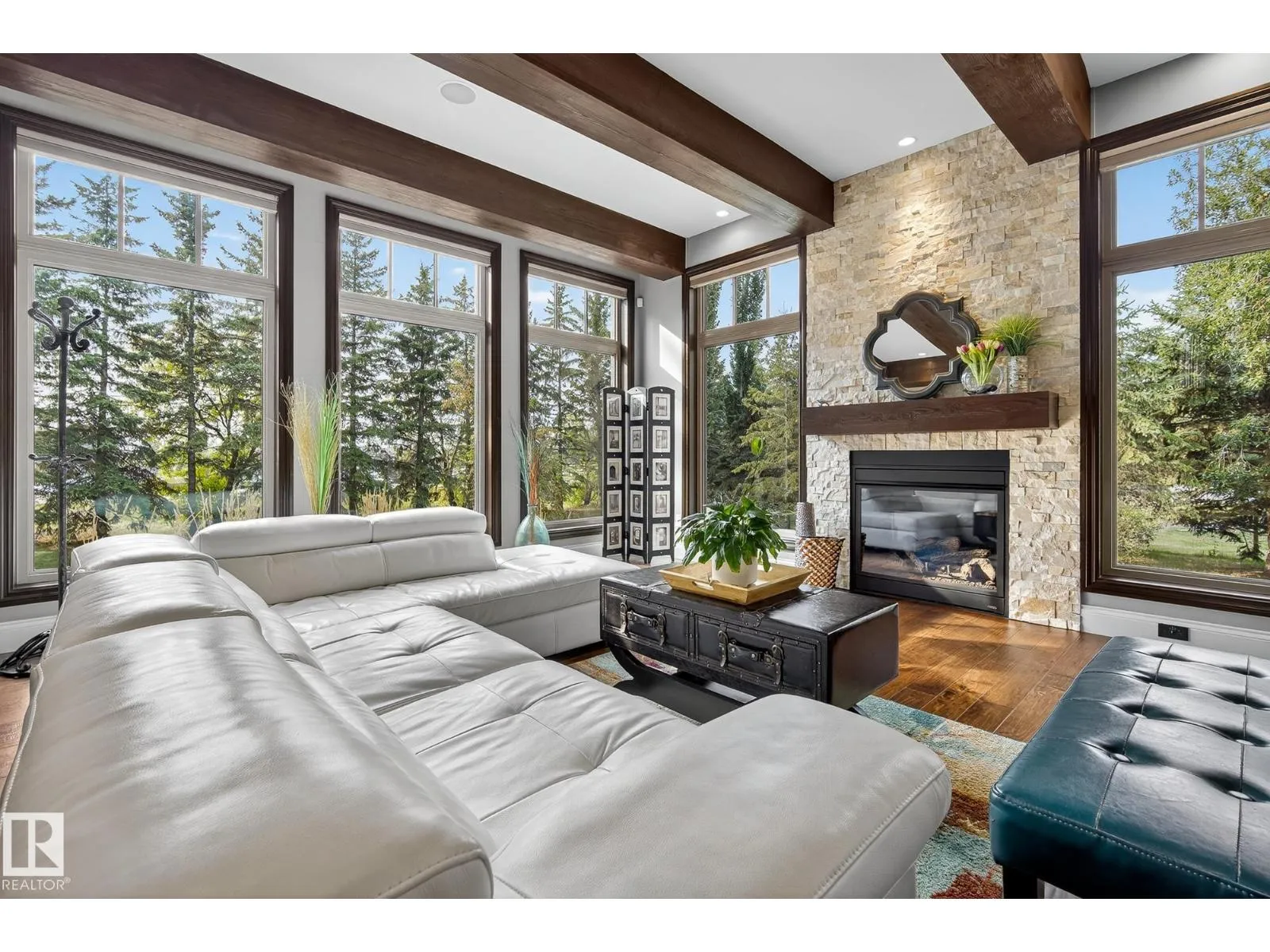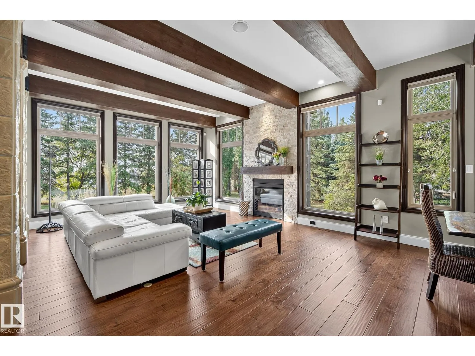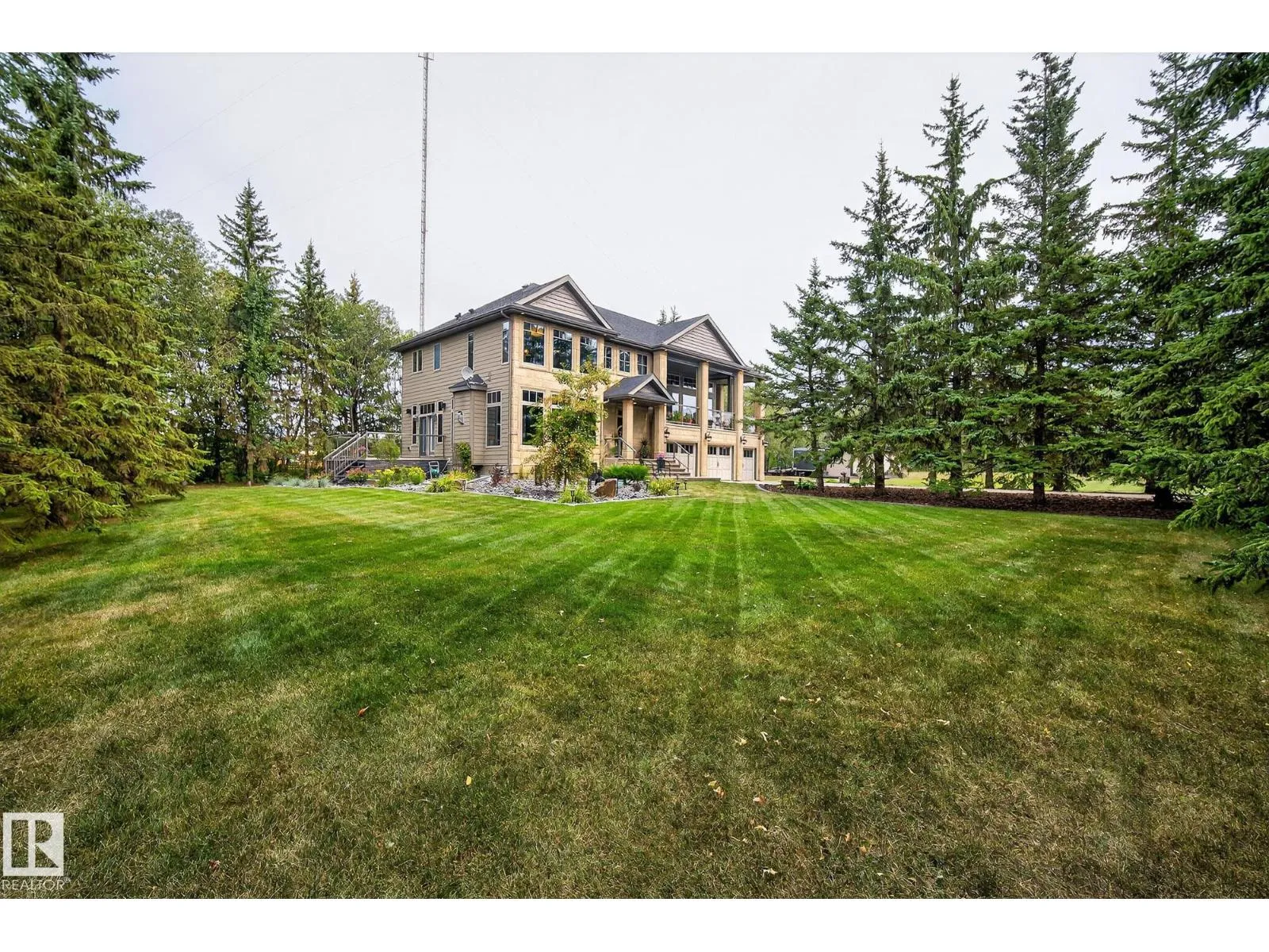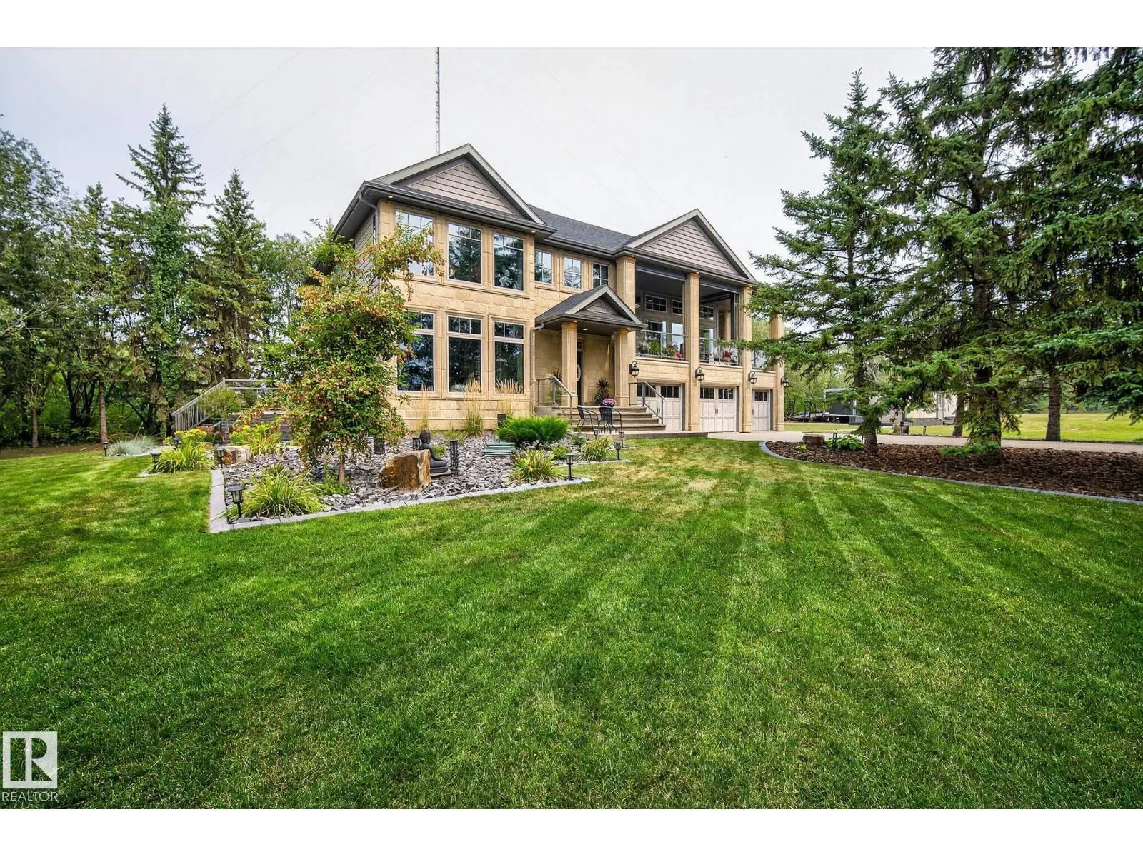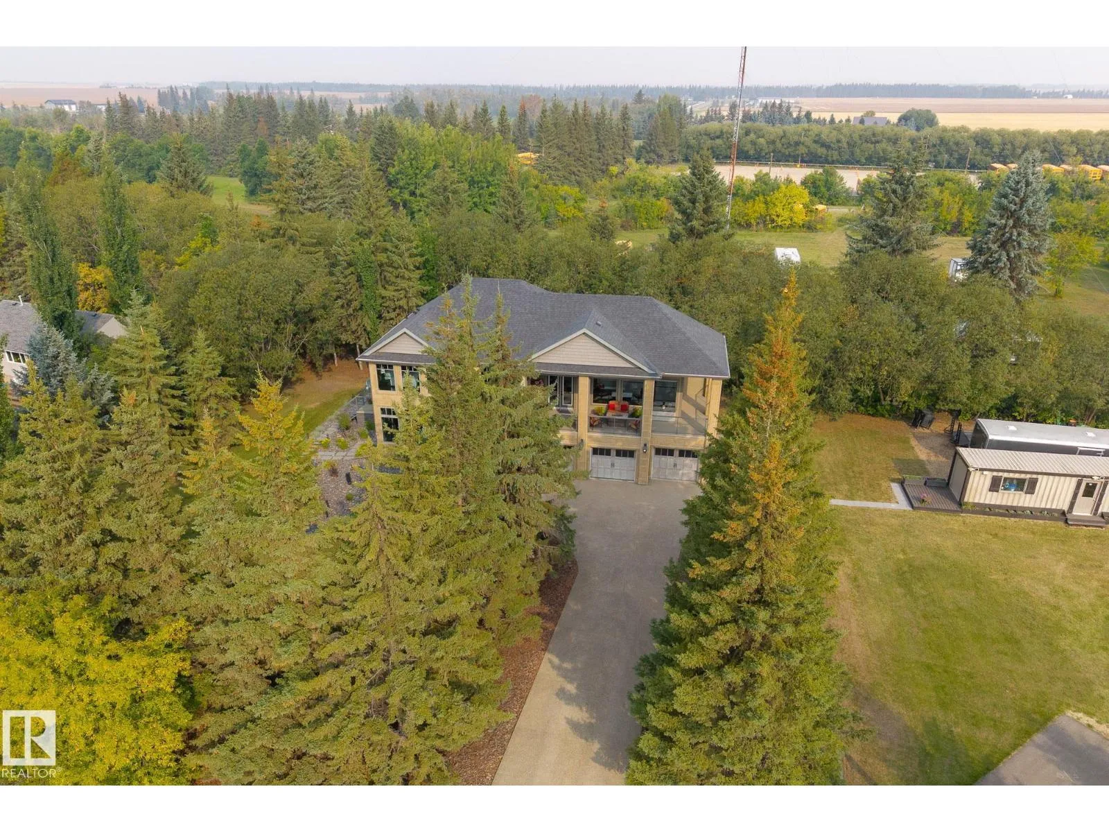 Located across from Sandpiper Golf Course and less than 5 minutes west of St. Albert, this former Brookhaven showhome blends architectural character with the serenity of acreage living. The main level showcases a custom kitchen by Gem Cabinets, rich wood beams, stone pillars, and floor-to-ceiling windows framing peaceful tree-line views. A curved open-tread staircase leads to a spacious den and bonus room with access to a screened-in upper patio by Suncoast Enclosures. Upstairs offers 3 bedrooms and 2 full baths, including a generous primary retreat overlooking the trees. The fully finished basement includes a 4th bedroom, projector TV area, and ample storage. Enjoy A/C, a fully finished heated triple attached garage, fibre internet, a sea-can for additional storage, and recently updated landscaping. The 1.55-acre lot offers room to build a secondary shop. City convenience. Country tranquility. Welcome home. (id:27476)