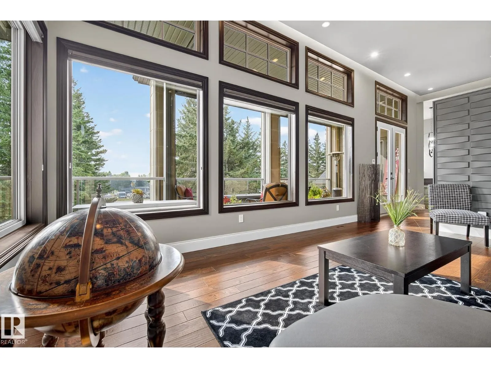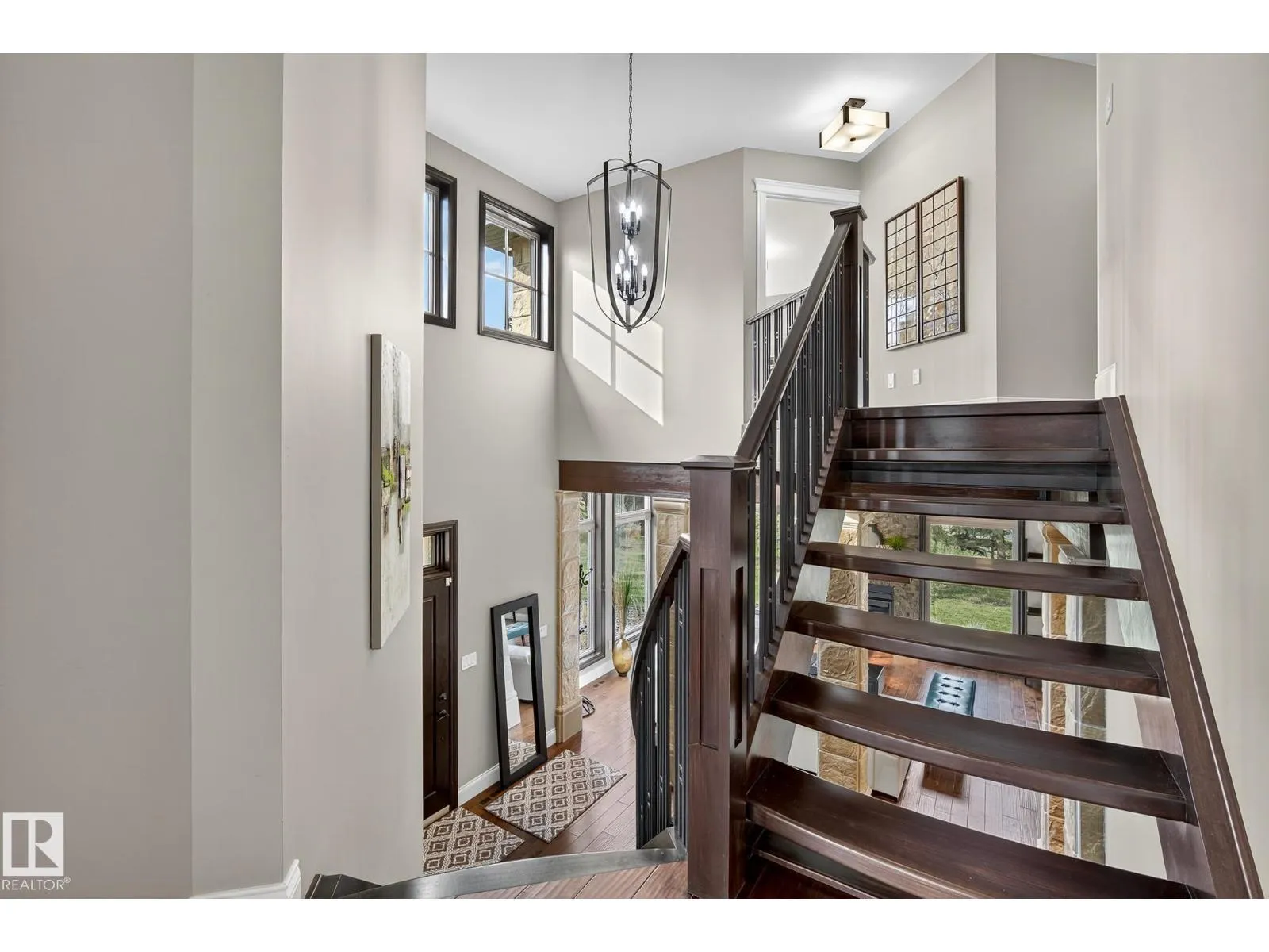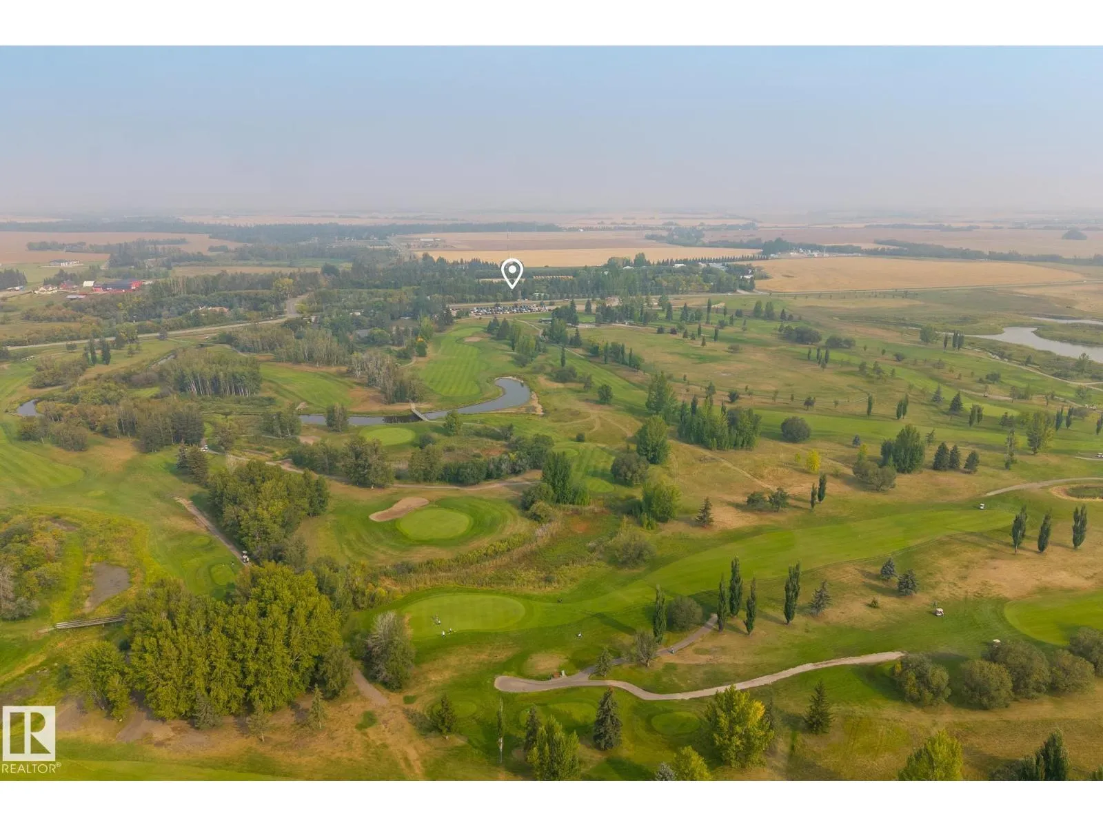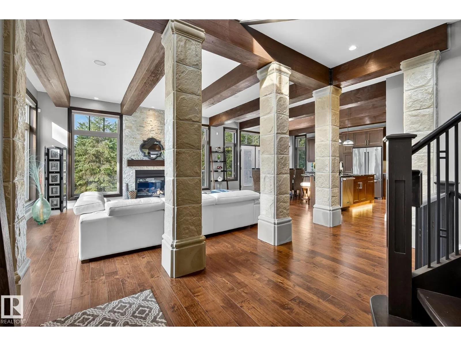 Located across from Sandpiper Golf Course and less than 5 minutes west of St. Albert, this former Brookhaven showhome blends architectural character with the serenity of acreage living. The main level showcases a custom kitchen by Gem Cabinets, rich wood beams, stone pillars, and floor-to-ceiling windows framing peaceful tree-line views. A curved open-tread staircase leads to a spacious den and bonus room with access to a screened-in upper patio by Suncoast Enclosures. Upstairs offers 3 bedrooms and 2 full baths, including a generous primary retreat overlooking the trees. The fully finished basement includes a 4th bedroom, projector TV area, and ample storage. Enjoy A/C, a fully finished heated triple attached garage, fibre internet, a sea-can for additional storage, and recently updated landscaping. The 1.55-acre lot offers room to build a secondary shop. City convenience. Country tranquility. Welcome home. (id:27476)