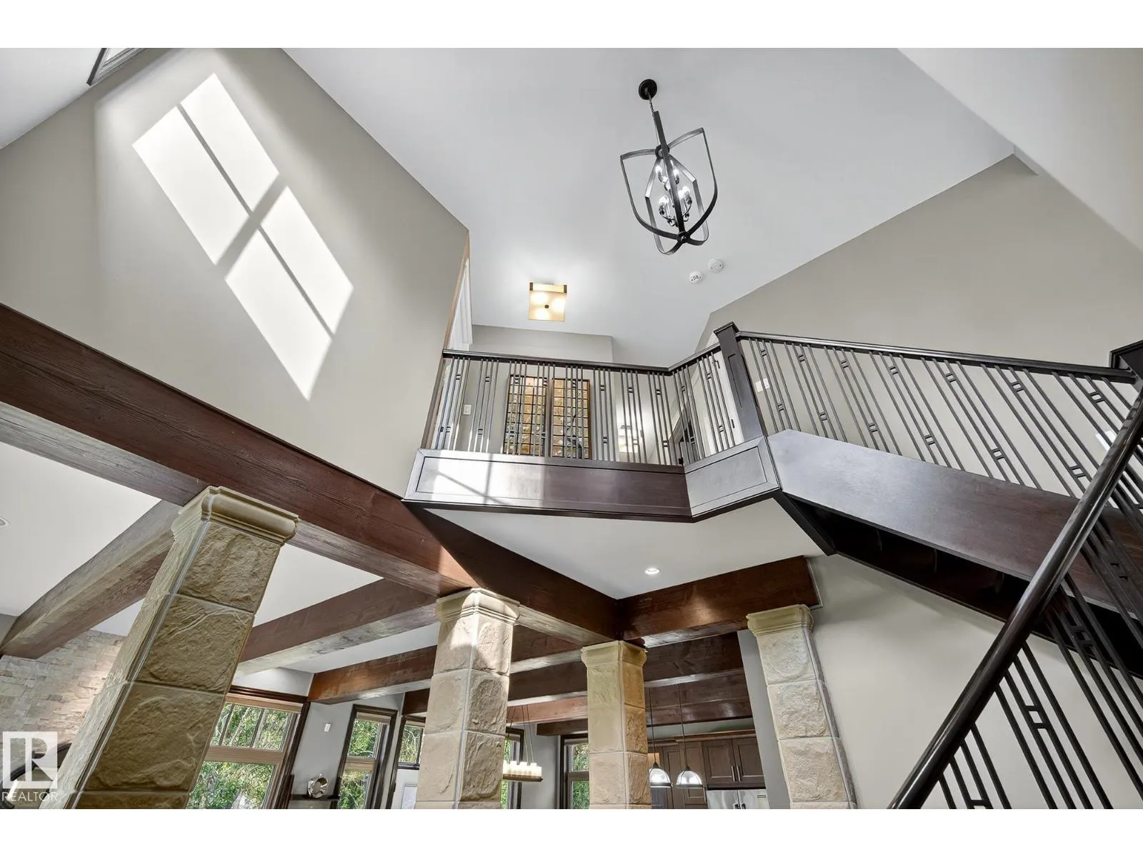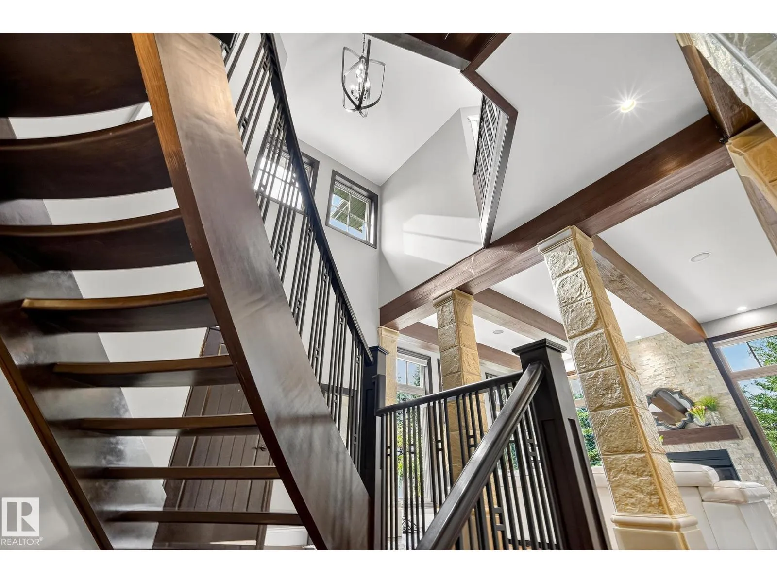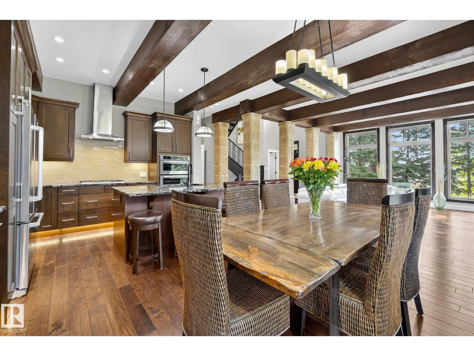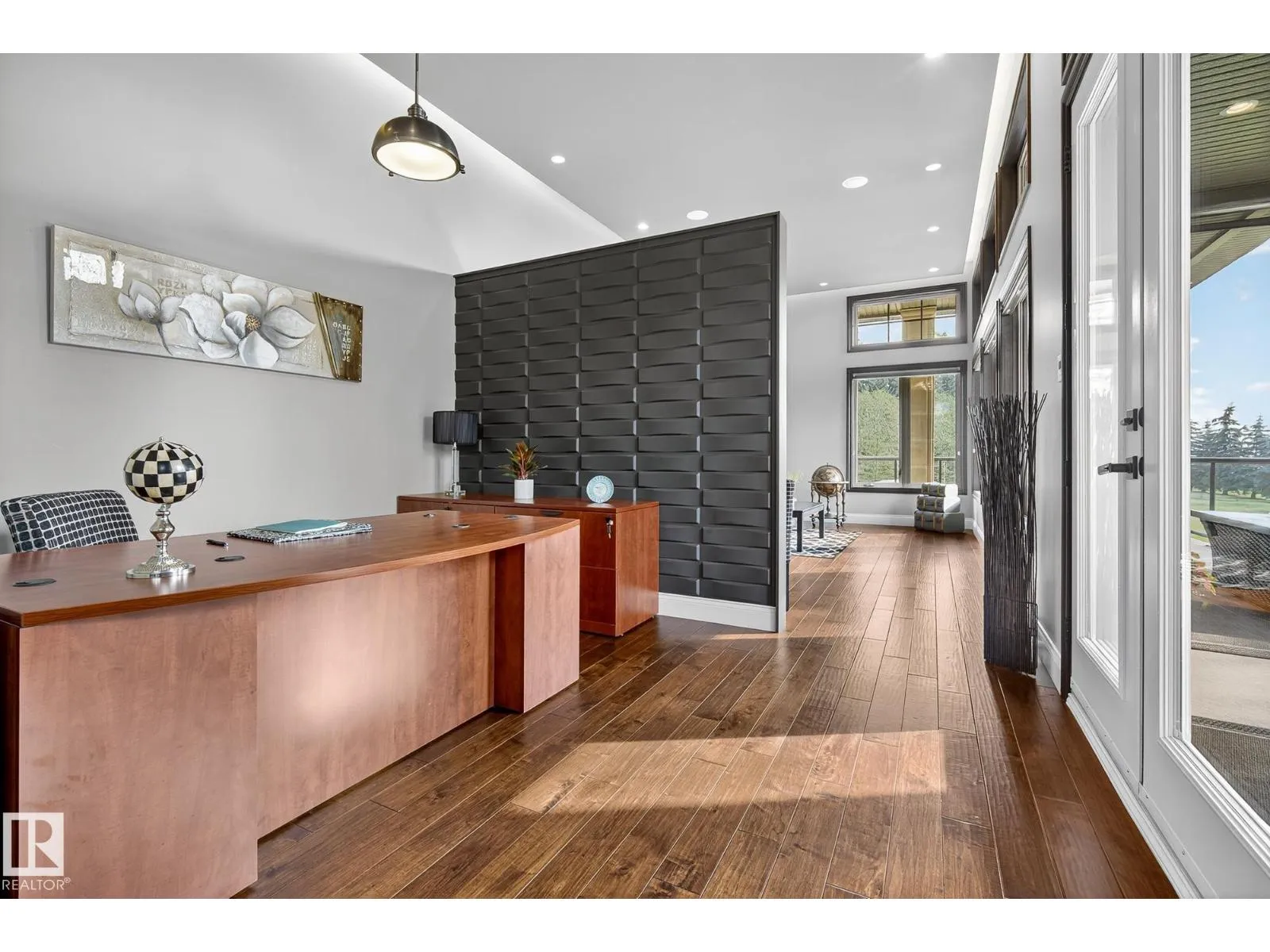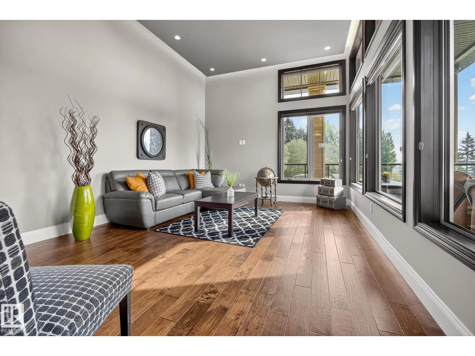 Located across from Sandpiper Golf Course and less than 5 minutes west of St. Albert, this former Brookhaven showhome blends architectural character with the serenity of acreage living. The main level showcases a custom kitchen by Gem Cabinets, rich wood beams, stone pillars, and floor-to-ceiling windows framing peaceful tree-line views. A curved open-tread staircase leads to a spacious den and bonus room with access to a screened-in upper patio by Suncoast Enclosures. Upstairs offers 3 bedrooms and 2 full baths, including a generous primary retreat overlooking the trees. The fully finished basement includes a 4th bedroom, projector TV area, and ample storage. Enjoy A/C, a fully finished heated triple attached garage, fibre internet, a sea-can for additional storage, and recently updated landscaping. The 1.55-acre lot offers room to build a secondary shop. City convenience. Country tranquility. Welcome home. (id:27476)