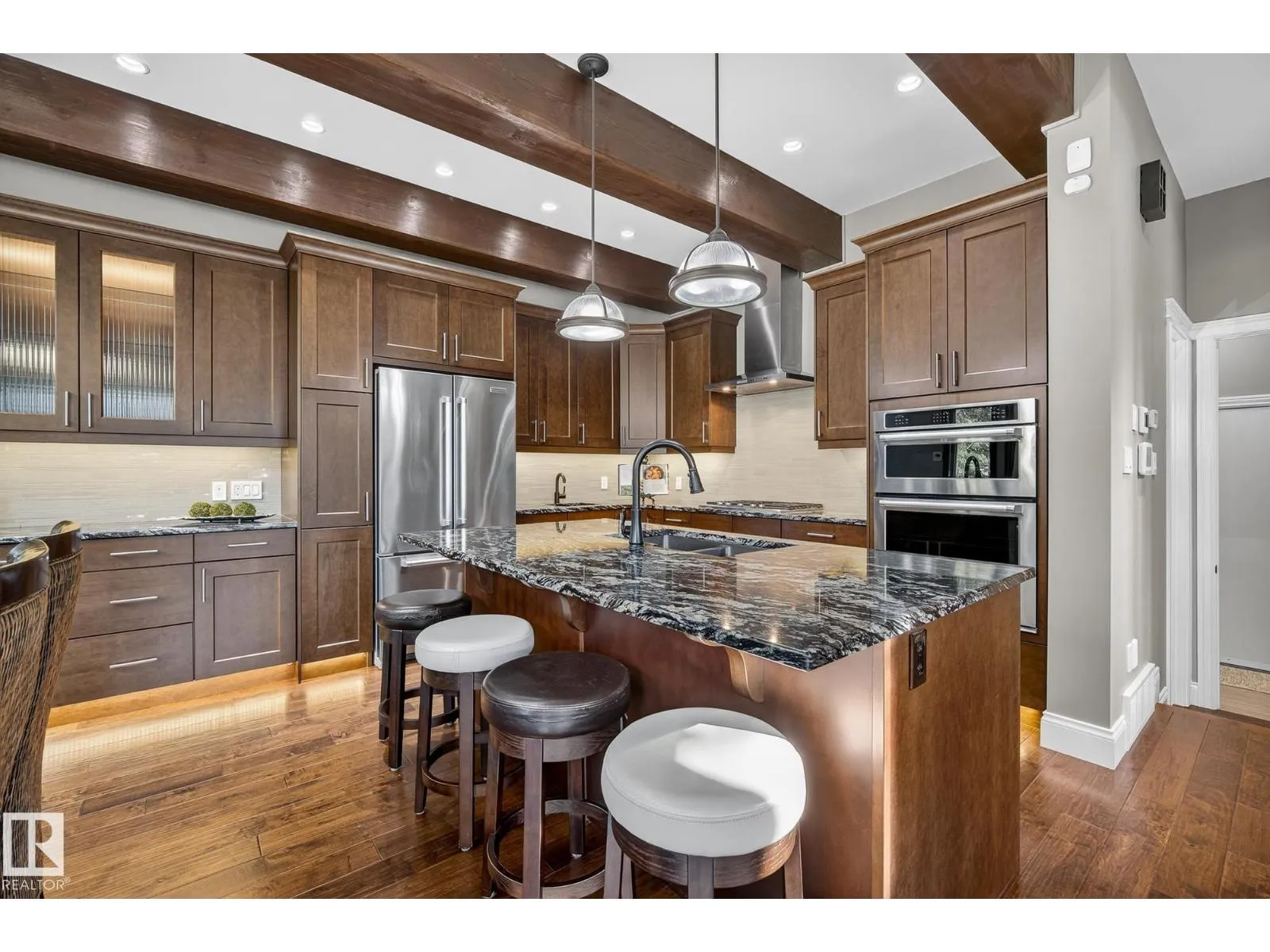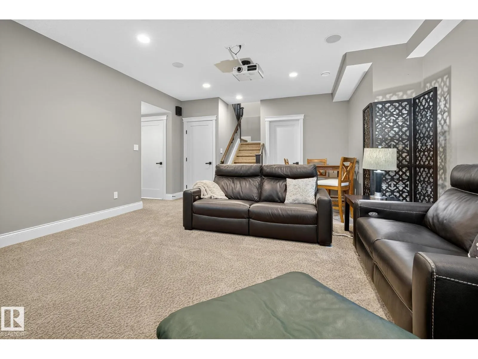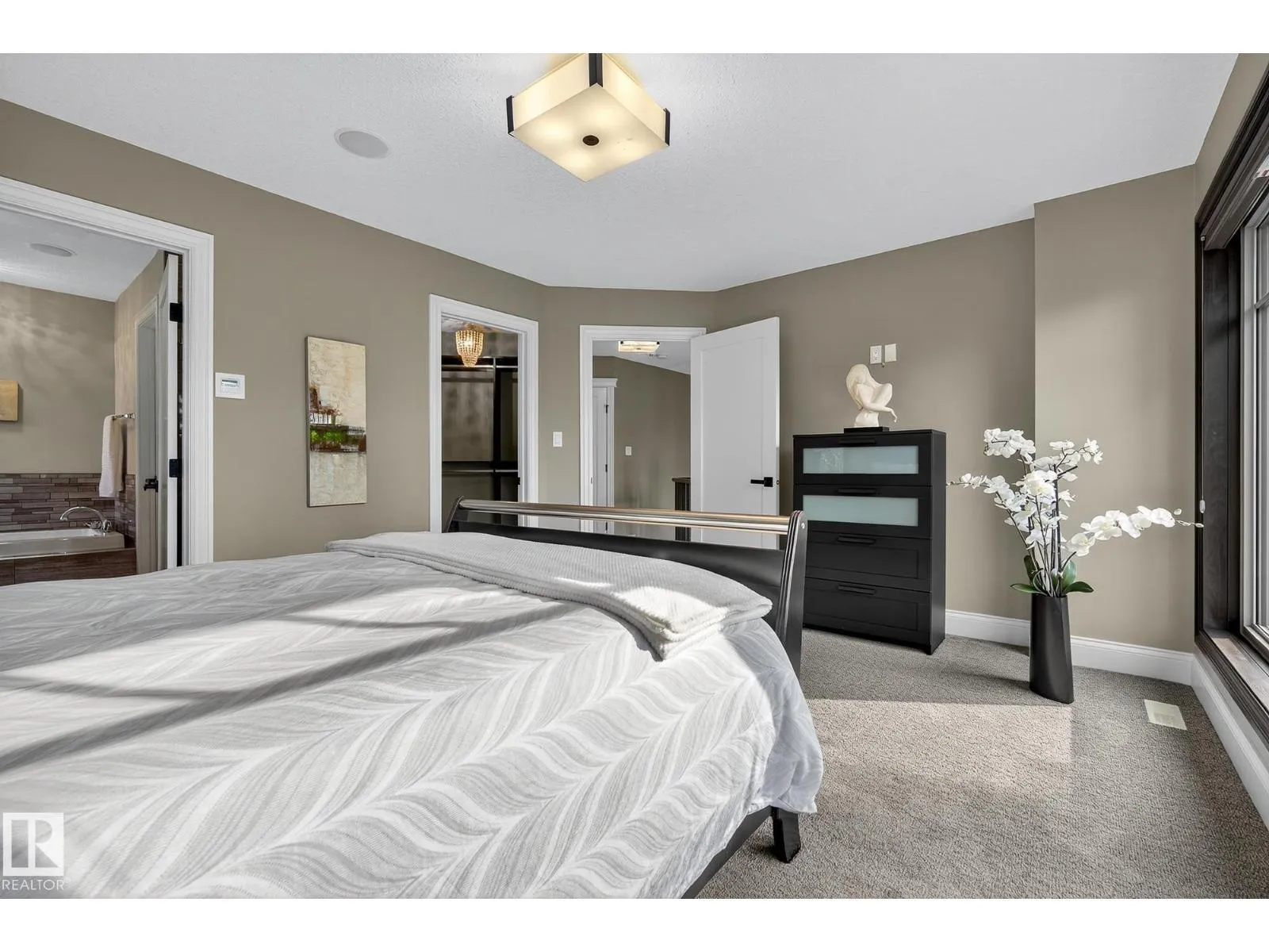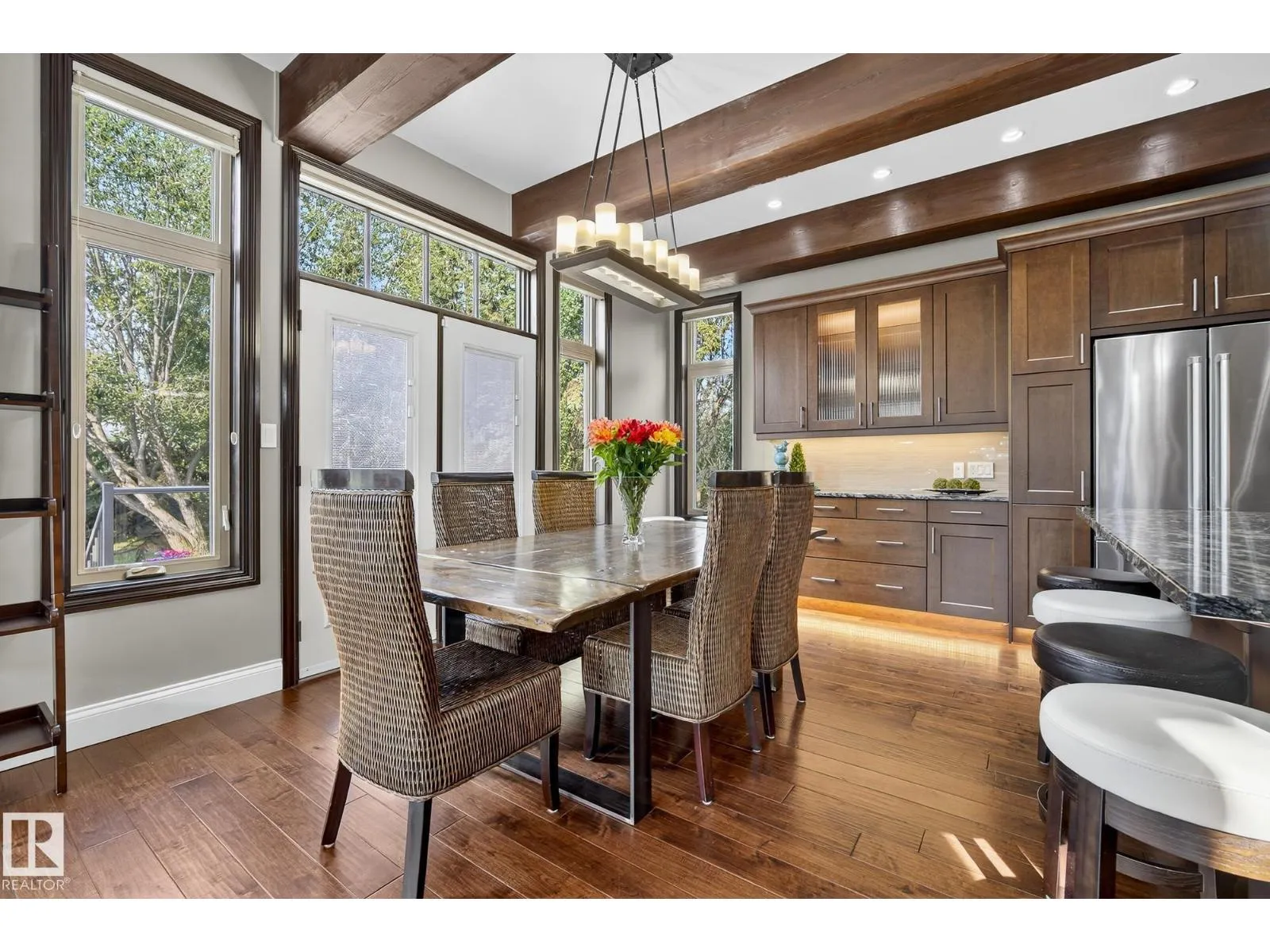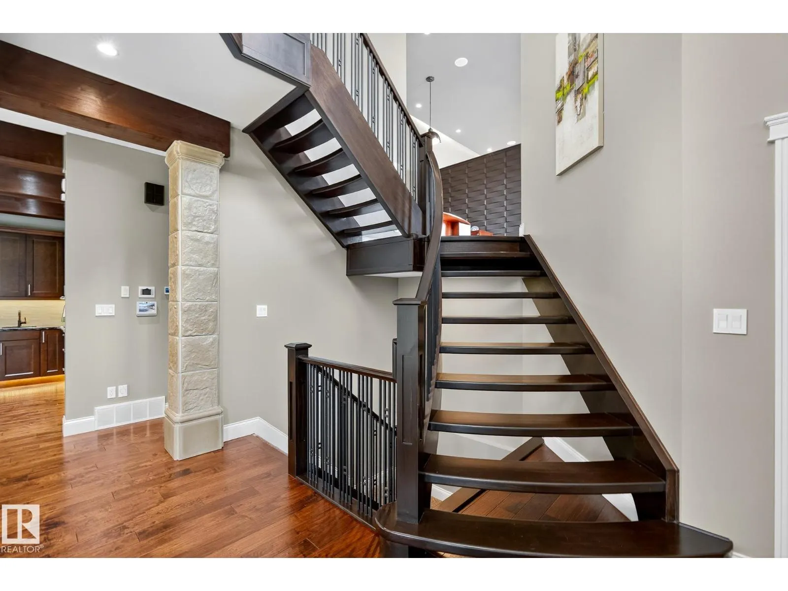 Located across from Sandpiper Golf Course and less than 5 minutes west of St. Albert, this former Brookhaven showhome blends architectural character with the serenity of acreage living. The main level showcases a custom kitchen by Gem Cabinets, rich wood beams, stone pillars, and floor-to-ceiling windows framing peaceful tree-line views. A curved open-tread staircase leads to a spacious den and bonus room with access to a screened-in upper patio by Suncoast Enclosures. Upstairs offers 3 bedrooms and 2 full baths, including a generous primary retreat overlooking the trees. The fully finished basement includes a 4th bedroom, projector TV area, and ample storage. Enjoy A/C, a fully finished heated triple attached garage, fibre internet, a sea-can for additional storage, and recently updated landscaping. The 1.55-acre lot offers room to build a secondary shop. City convenience. Country tranquility. Welcome home. (id:27476)