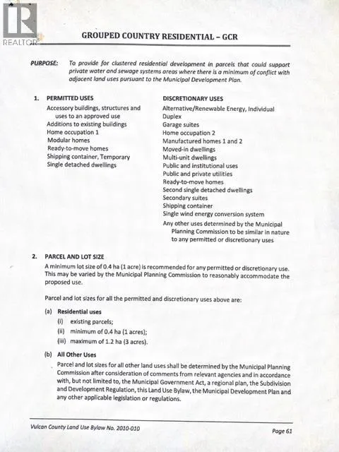 LOT 1. PRIMARY POWER LINES ARE IN !!!! Here is your chance to bring your ideas and purchase your very own acreage lot. With the Grouped Country Residential zoning it will give you numerous options under the permitted and discretionary uses. There are very limited acreage lots available at this size and price. At just under 5 acres the possibilities are endless. For the naturalists these lots still contain untouched prairie wool grasses. The County of Vulcan has been a gem to deal with as well as the inspectors making the development process straight forward. Call your favorite agent today and lets discuss options!!! (id:27476)