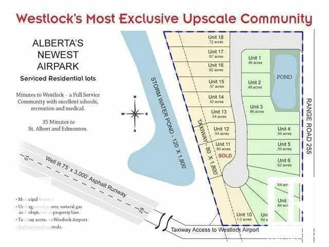 What a beautiful spot to build your dream home in Westlock County's upscale architecturally controlled sub-division from .14 acres to 1 acre in size that have municipal water, underground power, gas and telephone to each lot. These lots have aircraft access to Westlock Airport and it's an easy commute to Edmonton (35 minutes to St. Albert) or points north . Adjacent to Rainbow Park just 4 1/2 miles from town. Large ponds with wildlife (largest is 1800 ft long for kayak/canoeing), 1000 lovely, planted trees (2014) including Lilac, Golden Willow, Red Osier Dogwood & Laurel Leaf Willows surround the sub-division and embrace the entryway. Westlock is a full service community with modern hospital, public & private schools, shopping & recreational facilities, 18 hole golf and 15 minutes to Tawatinaw Ski hill with downhill, snowboard, tubing & cross-country skiing. Country living at it's finest. GST may apply. (id:27476)