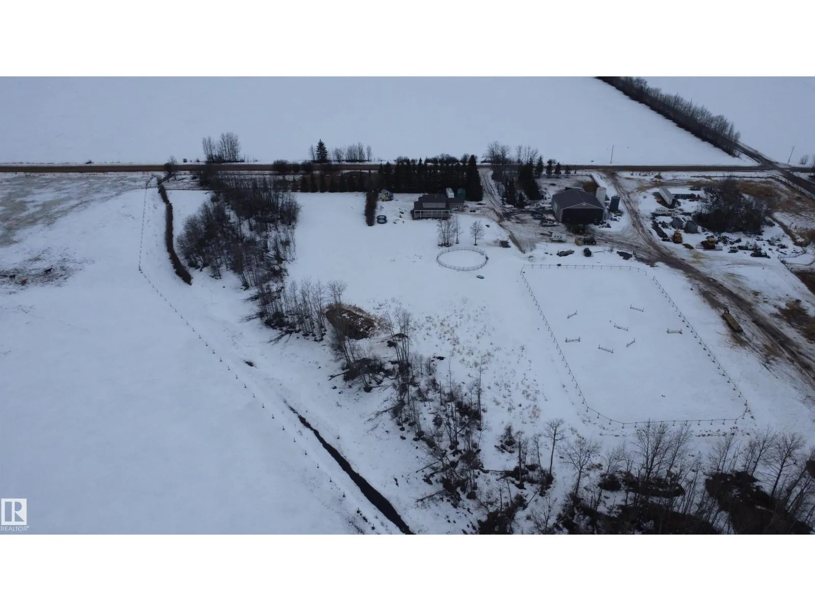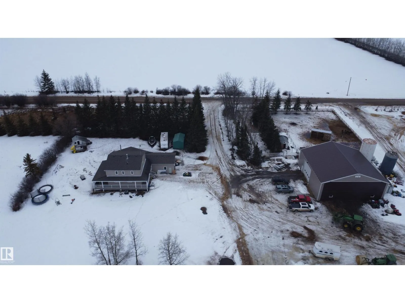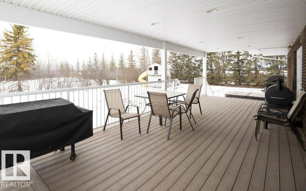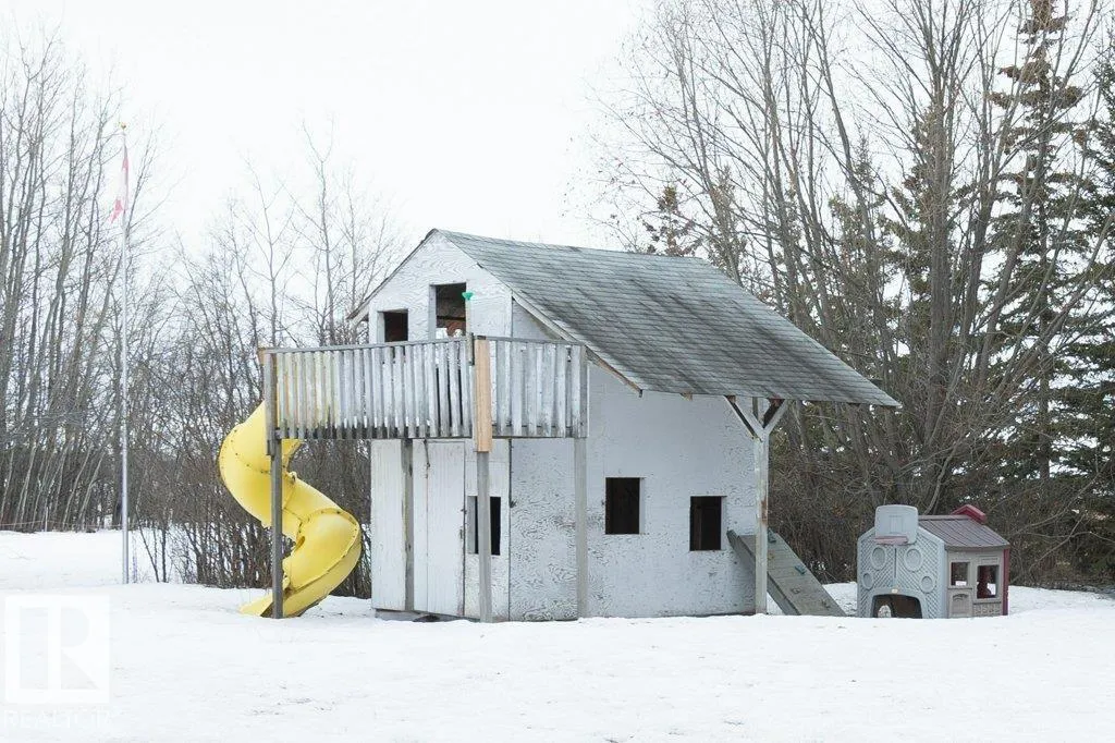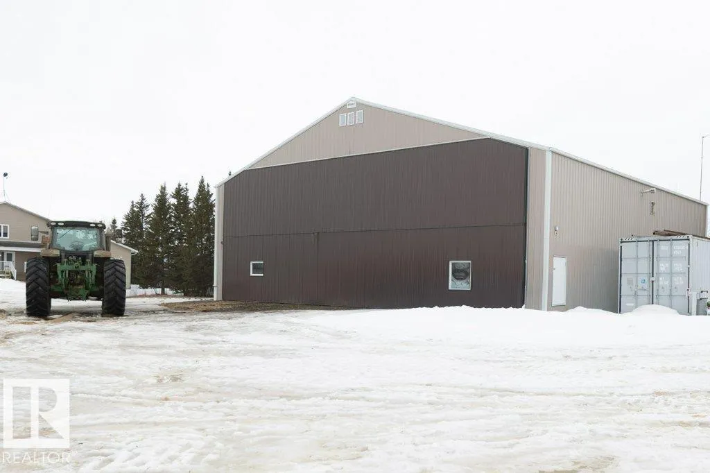 12.72-acre animal-ready acreage featuring a fully finished 2,186 sq ft two-story home with attached heated garage and impressive 60x60 shop/airplane hangar. The main floor offers a bedroom with Murphy bed, 3-pc bath, walk-in closet, laundry with wash tub and space for a deep freezer, and a large south-facing living room with hard wood floors. The massive kitchen with island and dining area open through garden doors to a wraparound composite deck with aluminum railing and hot tub (as is). Upstairs includes three bedrooms, a spacious primary suite with walk-through closet and 3-pc ensuite, plus a 3-pc bath with jetted tub. The fully finished basement features a family room with wet bar and wood stove, bedroom, 4-pc bath, mechanical room, and storage. Central A/C adds comfort. Upgraded vinyl windows. Outside boasts a new sand-based riding arena. The shop includes an overhead door, folding hangar door, office, 2-pc bath, and mezzanine. Located just one crossroad off pavement for convenient access. (id:27476)