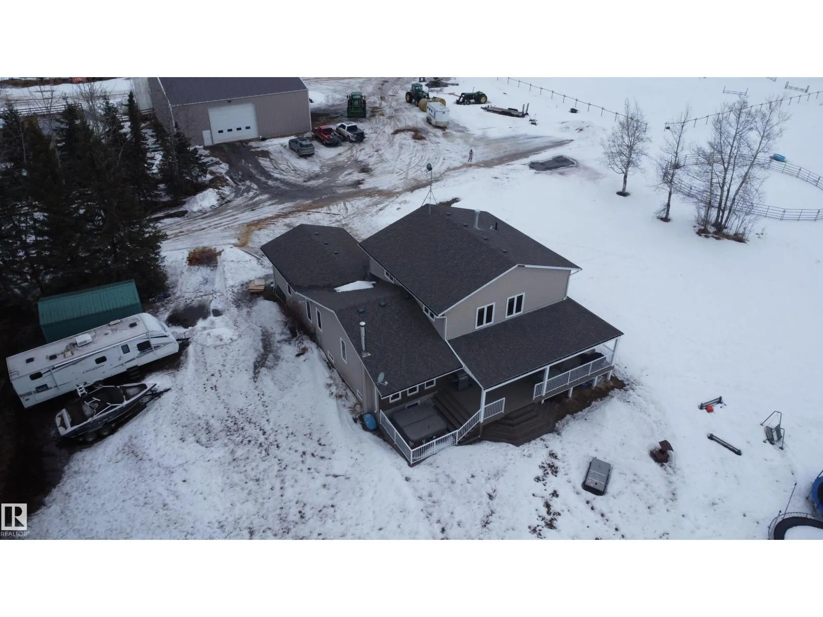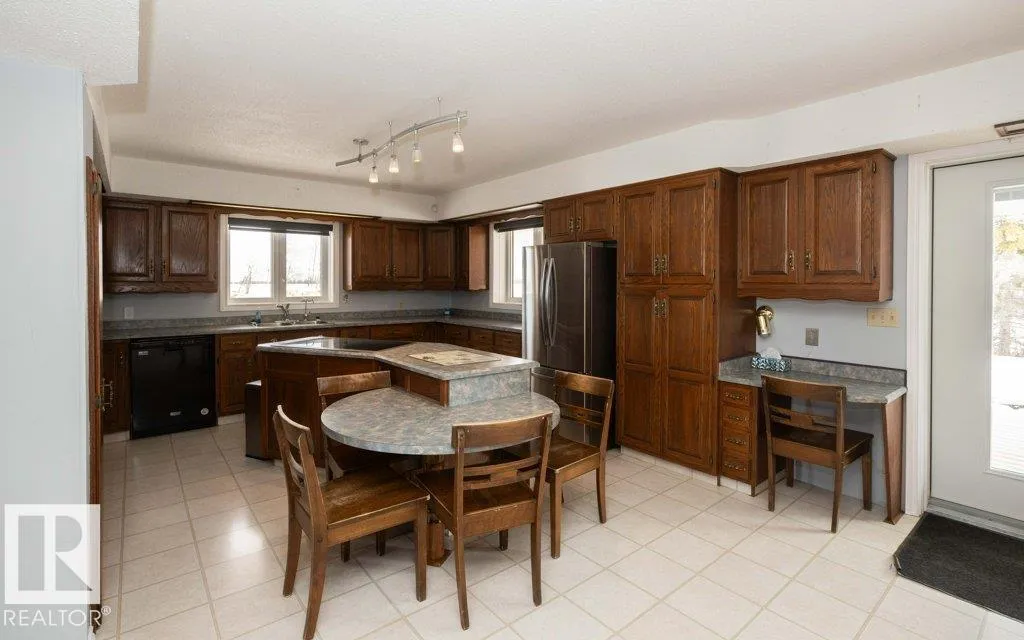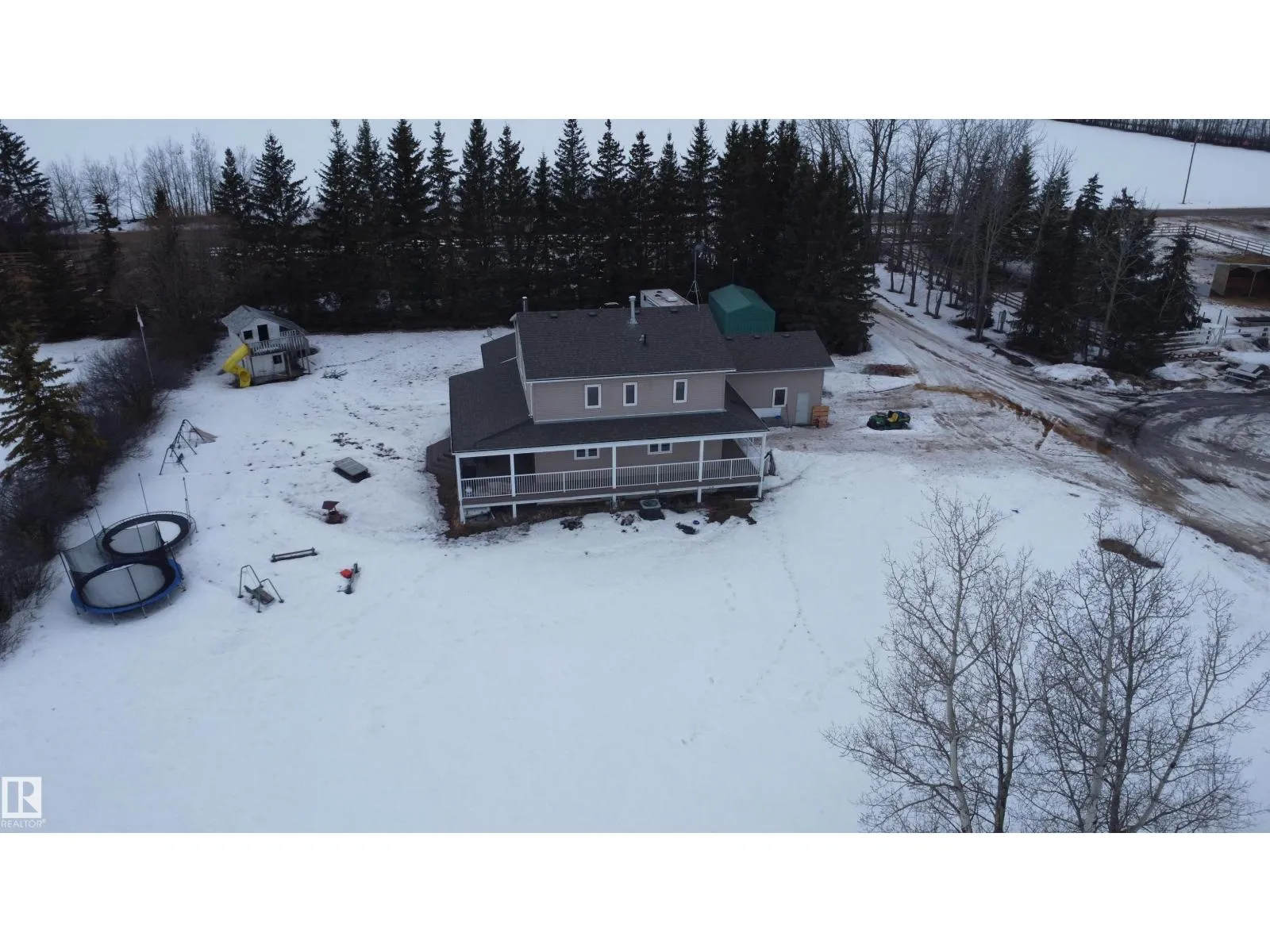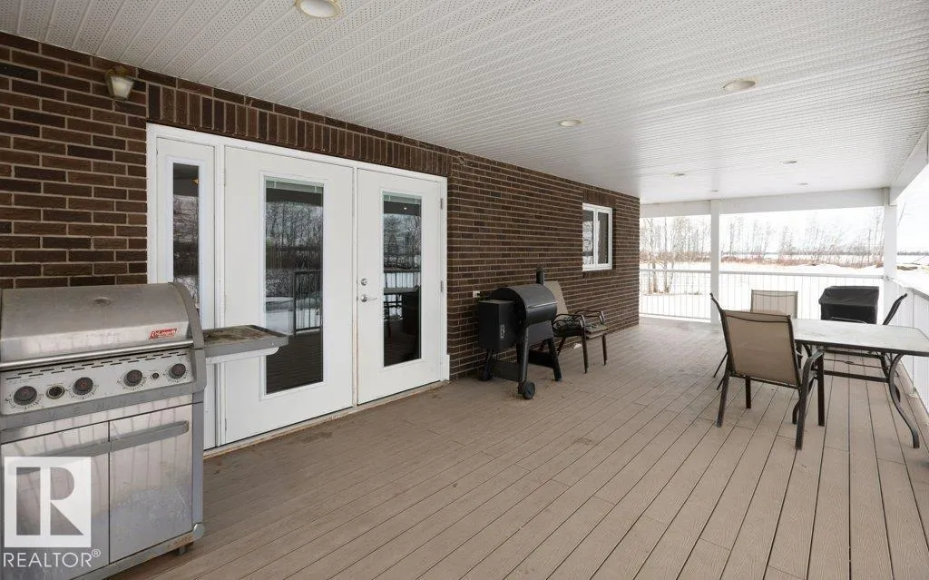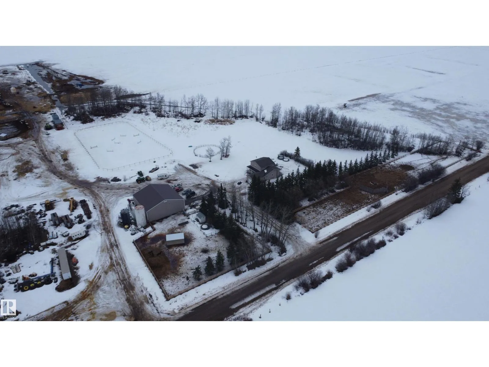 12.72-acre animal-ready acreage featuring a fully finished 2,186 sq ft two-story home with attached heated garage and impressive 60x60 shop/airplane hangar. The main floor offers a bedroom with Murphy bed, 3-pc bath, walk-in closet, laundry with wash tub and space for a deep freezer, and a large south-facing living room with hard wood floors. The massive kitchen with island and dining area open through garden doors to a wraparound composite deck with aluminum railing and hot tub (as is). Upstairs includes three bedrooms, a spacious primary suite with walk-through closet and 3-pc ensuite, plus a 3-pc bath with jetted tub. The fully finished basement features a family room with wet bar and wood stove, bedroom, 4-pc bath, mechanical room, and storage. Central A/C adds comfort. Upgraded vinyl windows. Outside boasts a new sand-based riding arena. The shop includes an overhead door, folding hangar door, office, 2-pc bath, and mezzanine. Located just one crossroad off pavement for convenient access. (id:27476)