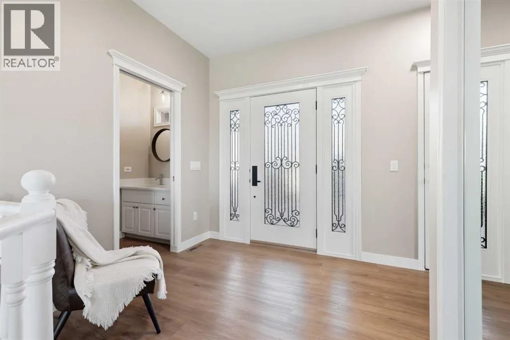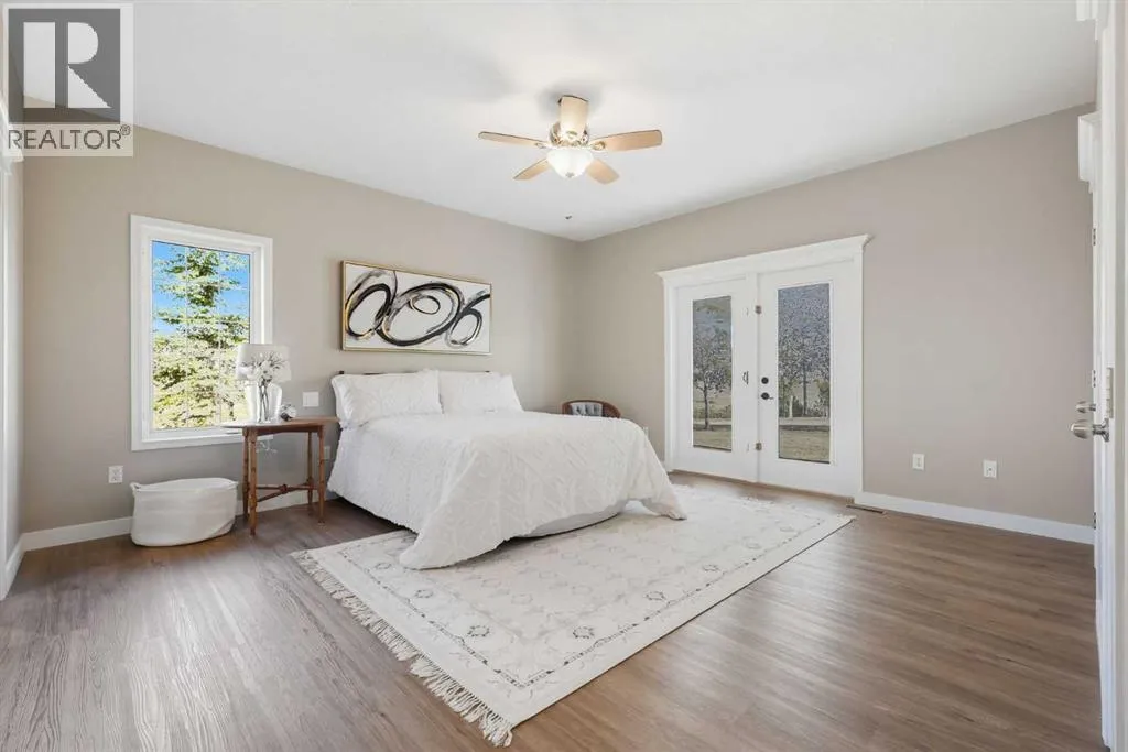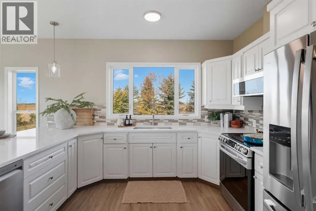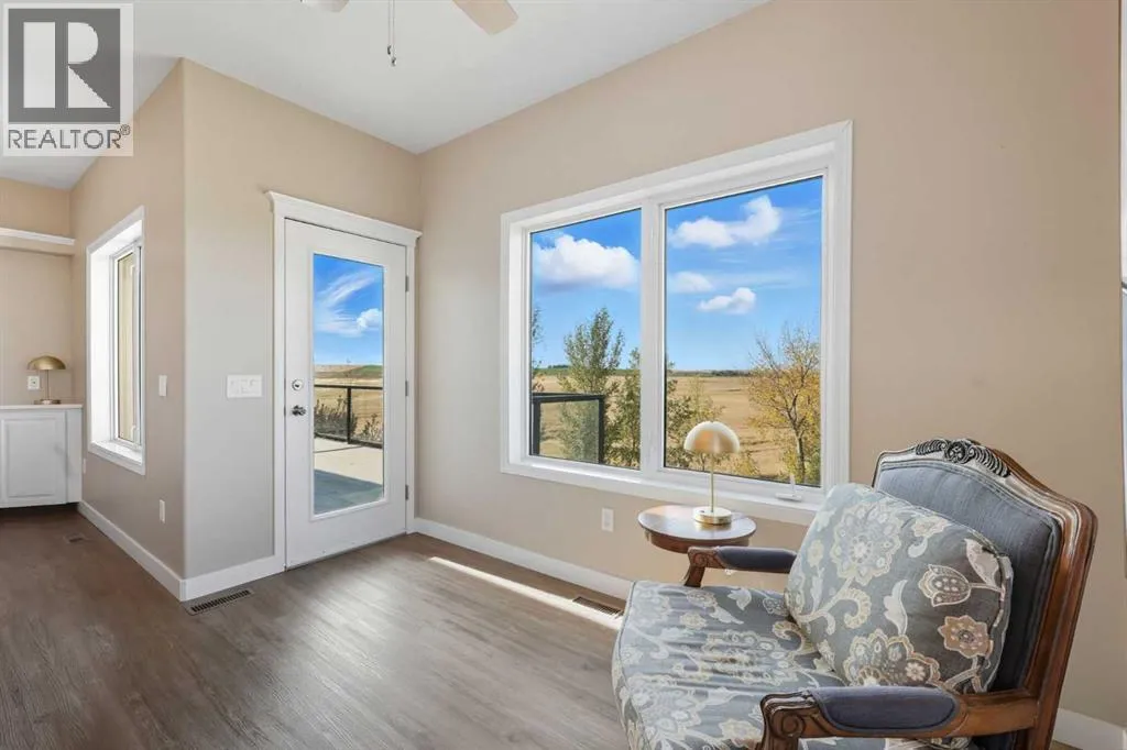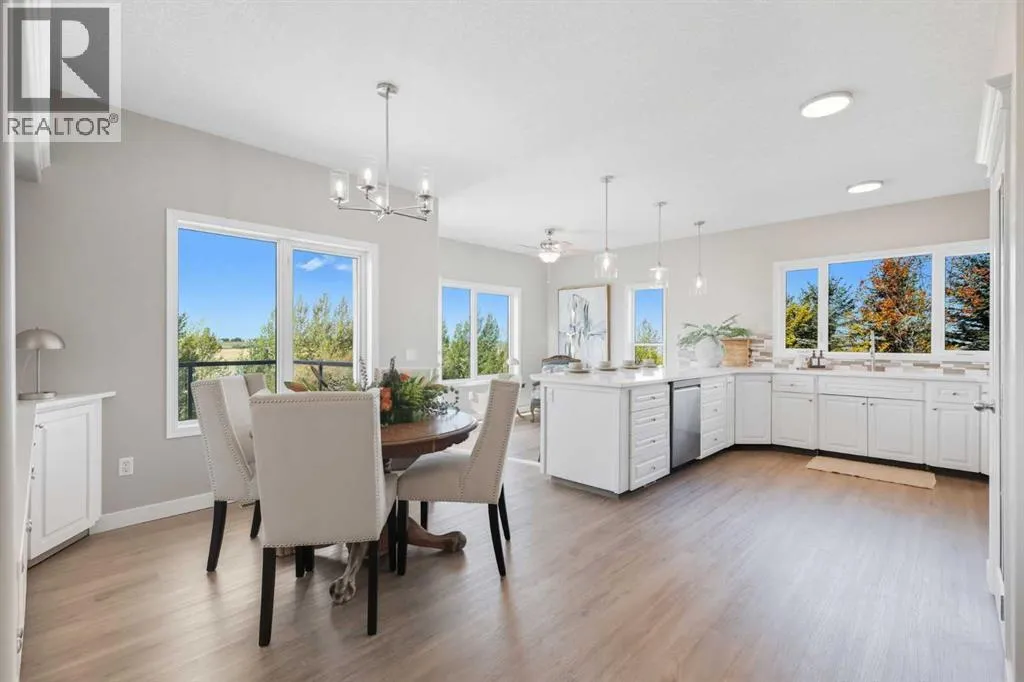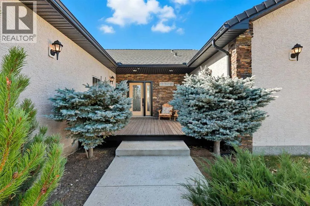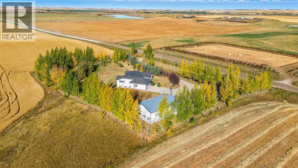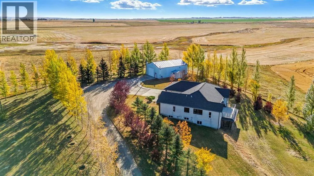 Welcome to this custom-built, 3500 sq ft developed area, walk-out bungalow perched on a scenic hilltop in Wheatland County, just 10 km north of Strathmore and only 25 minutes from Calgary International Airport. Set on 3 private, beautifully treed acres surrounded by agricultural fields and boasting unobstructed west-facing views of the Rocky Mountains, this property combines luxury living with peace and privacy. A tree-lined driveway lit with stately fixtures guides you to the home, which has been newly updated with modern paint, lighting, flooring, appliances, and decking, offering a fresh and stylish feel throughout. Designed for easy country living, the property is virtually maintenance free and finished with durable stucco and asphalt shingles. The 47â x 31â shop is fully insulated and heated, finished with a metal exterior and metal roof, making it ideal for storage, business, or hobby use in any season. Inside, the main floor showcases a large kitchen with peninsula seating, walk-in pantry, and a cozy breakfast nook with garden doors opening to the west-facing deck with glass railingsâperfect for evening sunsets. The dining area and main living room are filled with natural light from oversized windows, and anchored by a gas fireplace, creating a warm and welcoming atmosphere. The master suite includes two walk-in closets, a spa-inspired 4-piece ensuite with a standalone soaker tub and separate shower, and garden doors to the east, perfect for enjoying peaceful morning sun. A den, main floor laundry, and central air conditioning add comfort and practicality. The walk-out basement, complete with in-floor heating, features a large family room with a built-in entertainment area, three bedrooms, big windows, and access to an enclosed patioâa cozy, protected space to enjoy your surroundings year-round. Additional highlights: oversized attached garage with in-floor heat, built-in cabinetry, sink, and hot/cold water, as well as 3 frost-free hydrants located throughout the property. Surrounded by mature trees, wide-open fields, and breathtaking west-facing views. Just a short drive to amenities in Strathmore, and a quick commute to Calgary and YYC. This home offers the ideal combination of luxury, low-maintenance design, and unmatched rural charm. The land offers many possibilities too for future uses as the house and shop were developed on the east side of the property. Whether you're seeking a private family acreage or a turnkey retreat with space to work and play, this property delivers. A rare opportunity to own a thoughtfully designed, move-in-ready acreage in one of Wheatland Countyâs most desirable locations. Call your AWESOME Realtor today to book a viewing! (id:27476)