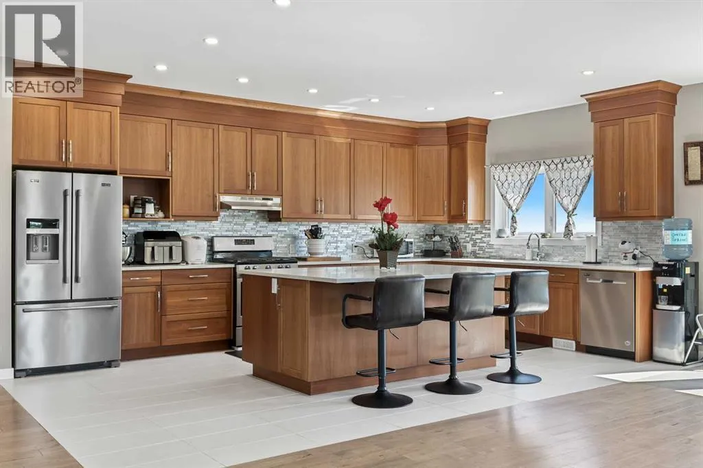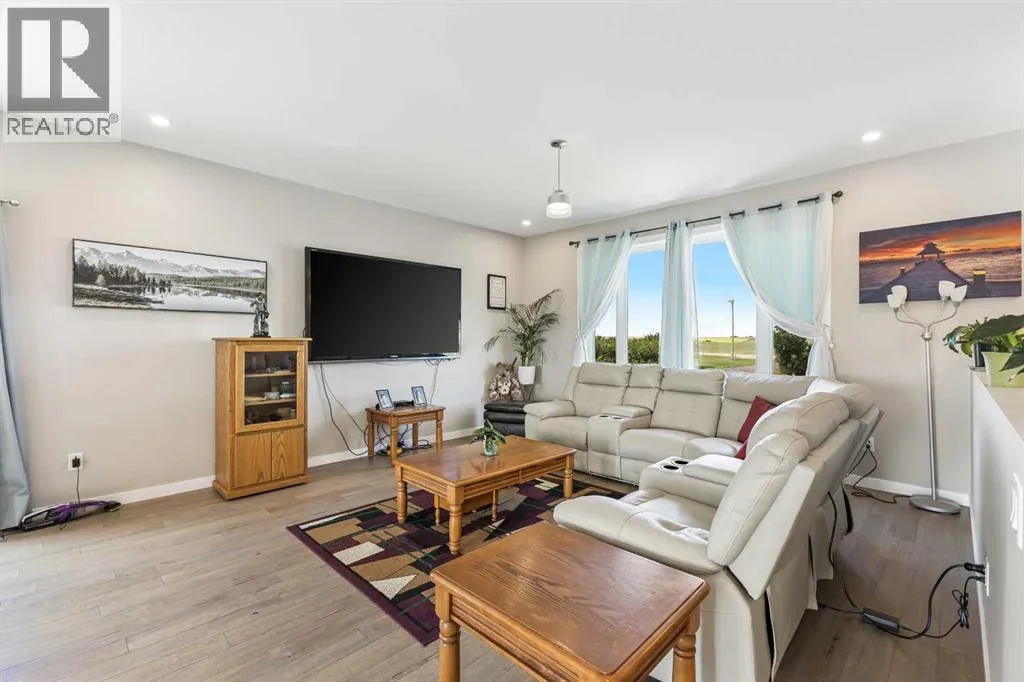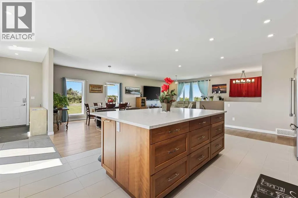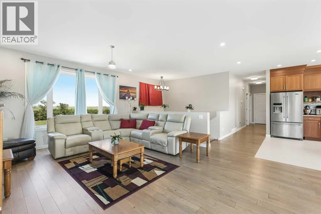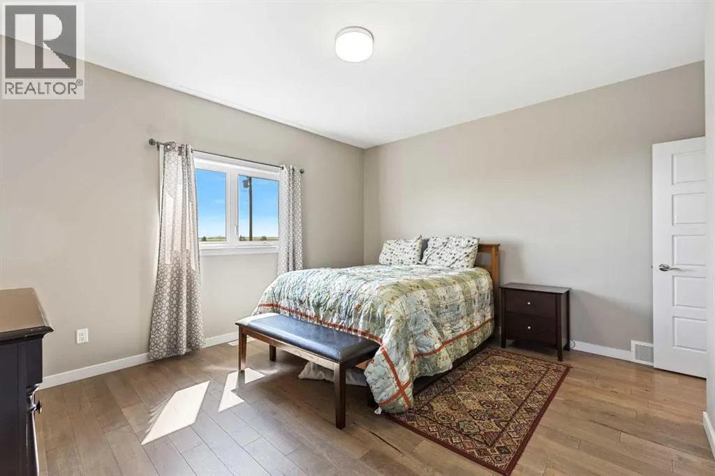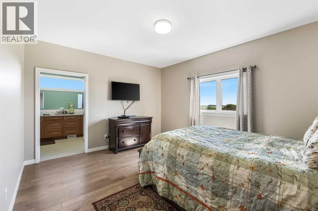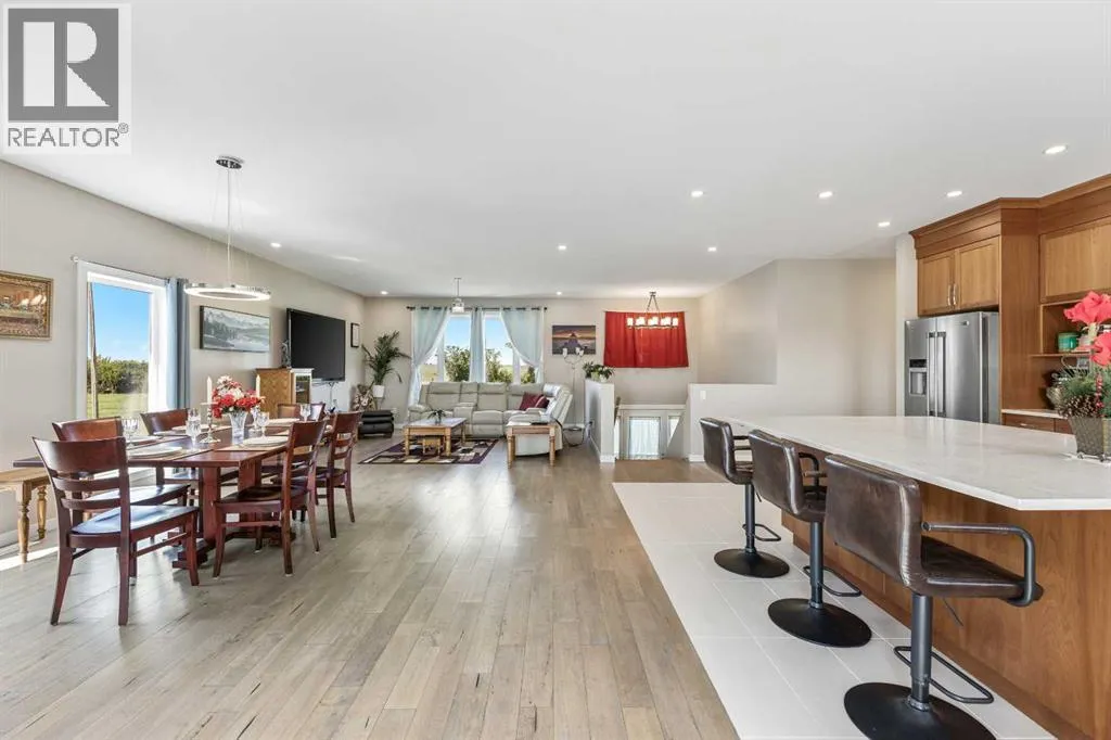 **Welcome to your spacious acreage just minutes from Strathmore!** Enjoy the perfect balance of country serenity and city convenience with quick access to all amenities and an easy commute to Calgary via Highway 1. Set on 5 acres with paved access and no gravel roads, this impressive property offers breathtaking west-facing mountain views on clear days. The well designed, air-conditioned bi-level home offers over 3,760 sq. ft of developed living space, featuring five bedrooms (plus two potential rooms you could convert to extra bedrooms) and three full bathrooms. The primary suite is a true retreat with a large walk-in closet and a beautifully appointed ensuite with dual vanities. Recent upgrades include hardwood floors and a custom gourmet kitchen with quartz countertops, ample cabinetry, and a large islandâideal for entertaining. The bright dining and living areas are framed by west-facing windows that capture stunning sunsets. The fully developed basement boasts in-floor heating, and includes a large family room, three additional bedrooms, a full bathroom, a laundry room, and a versatile flex/storage space. The home is equipped with triple-glazed windows, Hardie board siding, a Dura Deck, two sump pumps, a boiler, a forced air system, and in-floor heating throughout. Central air conditioning keeps the home comfortable year-round. Outside, the 45' x 40' heated shop is a showstopper. It includes 220V power, 12-foot and 18-foot doors, and space to accommodate up to nine vehicles, making it perfect for car enthusiasts, contractors, or hobbyists. This is more than just a homeâit's a lifestyle. Schedule your private viewing with your favourite real estate professional today. (id:27476)