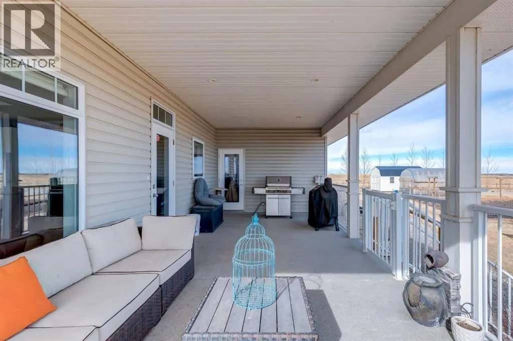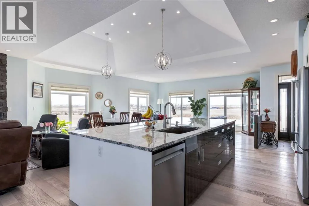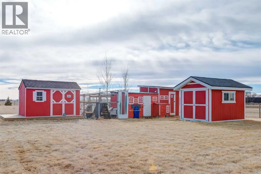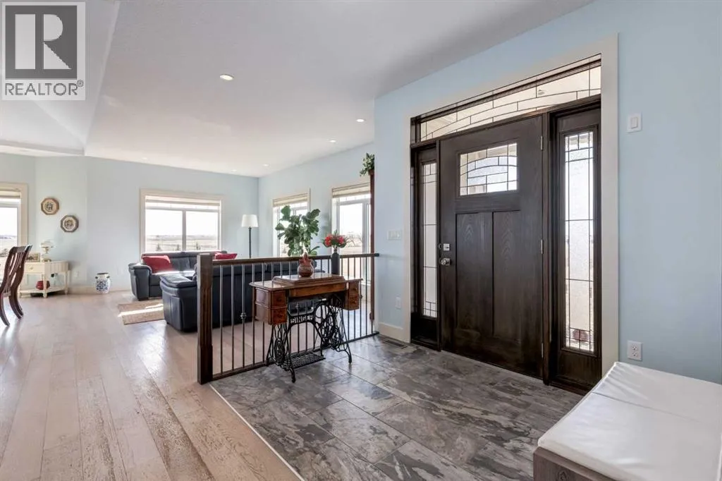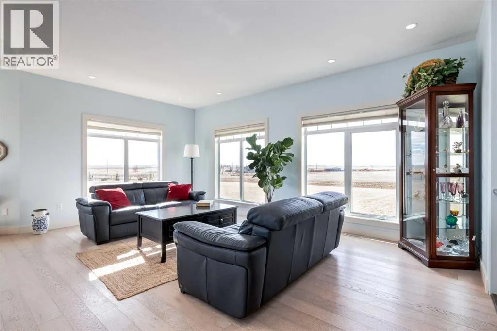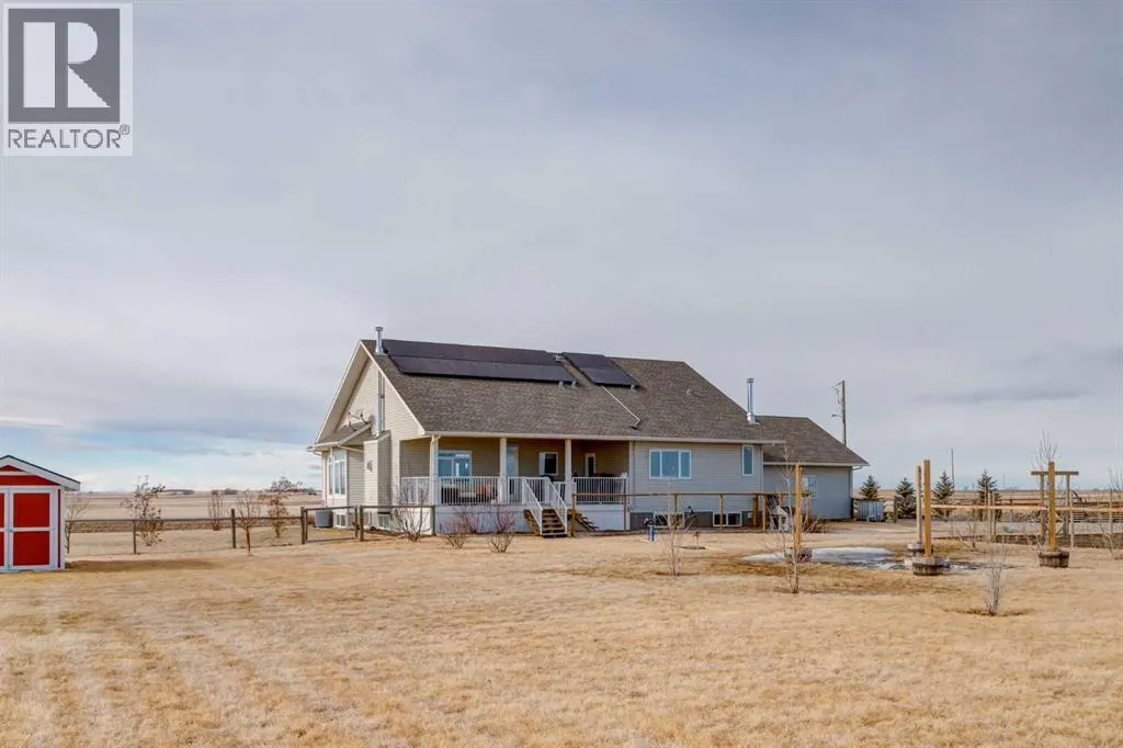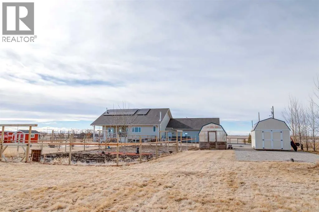 Country Living at its finest with a short 15 minute drive to Strathmore and 45 minutes to Calgary! Situated on 3 acres with serene prairie views, this beautiful home offers 4,051 SF of developed living space with 6 bedrooms and 3 bathrooms, allowing an abundance of space for the growing family. The bright and open main floor features high ceilings, tile and wide-plank hardwood flooring, spacious front living room leading to the Chef's kitchen showcasing stainless steel appliances (stove can be switched between induction or gas very easily), large island with storage accessed from both sides, granite countertops, two toned cabinets with plenty of drawers and easy close slides and a butler's pantry with ample shelving and a sink. The dining area gives access to the deck and the rear family room is the perfect place to gather around the wood burning fireplace on those cold, winter days. The vaulted ceilings over the living, dining and family room with surround windows allow for expansive mountain views and year round enjoyment of beautiful sunrises and sunsets. The Primary bedroom is complete with a 5 piece ensuite, walk in closet and a private access to the covered deck. Two additional guest bedrooms, 4 piece bathroom, mudroom and conveniently located laundry room complete this level. The basement is finished with cozy in-floor heat, an over-sized family room with wood burning stove, 3 generously scaled bedrooms, a 4 piece bathroom and a home office with french door access. Don't overlook the attached TRIPLE garage (with in-floor heat), Reverse Osmosis drinking water tap, central AC for those hot summer days, 24 solar panels with Tesla battery The septic field was expanded in 2021 as well as a second septic field and electric meter installed on the property offering great potential development for a shop or additional living quarters. Storage sheds, greenhouse, a vegetable garden, and 2 chicken coops allow you to enjoy the extra benefits of acreage living! Additiona l highlights include the school bus that stops at the end of the driveway and dust prevention on road. Nothing to do but move in and enjoy...book your showing today! (id:27476)