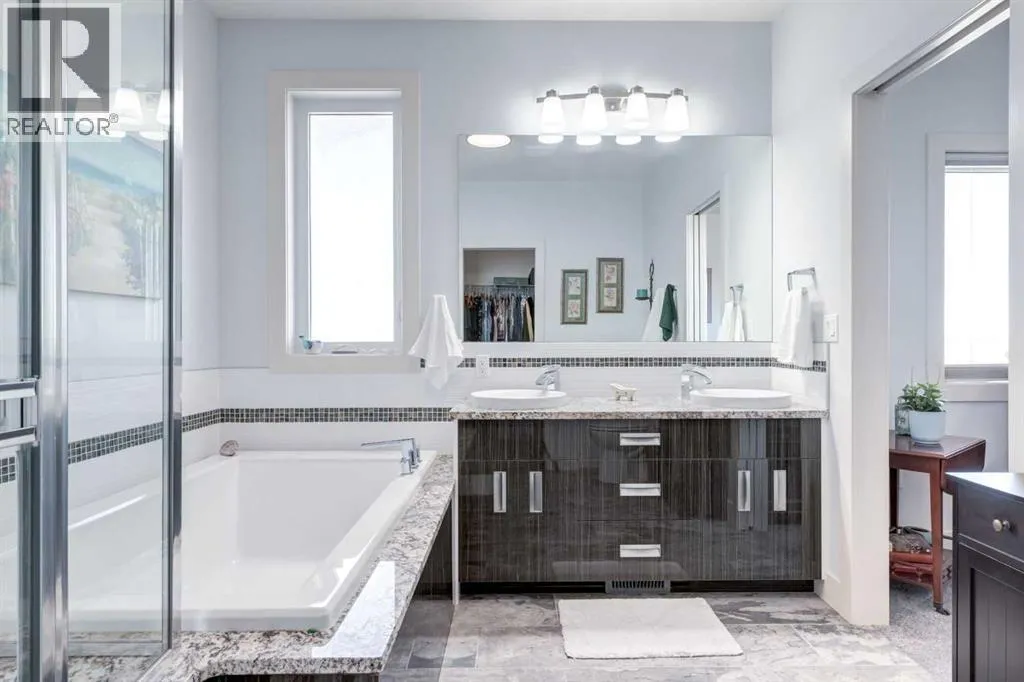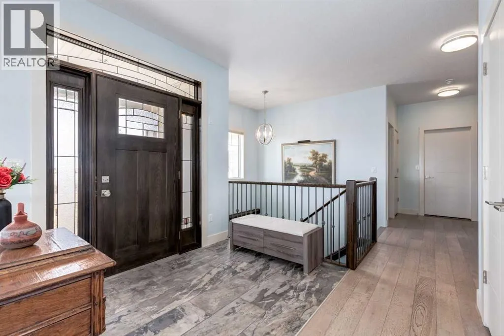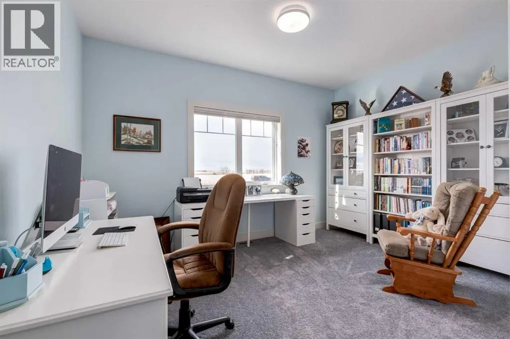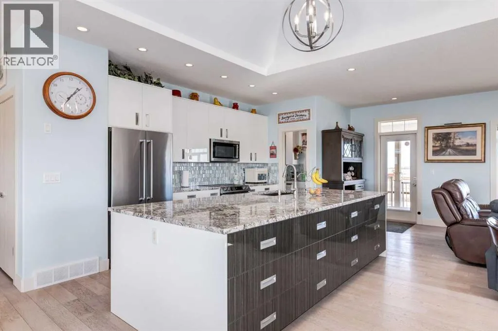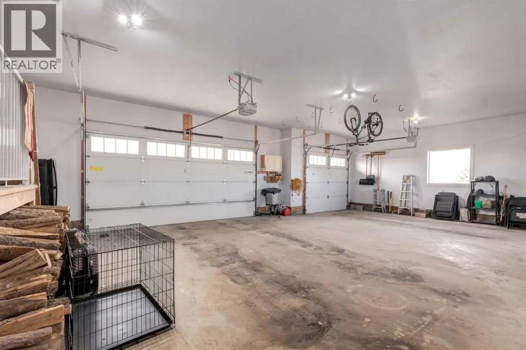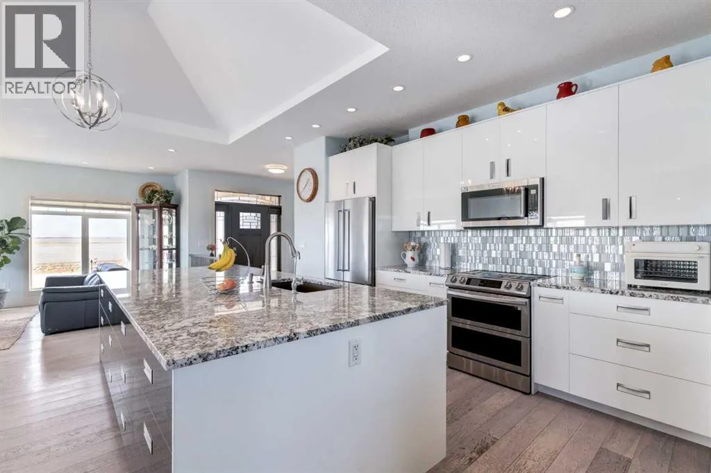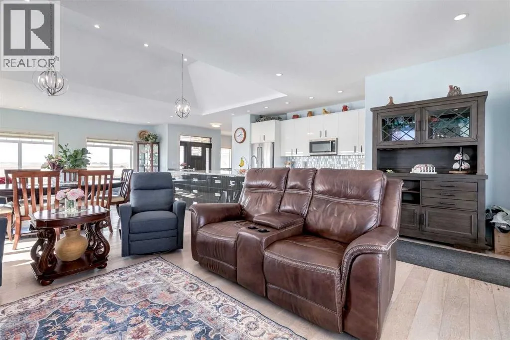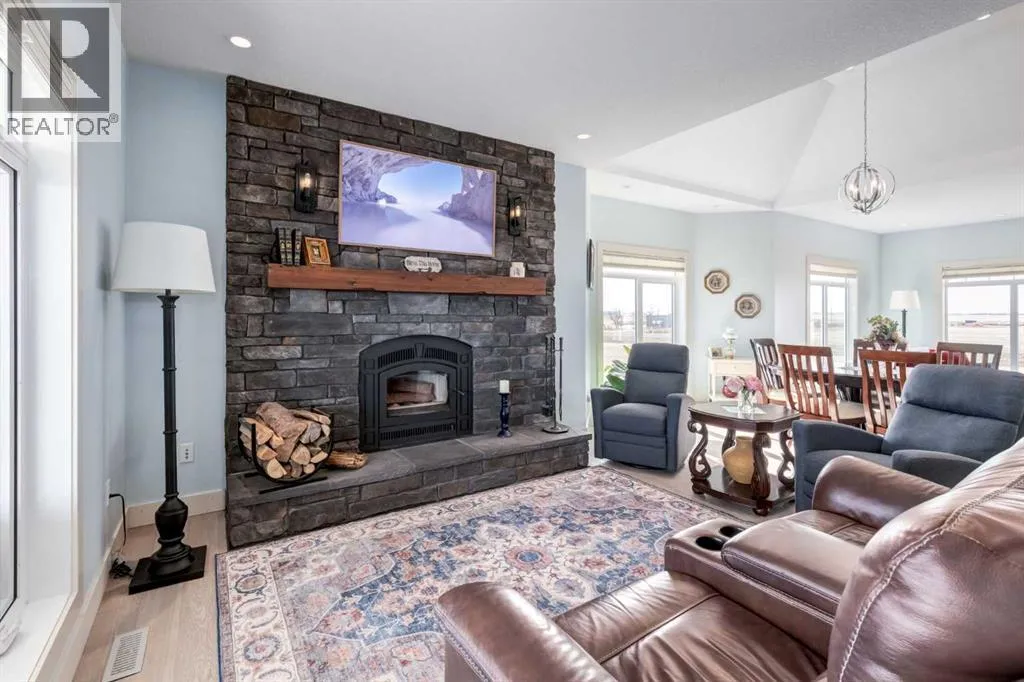 Country Living at its finest with a short 15 minute drive to Strathmore and 45 minutes to Calgary! Situated on 3 acres with serene prairie views, this beautiful home offers 4,051 SF of developed living space with 6 bedrooms and 3 bathrooms, allowing an abundance of space for the growing family. The bright and open main floor features high ceilings, tile and wide-plank hardwood flooring, spacious front living room leading to the Chef's kitchen showcasing stainless steel appliances (stove can be switched between induction or gas very easily), large island with storage accessed from both sides, granite countertops, two toned cabinets with plenty of drawers and easy close slides and a butler's pantry with ample shelving and a sink. The dining area gives access to the deck and the rear family room is the perfect place to gather around the wood burning fireplace on those cold, winter days. The vaulted ceilings over the living, dining and family room with surround windows allow for expansive mountain views and year round enjoyment of beautiful sunrises and sunsets. The Primary bedroom is complete with a 5 piece ensuite, walk in closet and a private access to the covered deck. Two additional guest bedrooms, 4 piece bathroom, mudroom and conveniently located laundry room complete this level. The basement is finished with cozy in-floor heat, an over-sized family room with wood burning stove, 3 generously scaled bedrooms, a 4 piece bathroom and a home office with french door access. Don't overlook the attached TRIPLE garage (with in-floor heat), Reverse Osmosis drinking water tap, central AC for those hot summer days, 24 solar panels with Tesla battery The septic field was expanded in 2021 as well as a second septic field and electric meter installed on the property offering great potential development for a shop or additional living quarters. Storage sheds, greenhouse, a vegetable garden, and 2 chicken coops allow you to enjoy the extra benefits of acreage living! Additiona l highlights include the school bus that stops at the end of the driveway and dust prevention on road. Nothing to do but move in and enjoy...book your showing today! (id:27476)