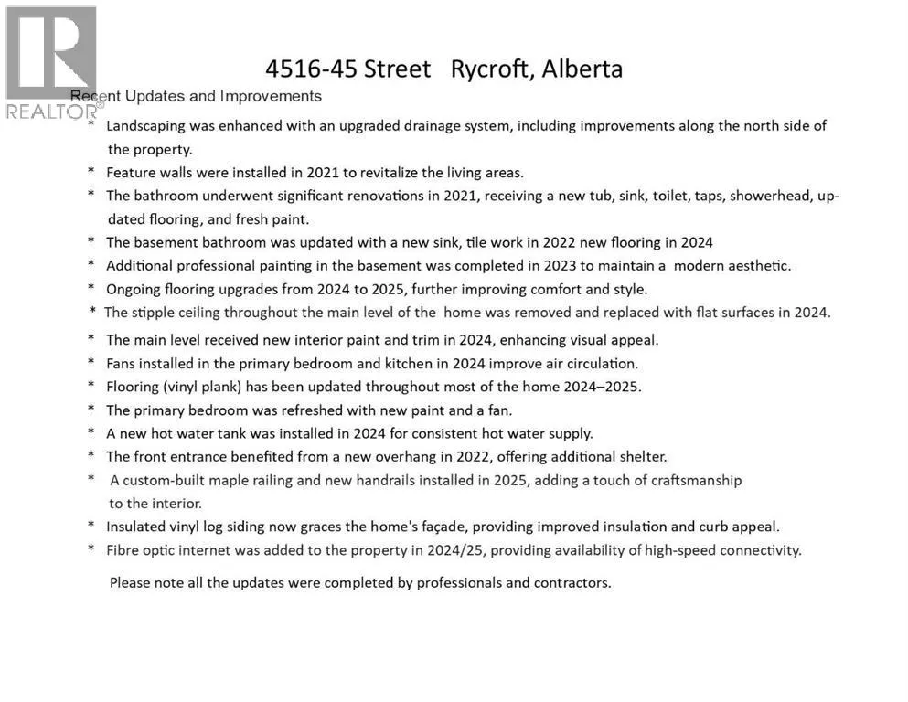 Presenting a maintained bi-level residence in Rycroft, Alberta. Enter through a covered entrance designed to protect you and your family from inclement weather. Upon arrival, the tranquil atmosphere of the home provides immediate relaxation. The main floor offers a welcoming living room, a functional kitchen with dedicated dining space and patio doors leading to a covered deck, a full bathroom, a primary bedroom, and a secondary bedroom.The lower level is thoughtfully arranged for both comfort and practicality, featuring a large family room accentuated by a woodstoveâideal for gatherings during cooler Alberta evenings. Additional amenities include a utility room, ample storage, and a half bath, facilitating everyday convenience. Versatile spaces are suitable for both private relaxation and hosting guests, all unified by the home's serene ambiance. The fenced backyard includes a back patio, perfect for unwinding, while substantial onsite parking accommodates visitors with ease.This property enjoys convenient access to Highway 2, supporting straight forward commutes to Grande Prairie, Fairview, Donnelly, Spirit River, or Dawson Creek.While modest in size, this residence is highly functional and comprehensively appointed, making it well suited for first-time buyers, families, or those preparing for retirement. This opportunity warrants consideration. Reach out to your favorite realtor for your private viewing today! A list of improvements can be viewed under the photo section.Disclosure: Seller is a licensed Realtor® in the province of Alberta with Grassroots Realty Group Ltd. (id:27476)