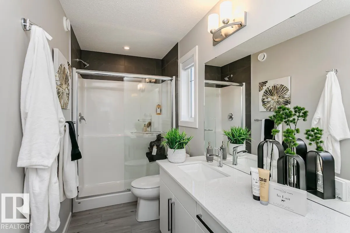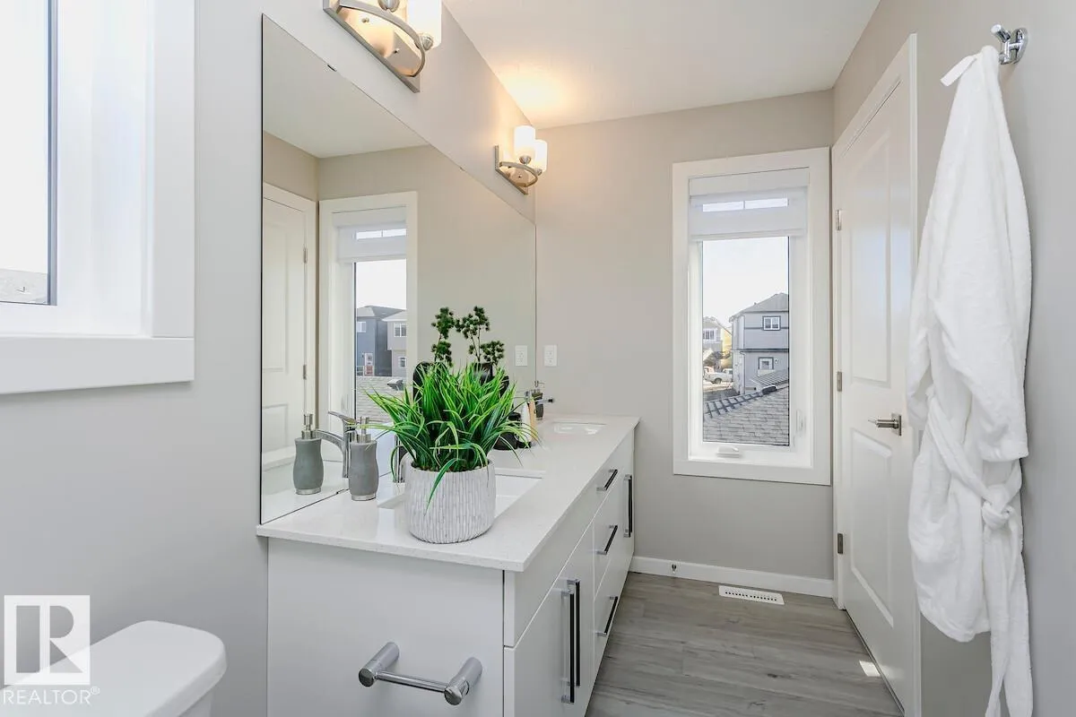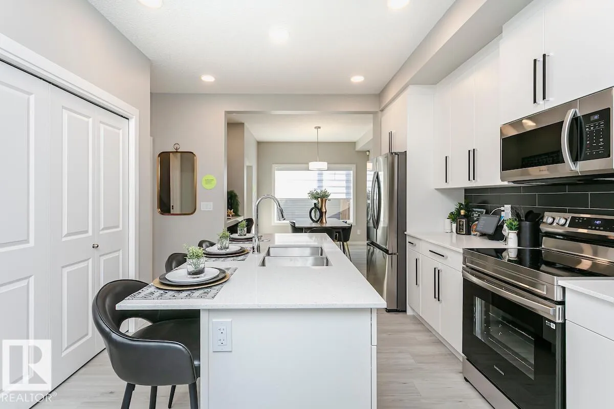 Open-Concept Main Floor: Enjoy a spacious kitchen with a large island, double-door pantry, and extended 41 upper cabinets. Seamless flow to the dinette and great room, ideal for family time or entertainment. Plus, a true rear mudroom adds everyday convenience. *Modern Finishes Throughout: Luxury Vinyl Plank flooring on the main floor and all bathrooms, quartz countertops, under-mount sinks, and soft-close cabinets and drawers for a stylish, low-maintenance lifestyle. *Comfortable Upper Level: Large primary bedroom with walk-in closet and ensuite featuring dual sinks and a walk-in shower. Two more bedrooms, a full bath, and upstairs laundry complete the upper floor. *Energy-Efficient Design: Double-pane, Low-E, argon-filled Energy Star windows, 95% high-efficiency furnace, heat recovery ventilator, and 80-gallon hot water Smart Home Features: Includes Echo Show, Lorex Smart Video Doorbell, Ecobee 3 Lite Thermostat, Weiser Smart Deadbolt, Alexa HD smart display with motion detection. Photos representative (id:27476)