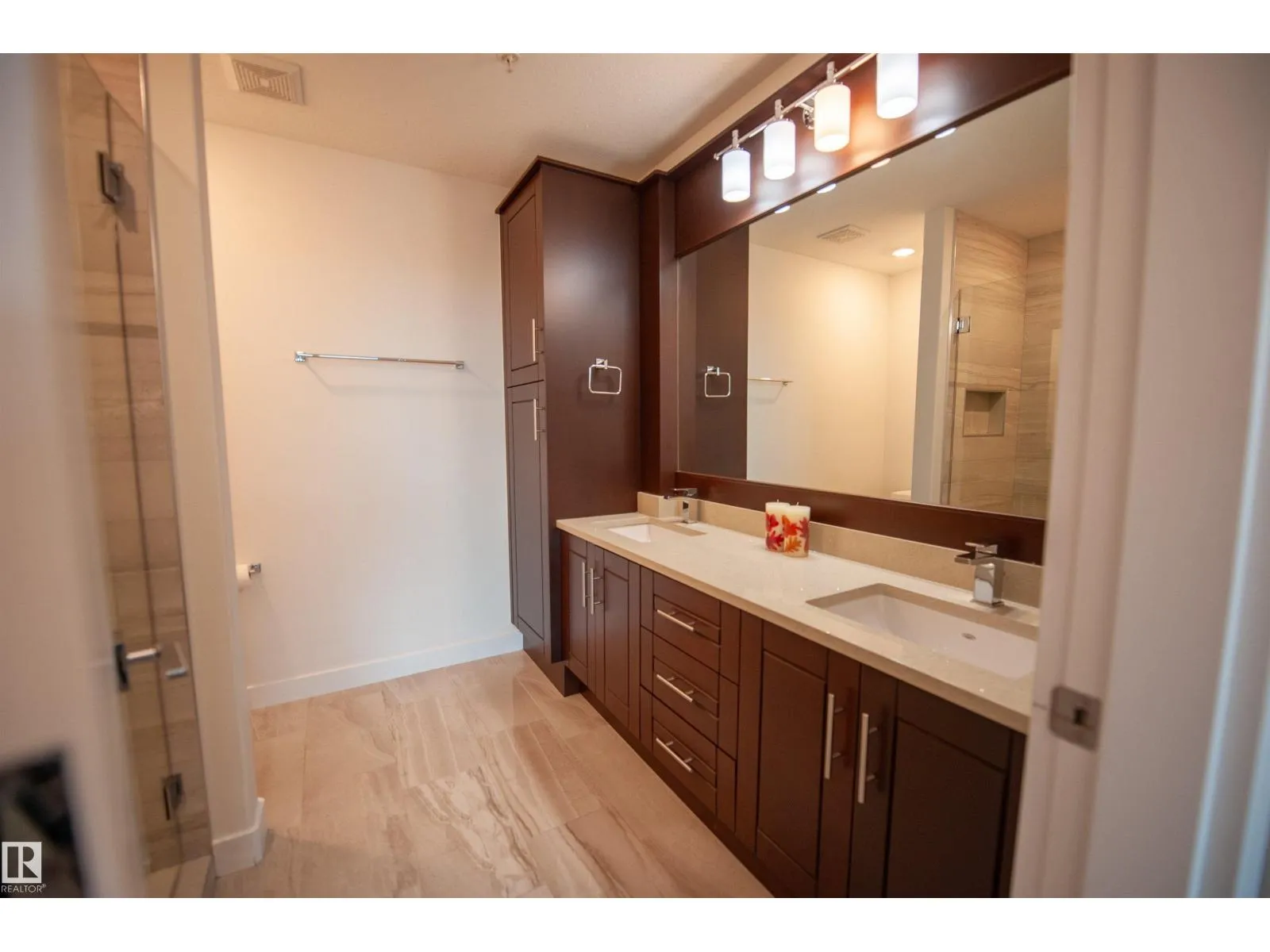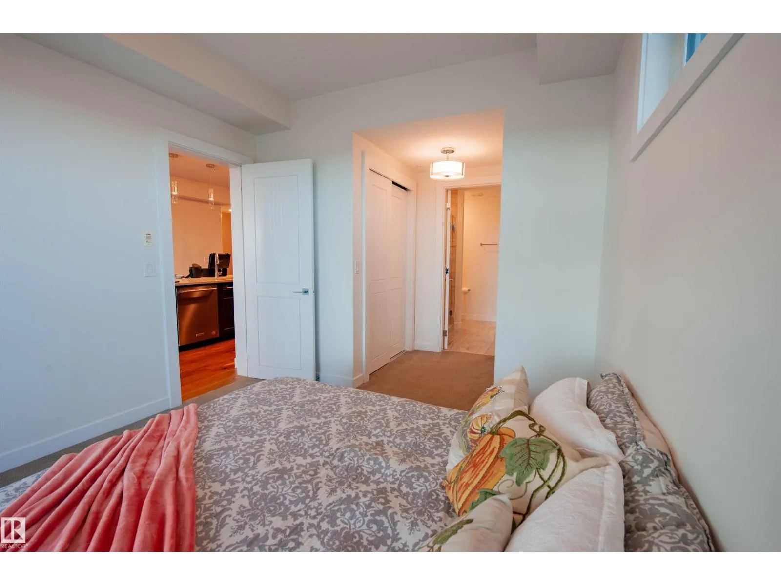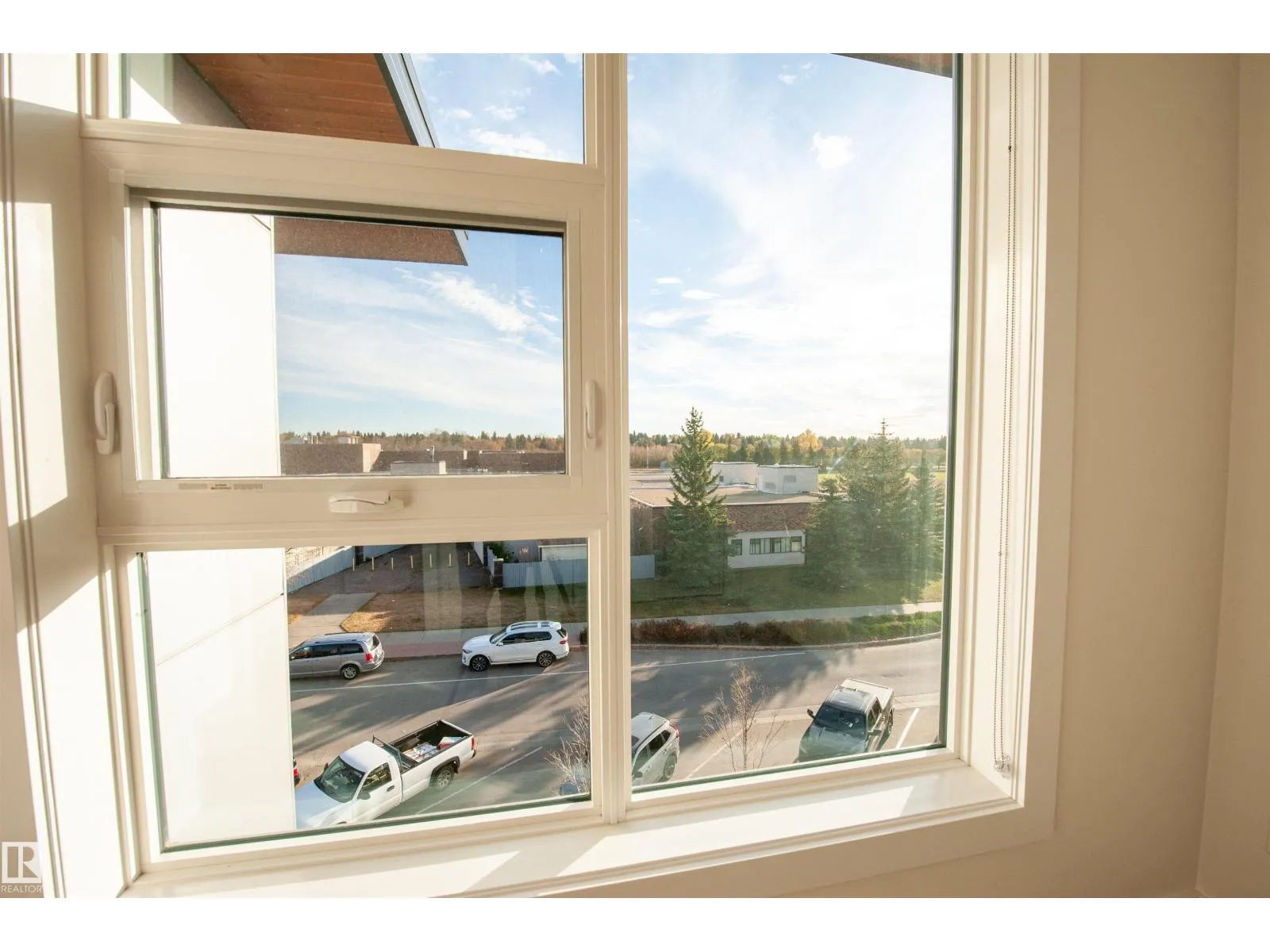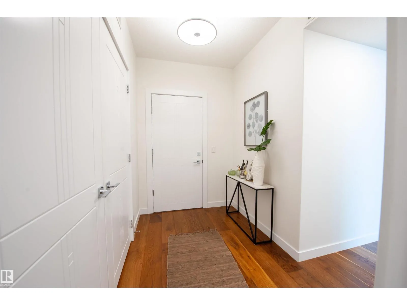 Live the Good Life in Centre in the Park! Set in an elegant, modern building surrounded by shops, cafés, and greenspace, this Top Floor 2-bedroom, 2-bath Corner Unit offers over 1,000 sq. ft. of contemporary comfort and style. Built with luxury materials and unmatched craftsmanship, this residence stands apart from anything else in Sherwood Park. The open floor plan features a sleek kitchen with quartz counters, stainless steel appliances, and rich cabinetry flowing into a spacious living area with hardwood-tone floors and large windows. Step onto the covered balcony for peaceful, tree-lined views. The primary suite includes a private 4-piece ensuite and generous closet space, while the second bedroom and full bath add flexibility. HUGE BONUS: Also includes 2 SEPARATELY TITLED HEATED UNDERGROUND PARKING STALLS, and a Secure Storage unit! Plus access to premium amenities â a Fitness Centre with patio, CAR WASH, and Rooftop Terrace. Visit REALTOR® website for more info. *Some photos are virtually staged* (id:27476)