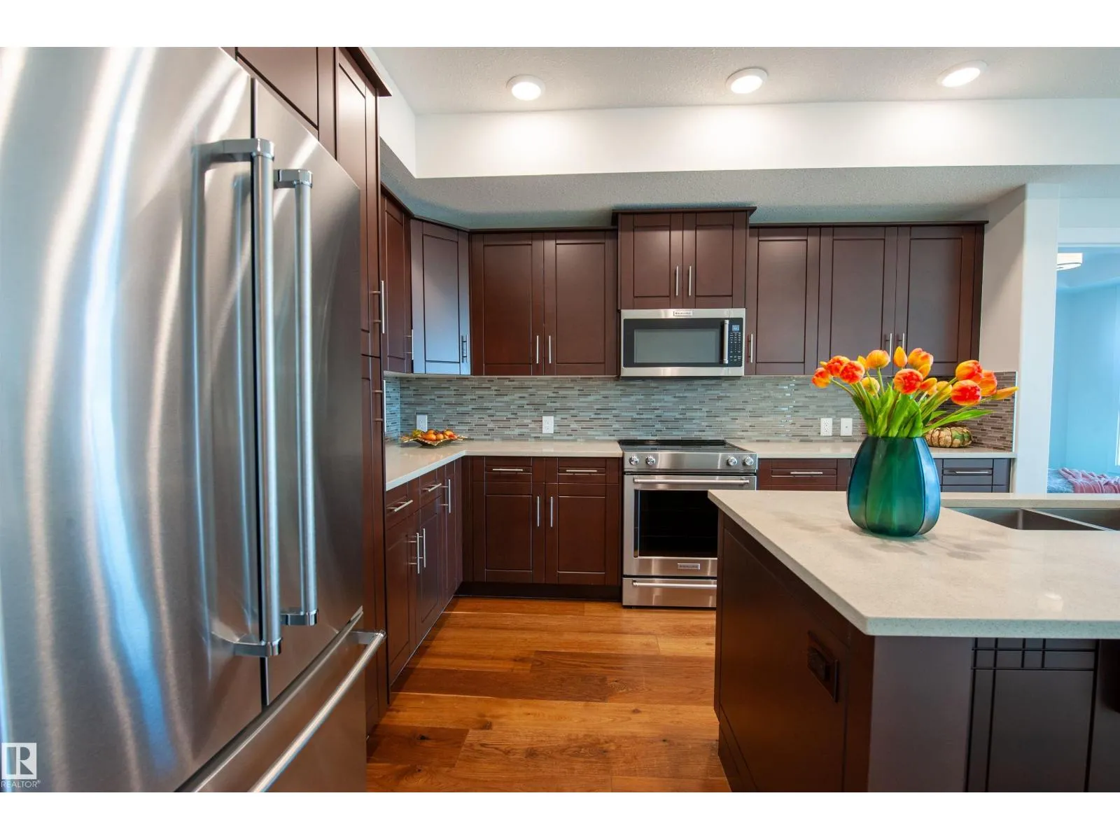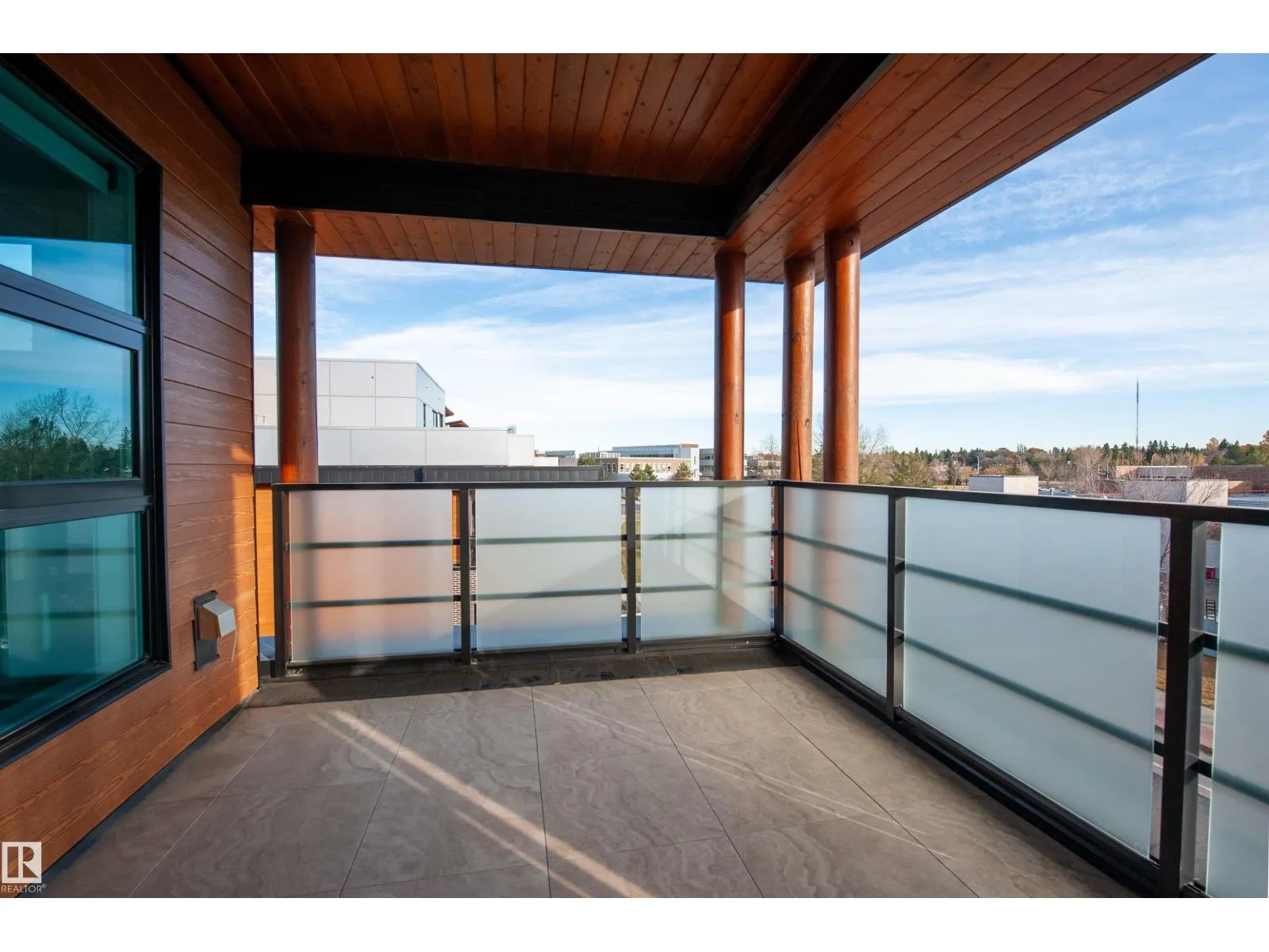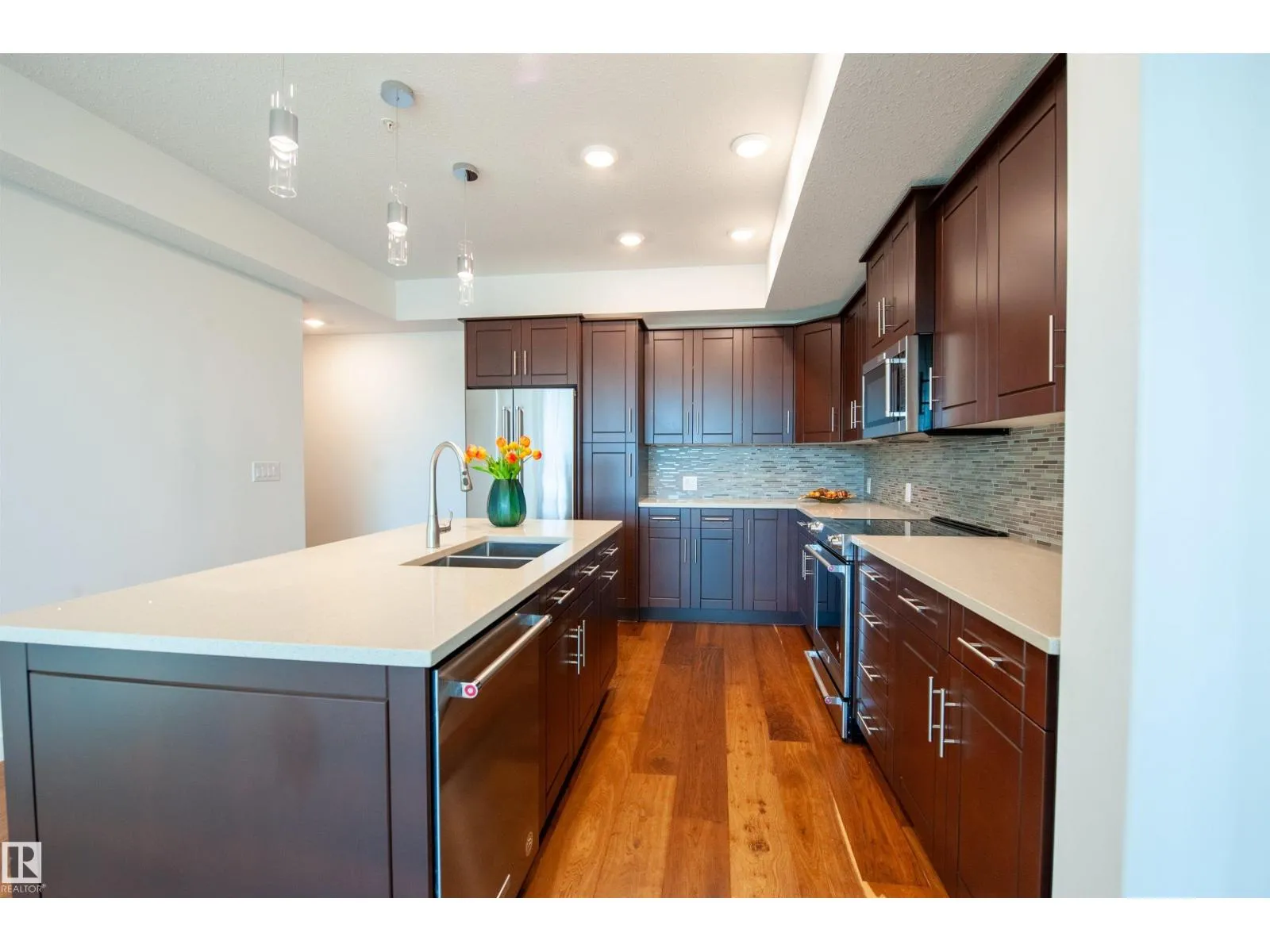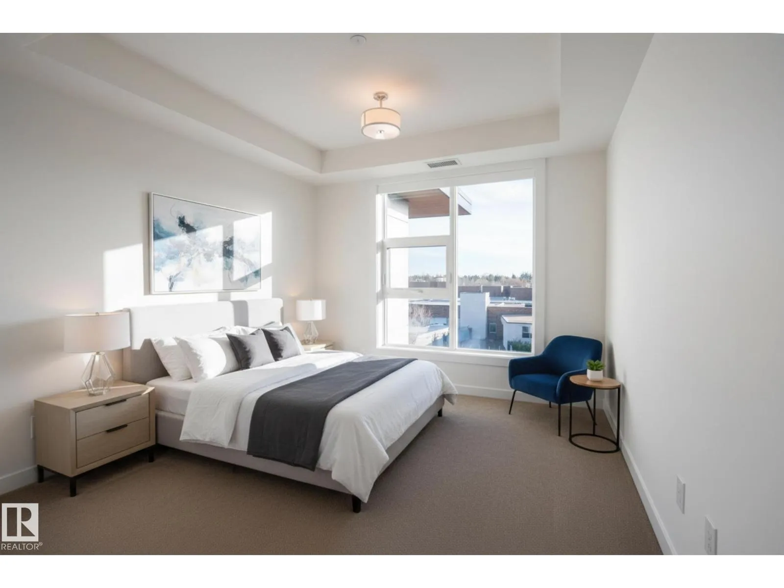 Live the Good Life in Centre in the Park! Set in an elegant, modern building surrounded by shops, cafés, and greenspace, this Top Floor 2-bedroom, 2-bath Corner Unit offers over 1,000 sq. ft. of contemporary comfort and style. Built with luxury materials and unmatched craftsmanship, this residence stands apart from anything else in Sherwood Park. The open floor plan features a sleek kitchen with quartz counters, stainless steel appliances, and rich cabinetry flowing into a spacious living area with hardwood-tone floors and large windows. Step onto the covered balcony for peaceful, tree-lined views. The primary suite includes a private 4-piece ensuite and generous closet space, while the second bedroom and full bath add flexibility. HUGE BONUS: Also includes 2 SEPARATELY TITLED HEATED UNDERGROUND PARKING STALLS, and a Secure Storage unit! Plus access to premium amenities â a Fitness Centre with patio, CAR WASH, and Rooftop Terrace. Visit REALTOR® website for more info. *Some photos are virtually staged* (id:27476)