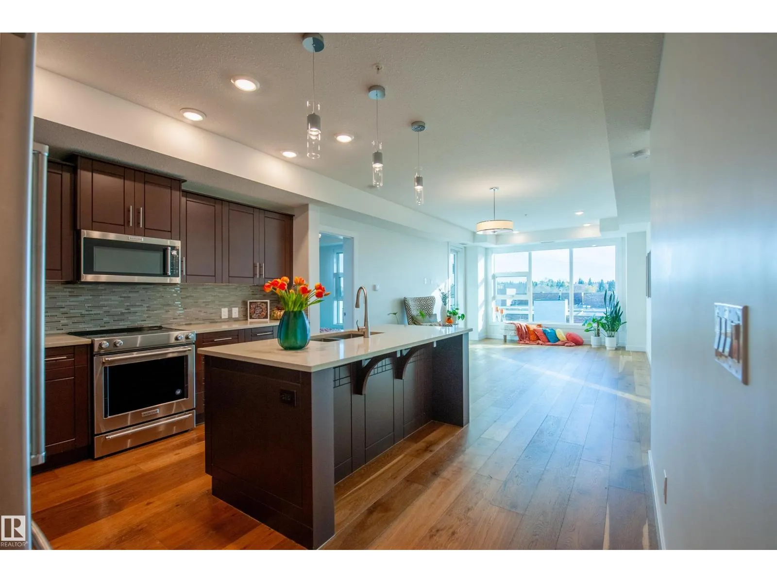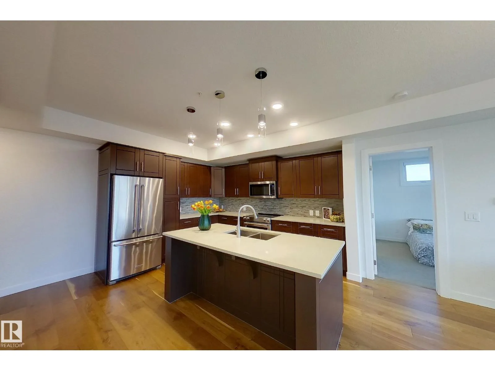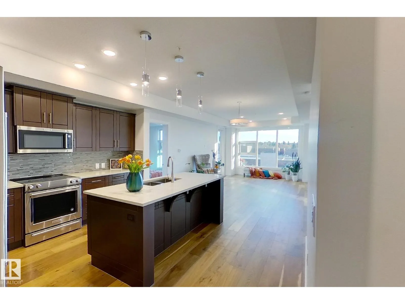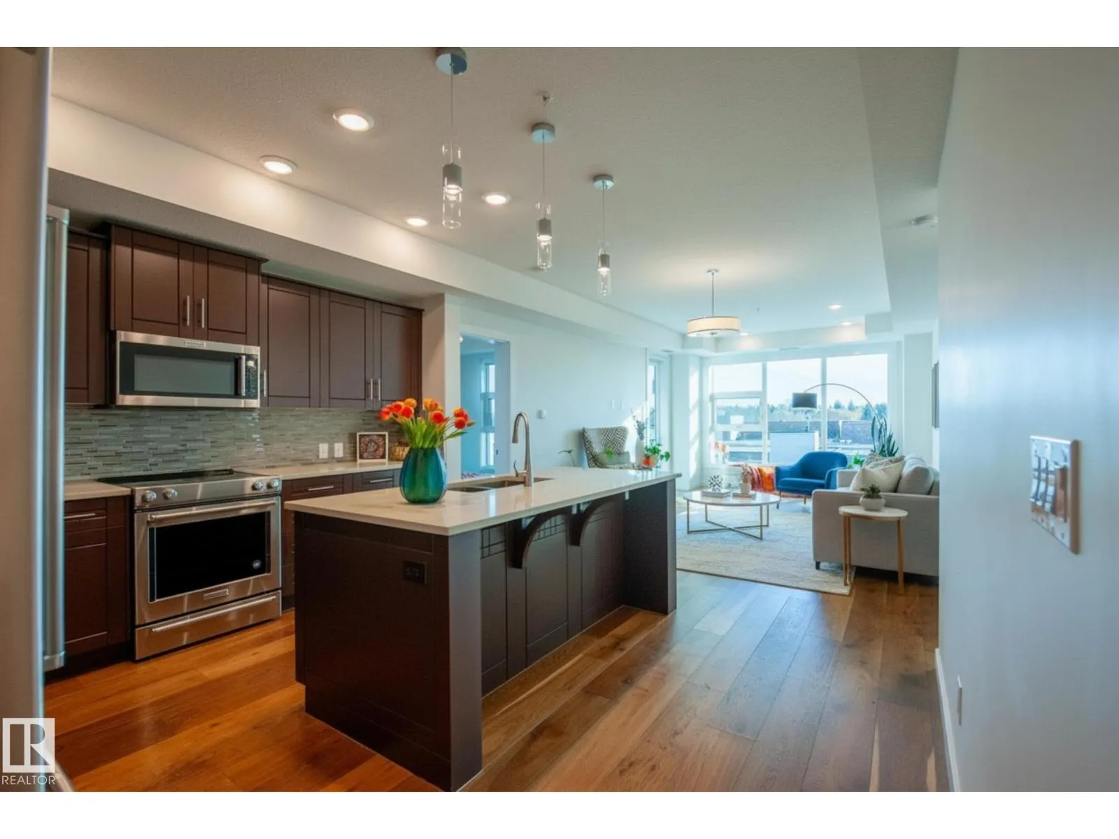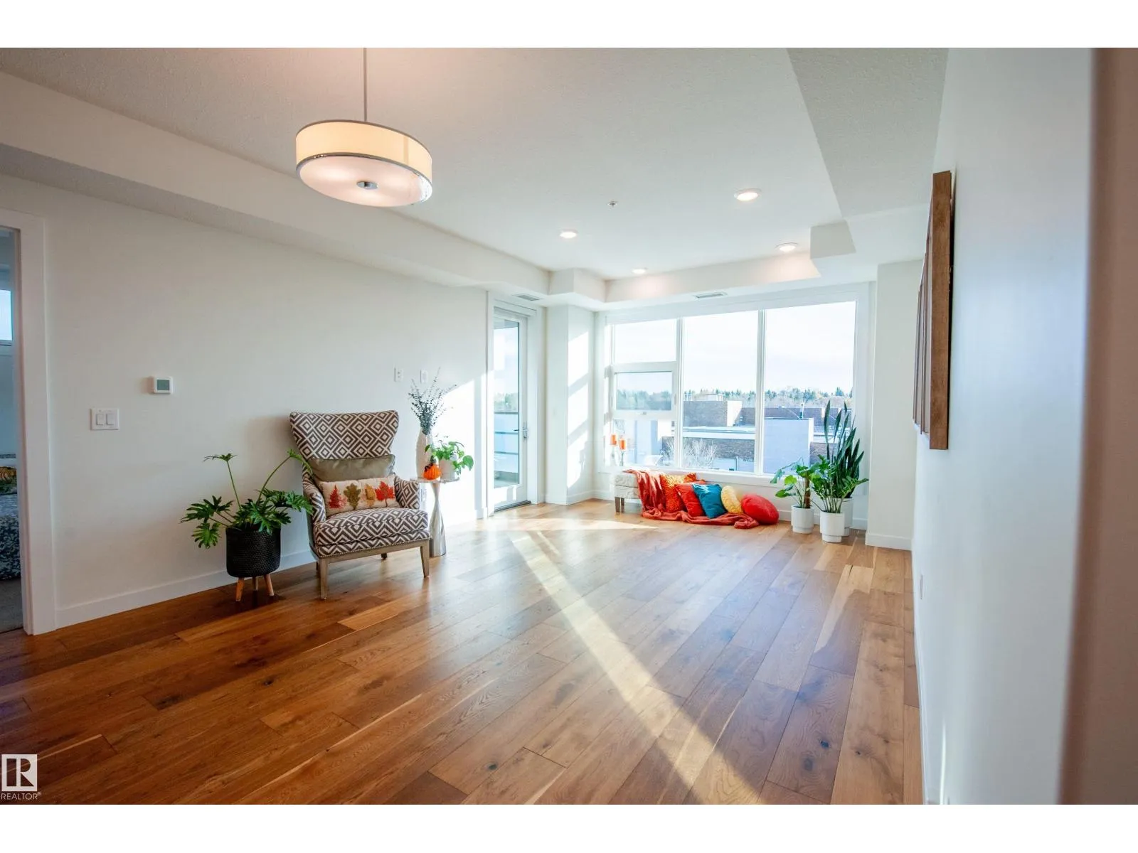 Live the Good Life in Centre in the Park! Set in an elegant, modern building surrounded by shops, cafés, and greenspace, this Top Floor 2-bedroom, 2-bath Corner Unit offers over 1,000 sq. ft. of contemporary comfort and style. Built with luxury materials and unmatched craftsmanship, this residence stands apart from anything else in Sherwood Park. The open floor plan features a sleek kitchen with quartz counters, stainless steel appliances, and rich cabinetry flowing into a spacious living area with hardwood-tone floors and large windows. Step onto the covered balcony for peaceful, tree-lined views. The primary suite includes a private 4-piece ensuite and generous closet space, while the second bedroom and full bath add flexibility. HUGE BONUS: Also includes 2 SEPARATELY TITLED HEATED UNDERGROUND PARKING STALLS, and a Secure Storage unit! Plus access to premium amenities â a Fitness Centre with patio, CAR WASH, and Rooftop Terrace. Visit REALTOR® website for more info. *Some photos are virtually staged* (id:27476)