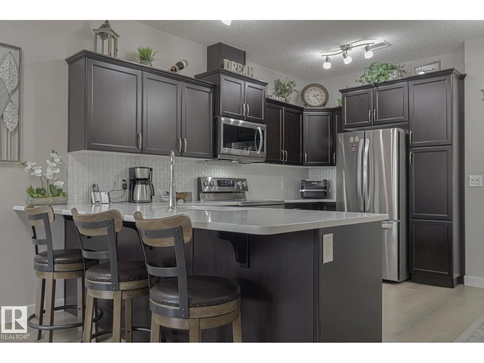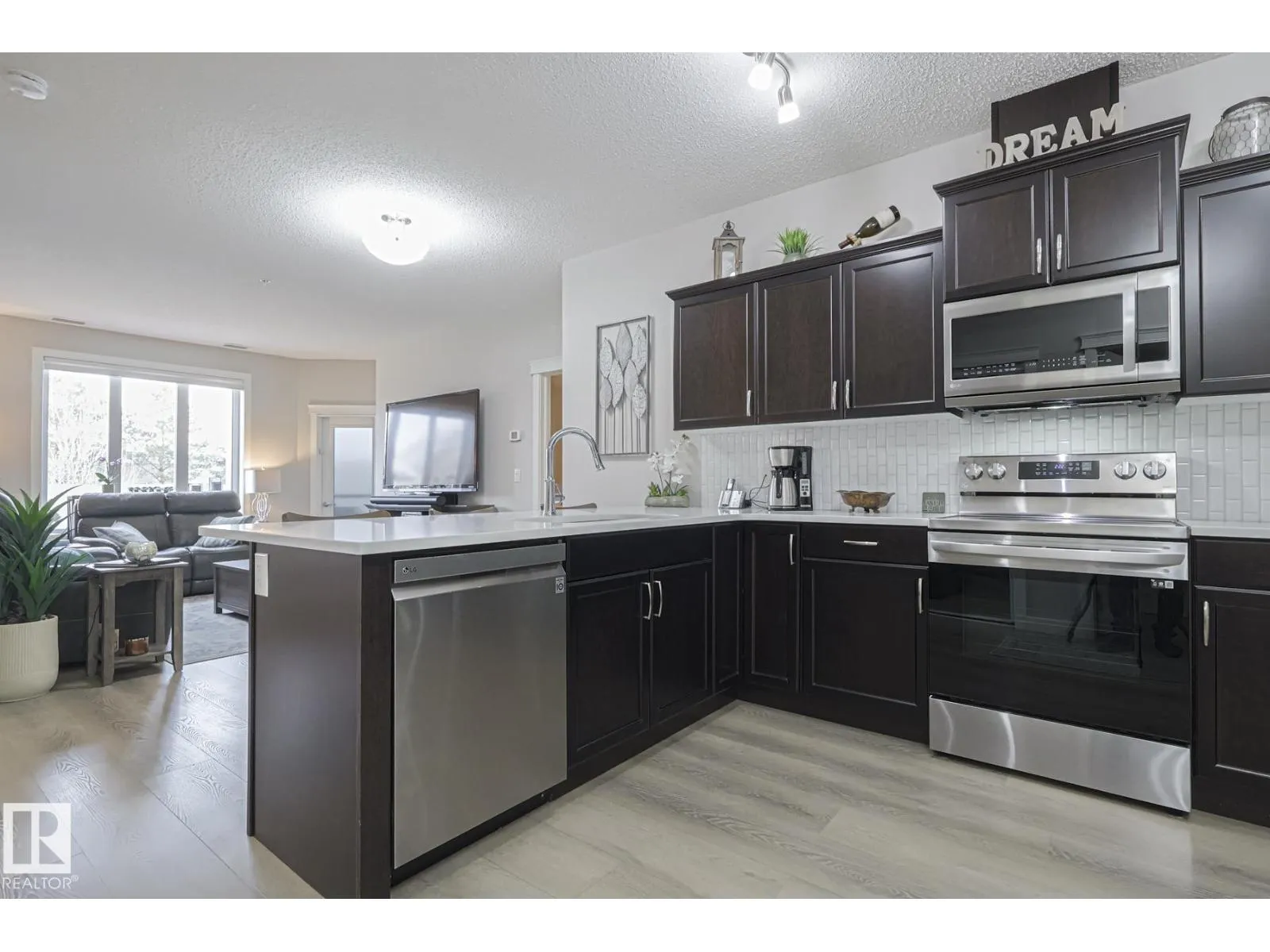 Element Lofts & Flats! Elegance abounds in this renovated, immaculate condominium! Offering a bright & open floorplan with peninsula kitchen, living room, primary bedroom with ensuite & walk-in closet, & bedroom #2 (conveniently located next to the main bath). In-suite laundry & storage; 2 titled parking stalls (1 underground stall w/storage cage, 1 surface stall). Renovations within the last 3 years include: luxury vinyl plank throughout, kitchen with matte walnut cabinets (refinished), quartz counters, backsplash & stainless steel appliances (3 yrs old). Bathroom updates include a glass shower door in the ensuite, quartz vanity tops w/undermount basins, new toilets & upgraded lighting. In-suite laundry offers plenty of space and includes a quartz countertop, front load washing machine (1 year old), and dryer. Phantom screen and A BRAND NEW RETRACTABLE POWER SCREEN SYSTEM on balcony, offering privacy, sun & wind protection - a $12,000.00 upgrade. Pet friendly, no age restriction, no smoking, walkable! (id:27476)