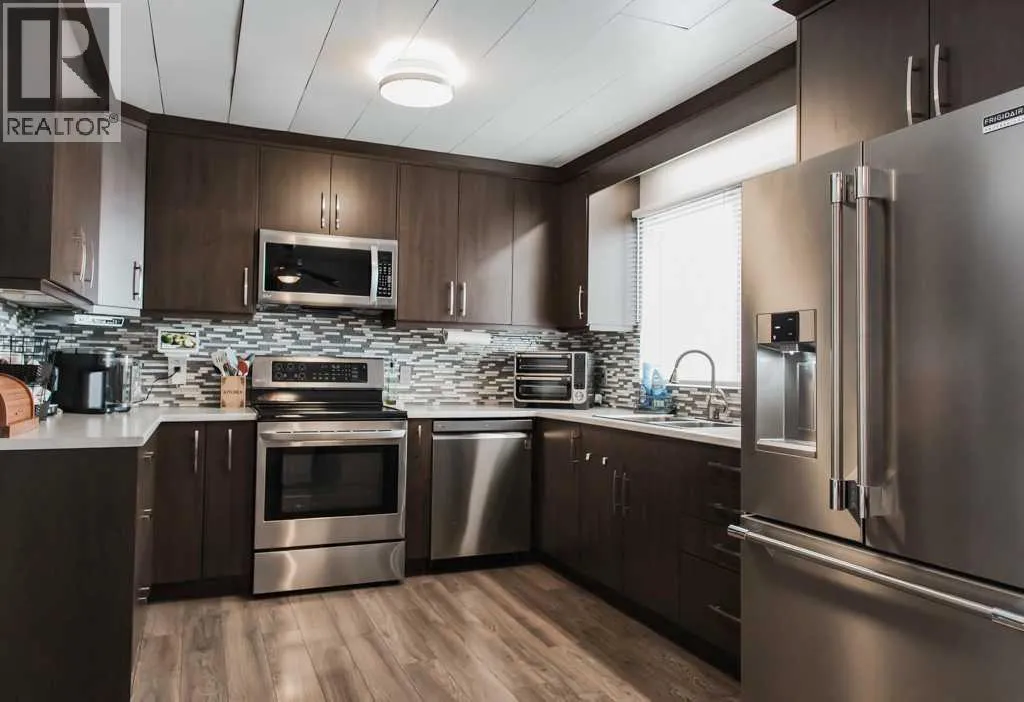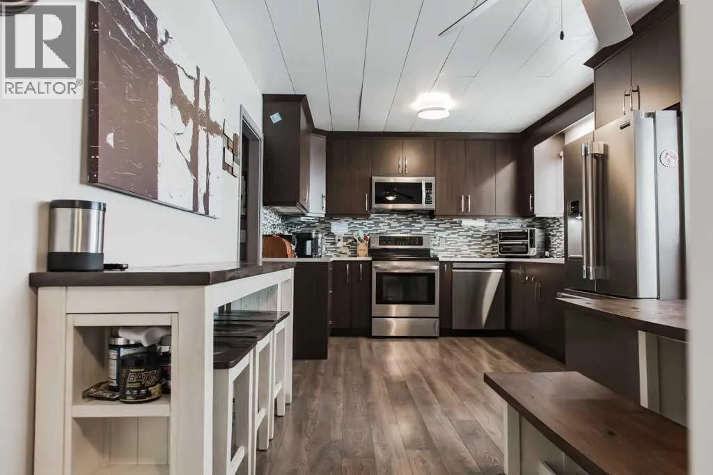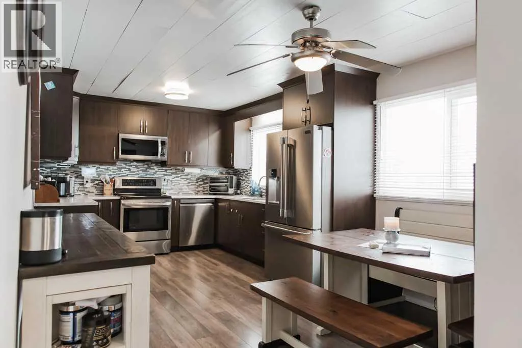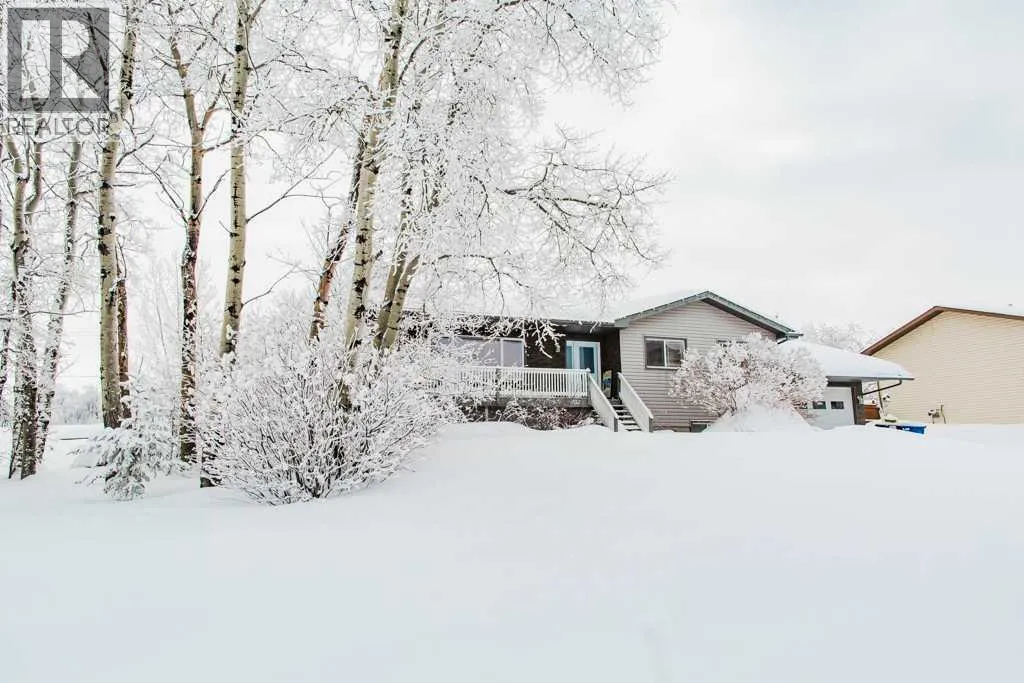 Updated 4-bedroom, 2-bath home in Spirit River featuring both an attached garage and a bonus heated 20âx32â detached double garage with back alley access. This beautiful property sits on a large, treed lot tucked away at the back of town and perched on a rise, offering peaceful surroundings and scenic views of the Peace River Valley. Over the years, the home has seen numerous updates including a modern kitchen with soft-close cabinets and drawers, new flooring in 2020, and shingles, siding, and windows completed approximately 10 years ago, with more recent improvements such as a basement bathroom and hot water tank in 2021 and central air conditioning added in 2024. The main floor offers a spacious layout with three bedrooms, a large bathroom featuring double sinks and direct access from the primary bedroom, convenient main-floor laundry, a bright oversized living room with a large front window, and the updated kitchen ideal for family living or entertaining. The fully finished basement includes a large rec room, an extra-large bedroom with a walk-in closet, an updated bathroom with a custom tile shower, a storage room, and a pellet stove that provides efficient backup heat for northern Alberta winters. The attached garage is 16â x 29â and insulated, complemented by a large front driveway, while the impressive 32â x 20â heated detached double garage offers additional parking, storage, or workshop space. The oversized treed lot features a concrete patio, a gas line for a BBQ, and the privacy of having only one direct neighbour, and to top it off, high-speed fibre optic internet makes this home an excellent option for remote work or home-based businesses. (id:27476)