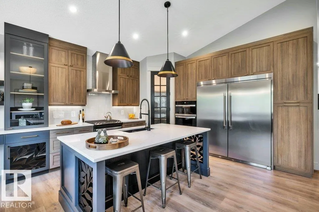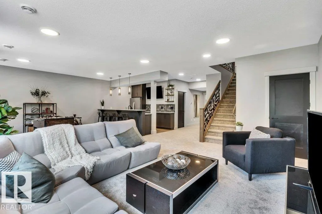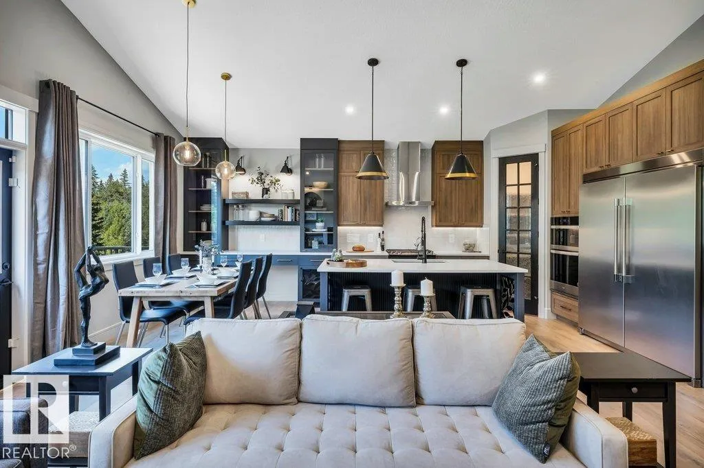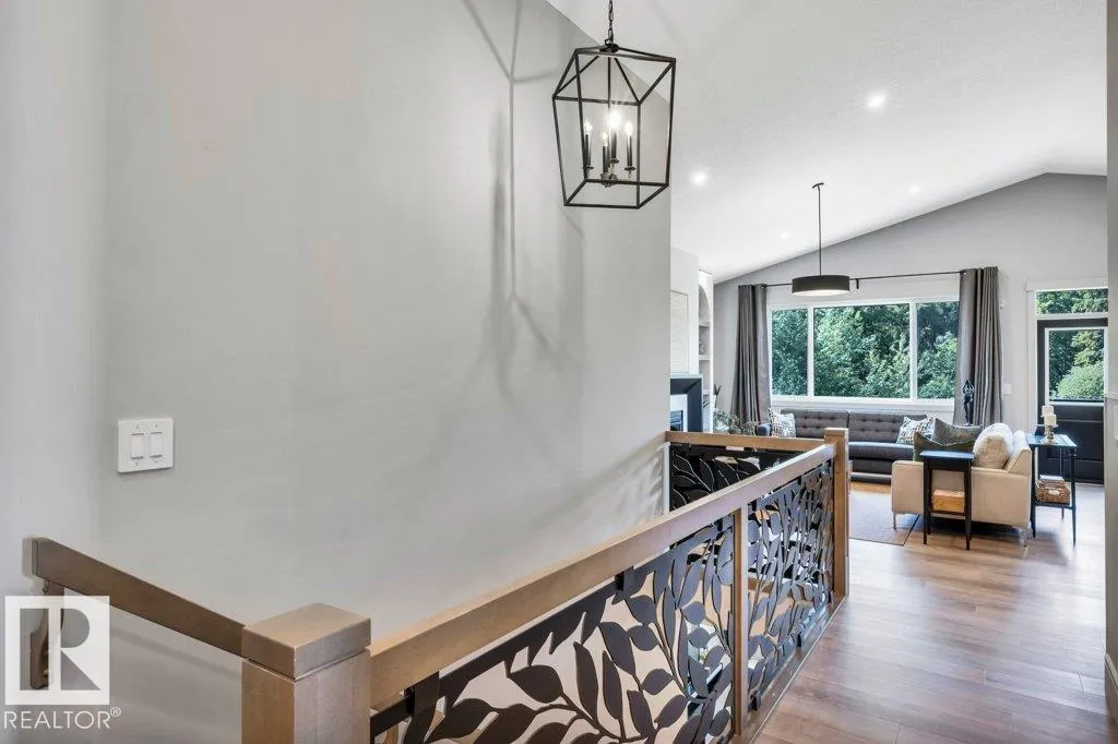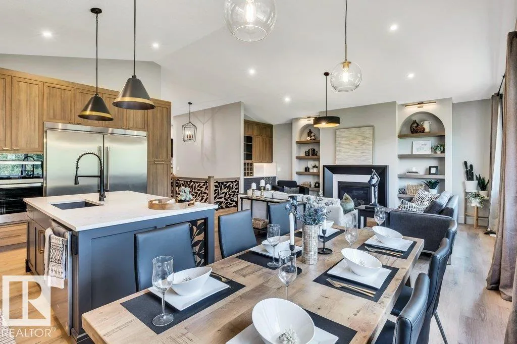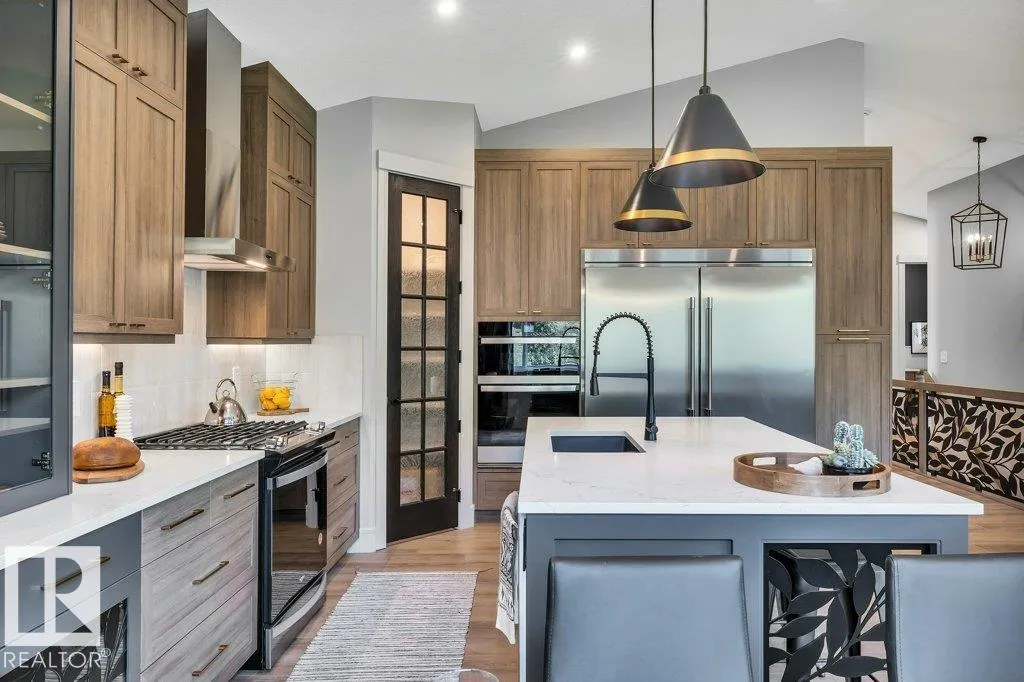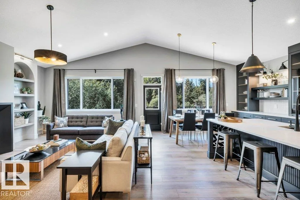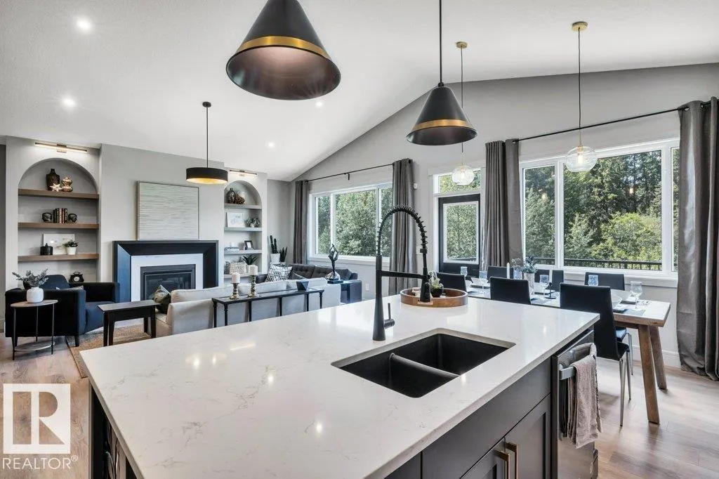 Luxury awaits in this stunning bungalow built by Homexx Corporation. The Goldstone floor plan welcomes you with a grand entryway, vaulted ceilings, and an open-concept layout ideal for entertaining. The chef-inspired kitchen overlooks the spacious living area with custom built-ins, a dry bar, and a cozy gas fireplace. The primary suite offers a large walk-through closet and a spa-like five-piece ensuite with soaker tub and separate shower. Completing the main floor are a convenient laundry room with extra shelving and a stylish two-piece bath. A beautiful staircase leads to the lower level, featuring a large family room with wet bar, two bedrooms, a four-piece bath, and ample storage. Enjoy the private backyard setting backing onto trees with a large deck, perfect for relaxing or entertaining. Additional features include a triple-car garage, 200 amp service, custom milled interior finish, quartz countertops, custom cabinetry, and designer lightingâall showcasing the craftsmanship Homexx is known for. (id:27476)