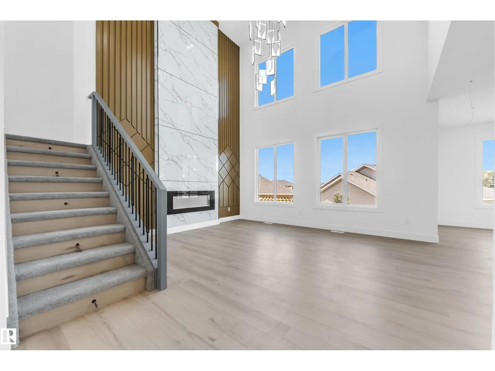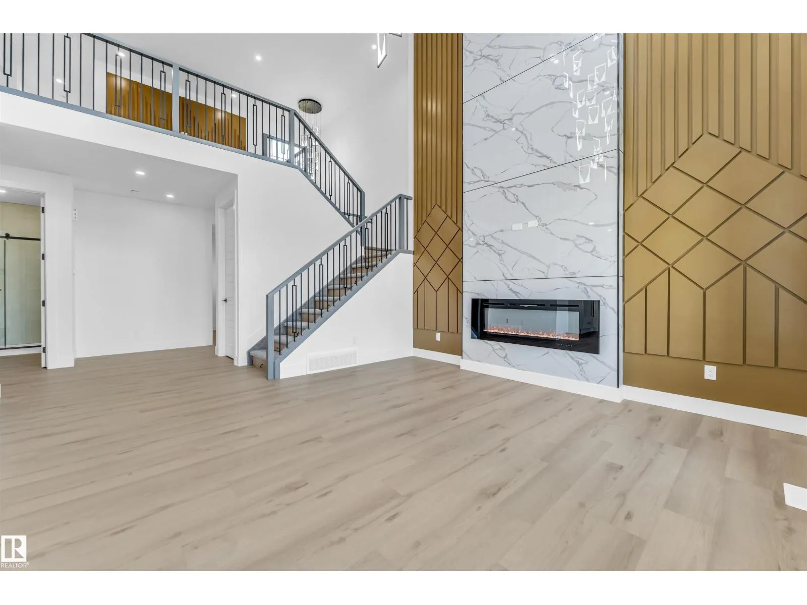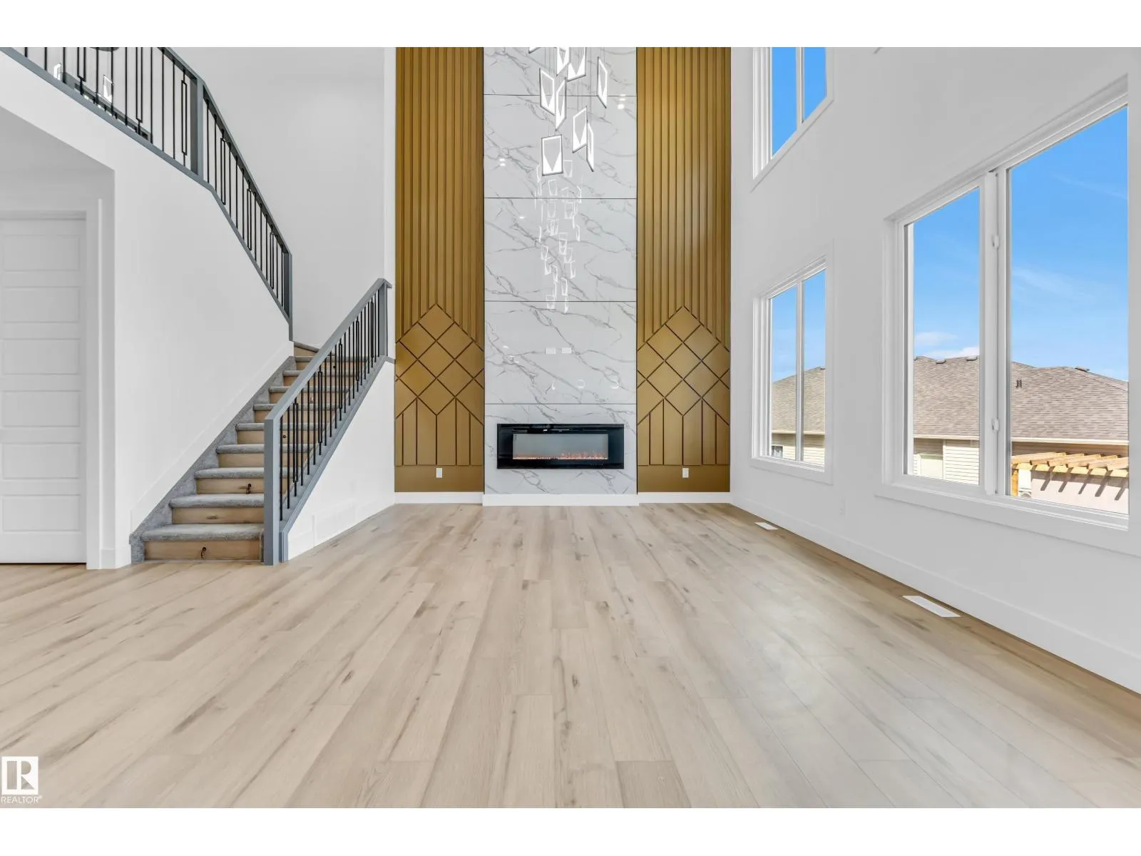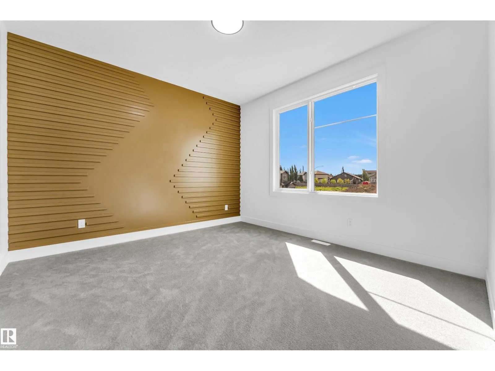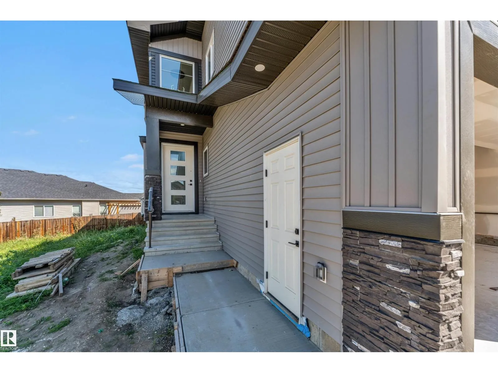 Welcome to this beautifully designed home in Hilldowns, Spruce Grove, featuring a triple-car garage, 5 bedrooms, and 3 full bathrooms, spanning 2,591 sq ft. The main floor offers an open-to-below living room with an electric fireplace, a modern kitchen with a walk-in pantry, a dining area, a main floor den/bedroom, and a full washroom. A spacious mudroom off the garage adds everyday convenience. Upstairs, you'll find 4 large bedrooms. The luxurious Master Bedroom includes a massive walk-in closet and a 5-piece ensuite with a freestanding tub, double vanity, and glass shower. A bonus room, laundry, and another full bathroom complete the upper level. The unfinished basement with a separate side entrance offers great potential for a future suite or rental. (id:27476)