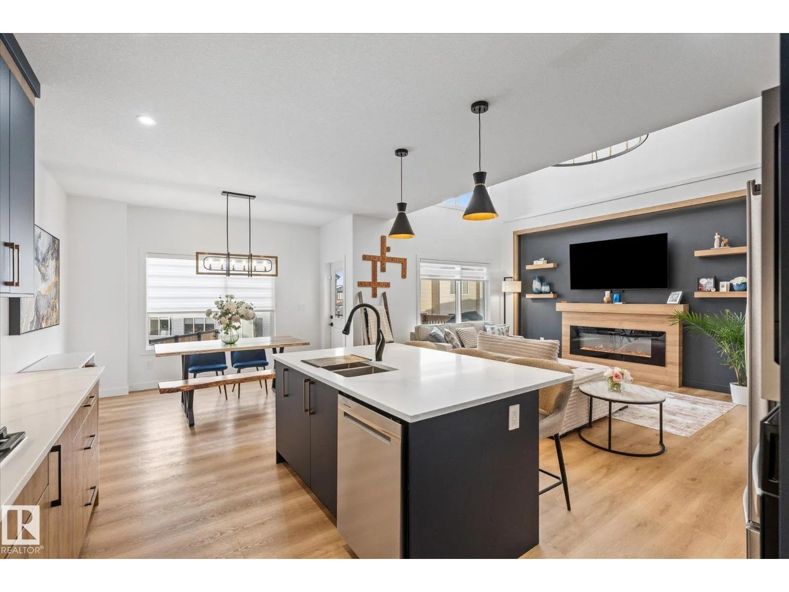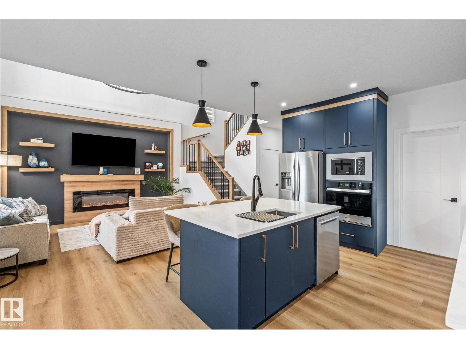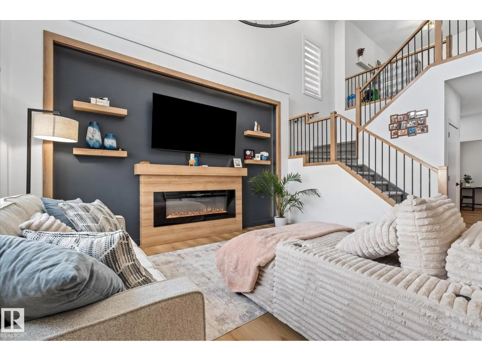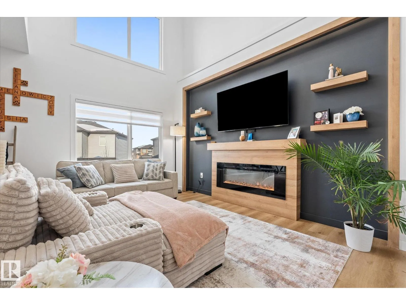 Located in the community of Tonewood, this impressive two storey home offers almost 2,300 sq. ft. of air conditioned living space designed for modern family life. The main floor features vinyl plank flooring, a versatile bedroom or office, and a show stopping open living area with soaring ceilings and a gas fireplace. The sleek kitchen shines with quartz countertops, full height cabinetry, stainless steel appliances, a large island, and a walk through pantry flowing seamlessly into a sun filled dining space. Upstairs, the primary retreat boasts a five piece ensuite and a giant walk in closet with custom, high end organizers, while two additional bedrooms each offer generously sized closets with incredible built in organizers. A full bath, upper floor laundry, and a spacious bonus room complete the level. The unfinished basement provides future development potential, while the fully fenced and landscaped backyard with deck, triple pane windows throughout, and a gas BBQ hookup make this move in ready. (id:27476)