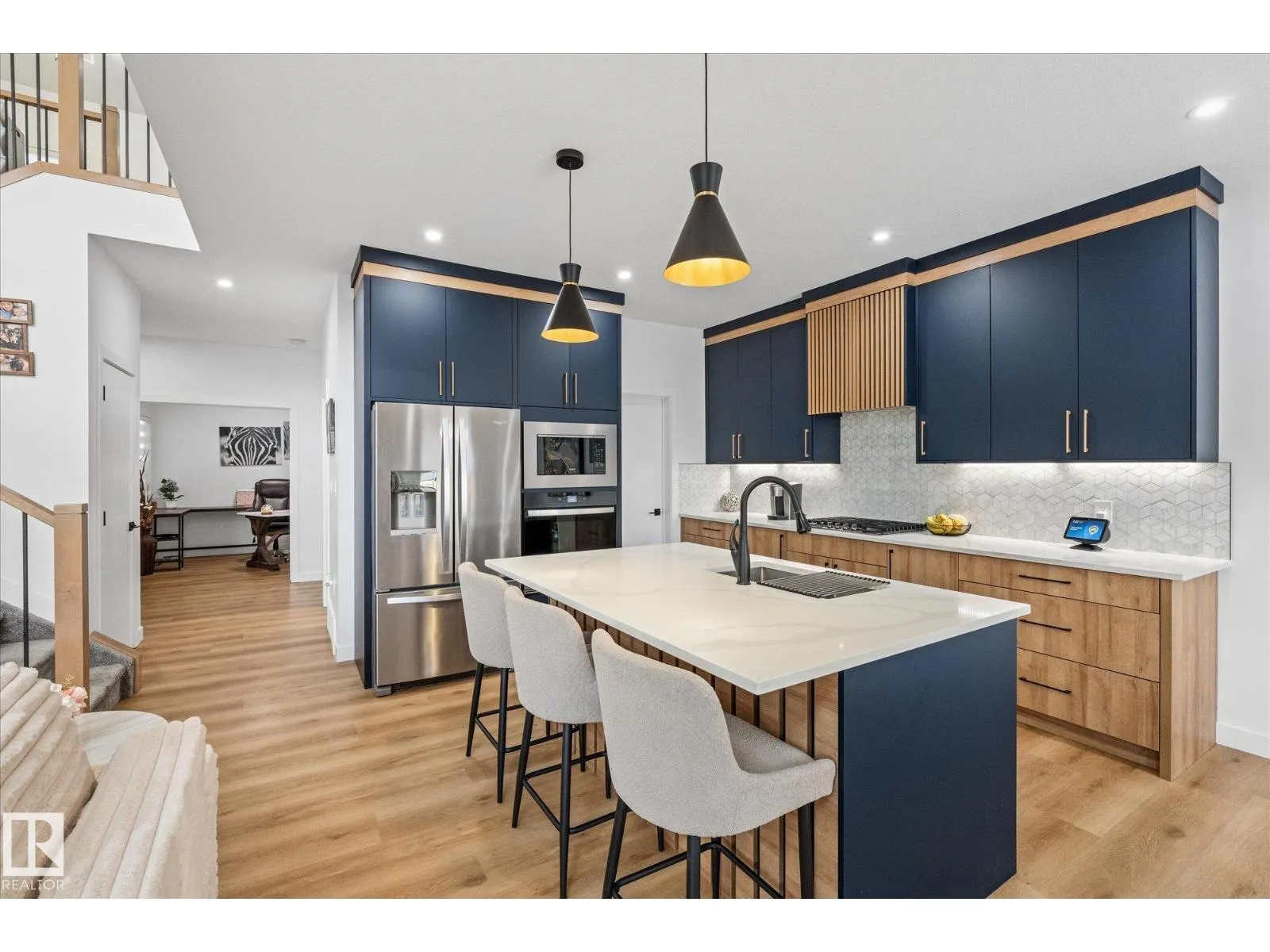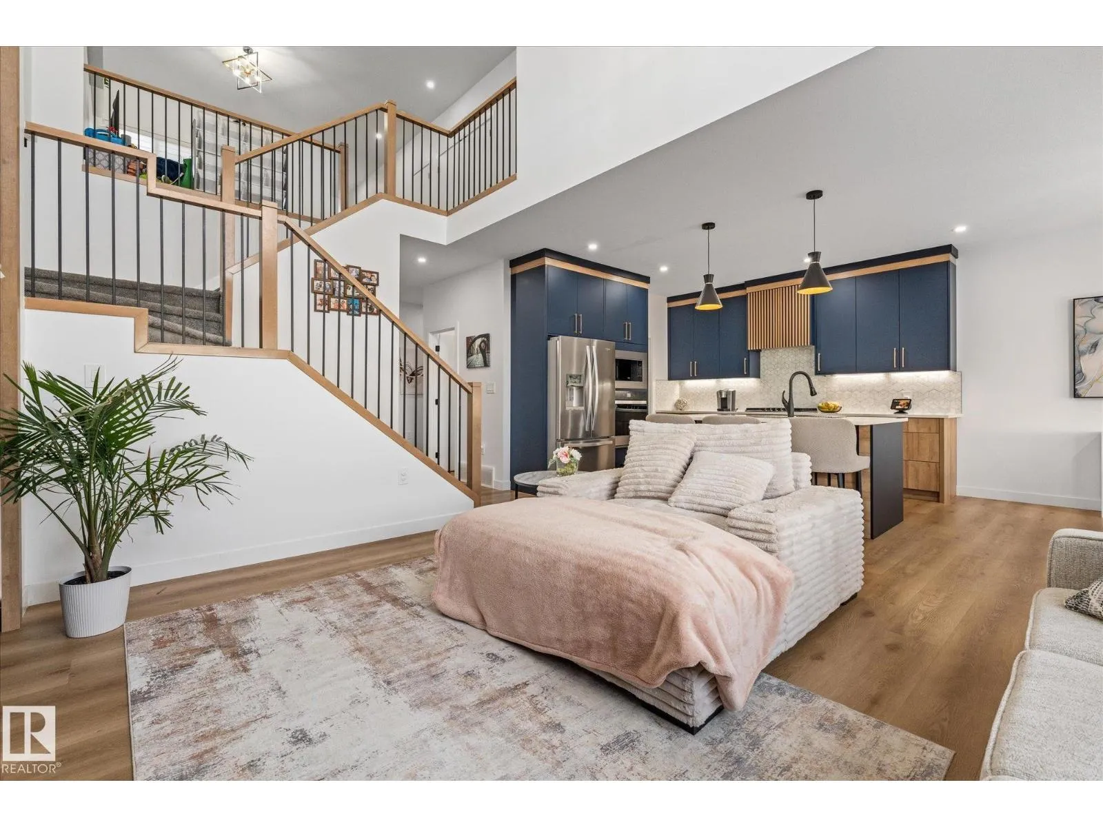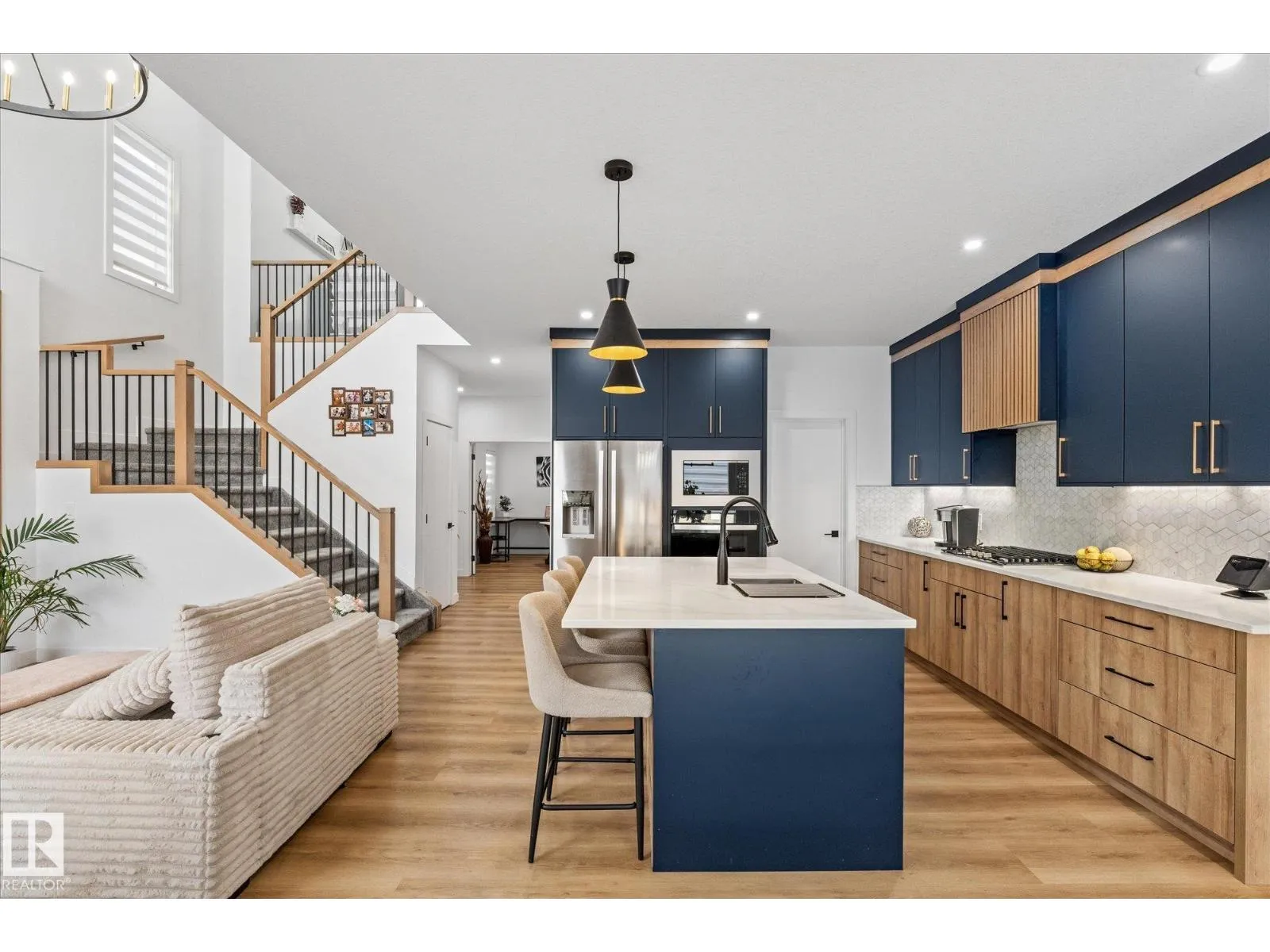 Located in the community of Tonewood, this impressive two storey home offers almost 2,300 sq. ft. of air conditioned living space designed for modern family life. The main floor features vinyl plank flooring, a versatile bedroom or office, and a show stopping open living area with soaring ceilings and a gas fireplace. The sleek kitchen shines with quartz countertops, full height cabinetry, stainless steel appliances, a large island, and a walk through pantry flowing seamlessly into a sun filled dining space. Upstairs, the primary retreat boasts a five piece ensuite and a giant walk in closet with custom, high end organizers, while two additional bedrooms each offer generously sized closets with incredible built in organizers. A full bath, upper floor laundry, and a spacious bonus room complete the level. The unfinished basement provides future development potential, while the fully fenced and landscaped backyard with deck, triple pane windows throughout, and a gas BBQ hookup make this move in ready. (id:27476)