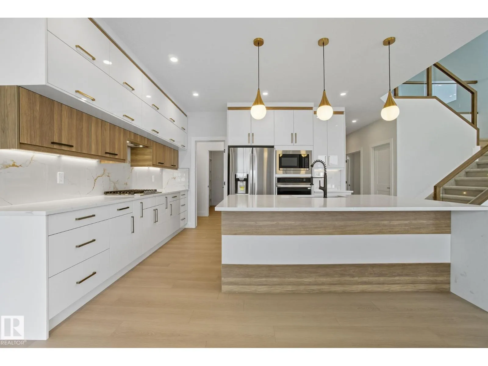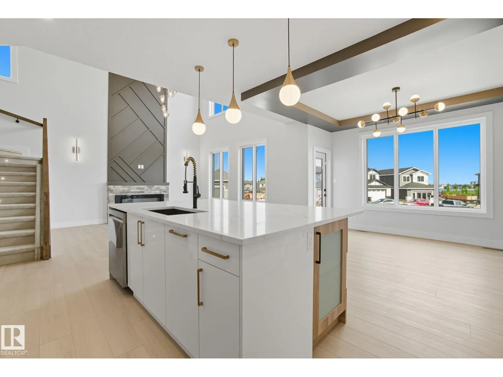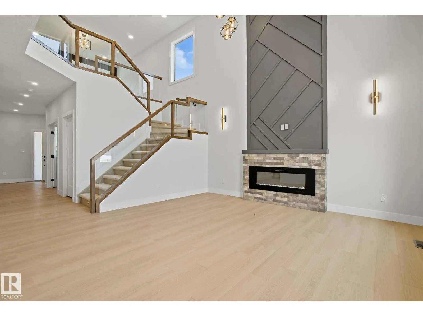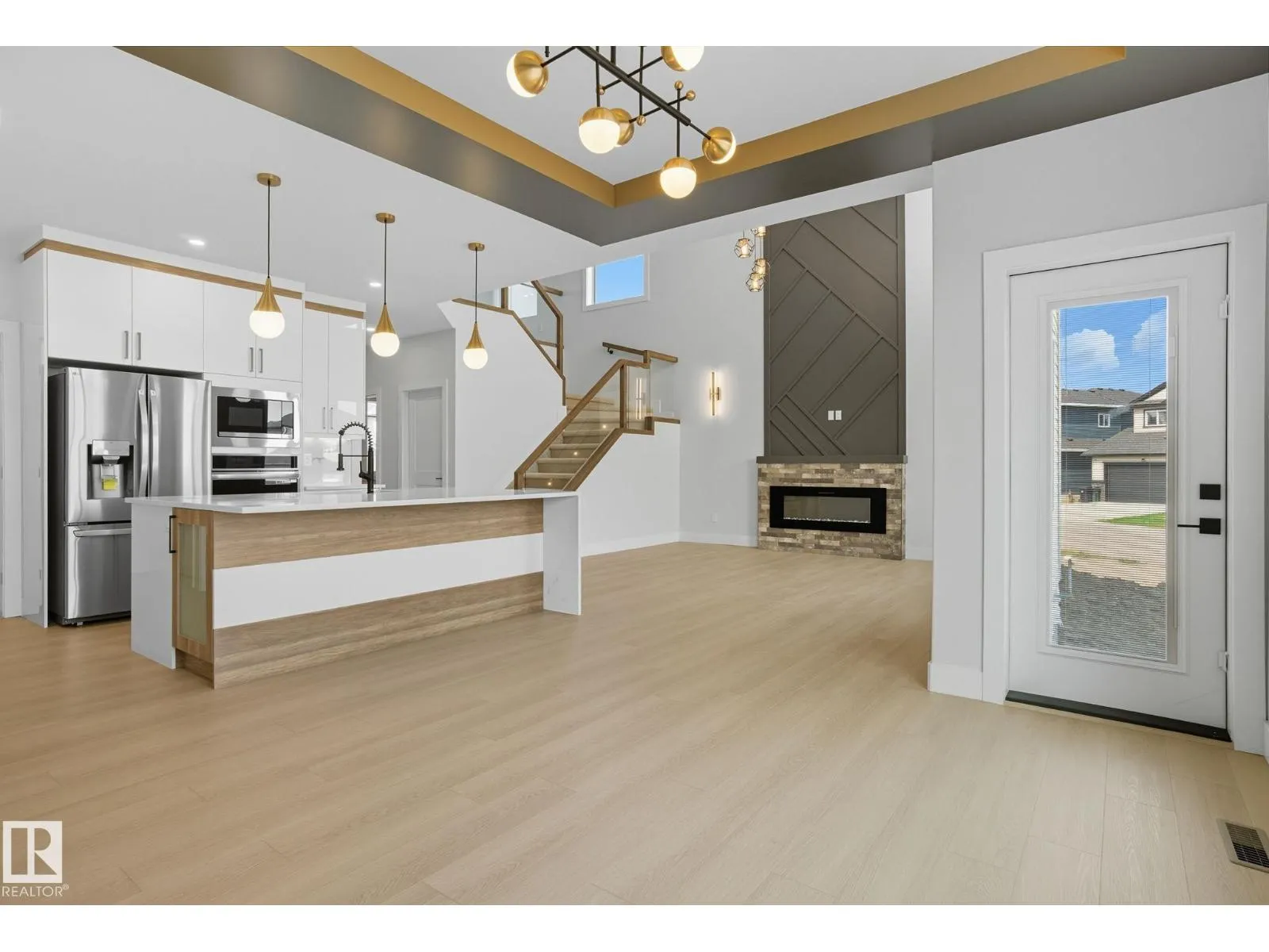Built by Sunnyview Homes. 4 bedrooms and 3 full bathrooms. TRIPLE car garage w/huge driveway. This stunning home offers a main floor bedroom and full bathroom. The spacious open to below great room features a beautiful accent wall with electric fireplace. The upgraded kitchen boasts sleek ceiling height cabinetry, a walkthrough pantry and a nook with a built-in beverage station. The mudroom offers double coat closets w/a built in bench. A glass railing staircase with maple handrail and step lighting leads to the upper level central bonus room. The primary suite showcases a coffered ceiling and barn door entry to a spa like en-suite with double vanity, jacuzzi, custom glass-enclosed shower, and a WIC with MDF shelving. 2 additional bedrooms share a 4-piece bathroom. Finished with modern upgrades and quality craftsmanship throughout. Features, 3 gas lines, quartz, designer lighting pkg, plush carpet, accent walls, garage w/drain and hot/cold water lines. SEPARATE side entrance to the basement. (id:27476)
