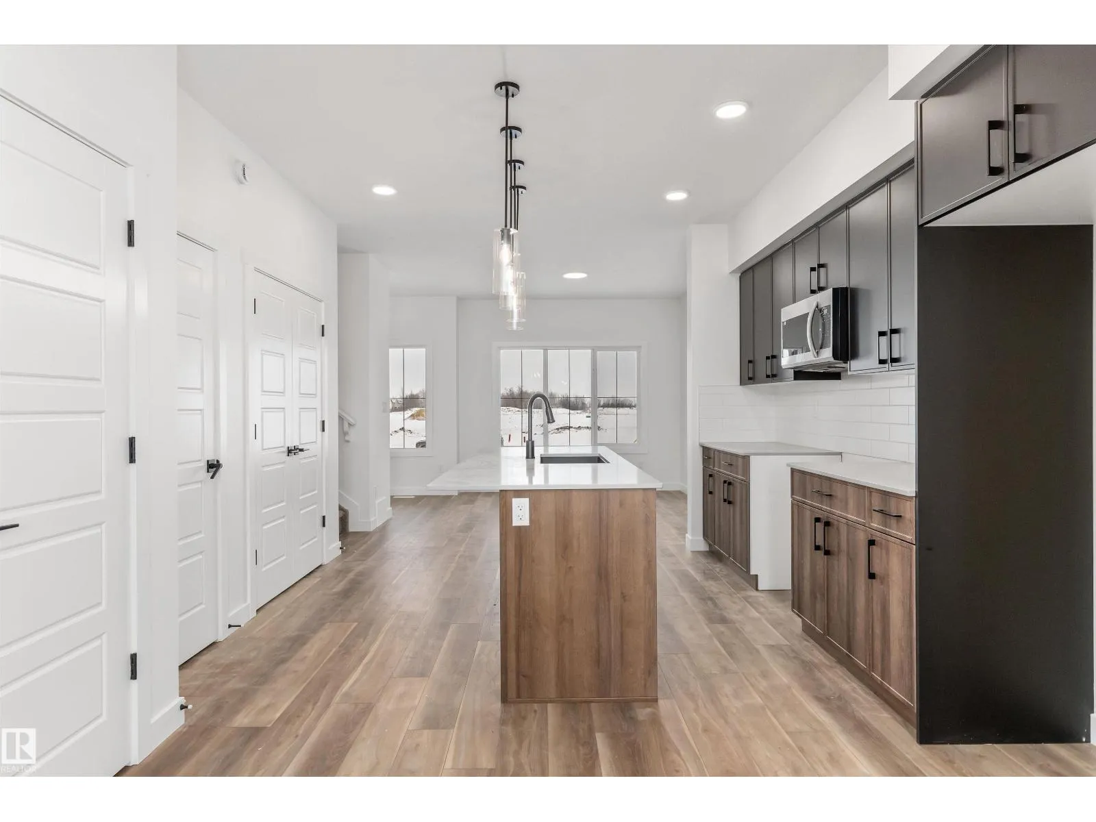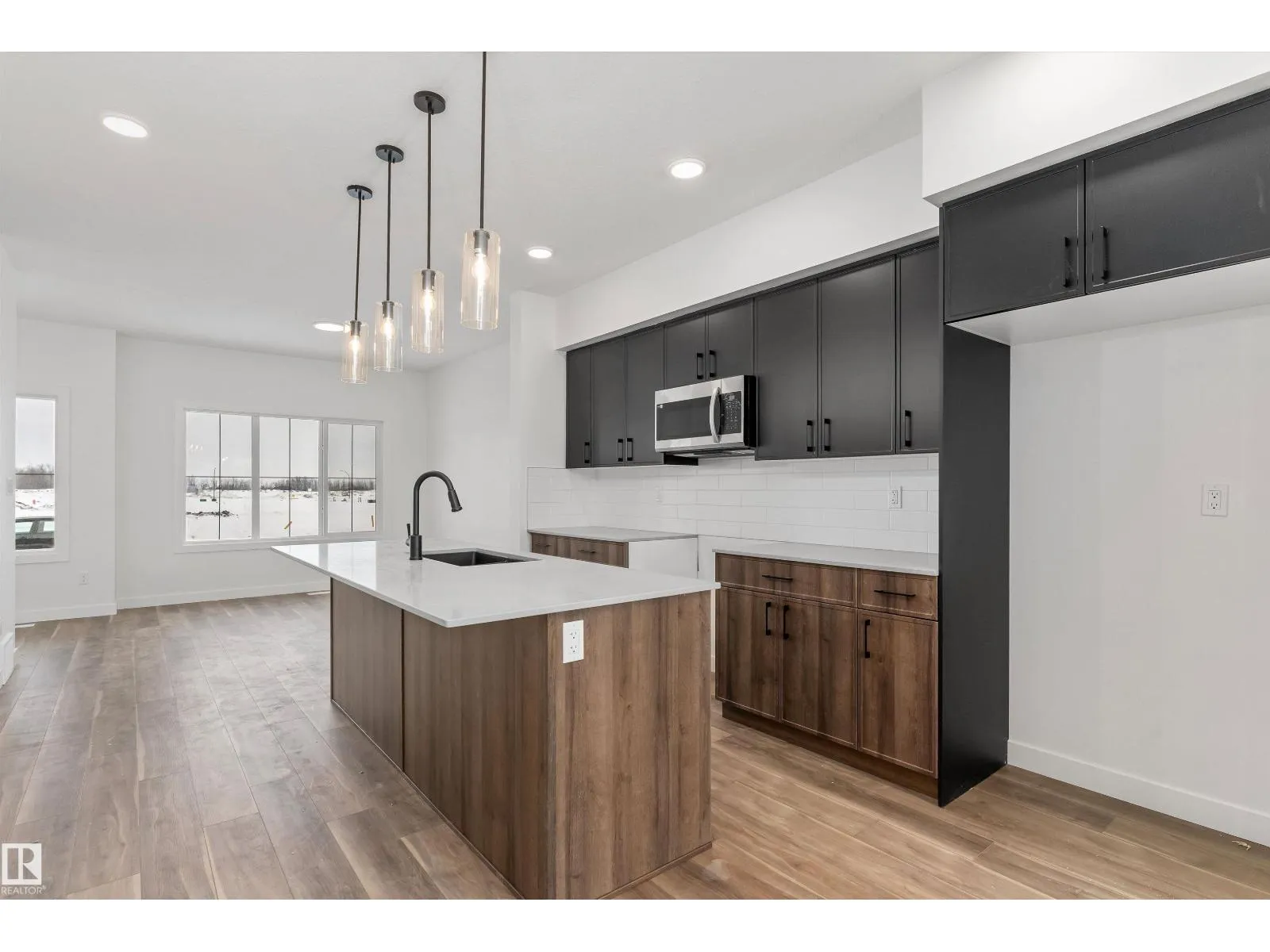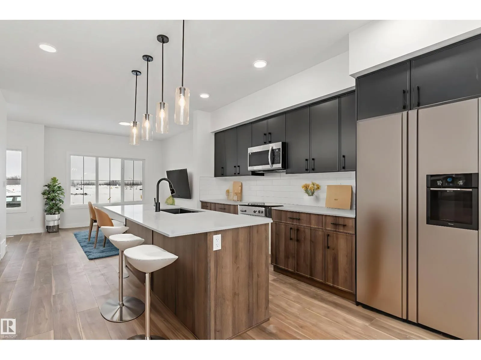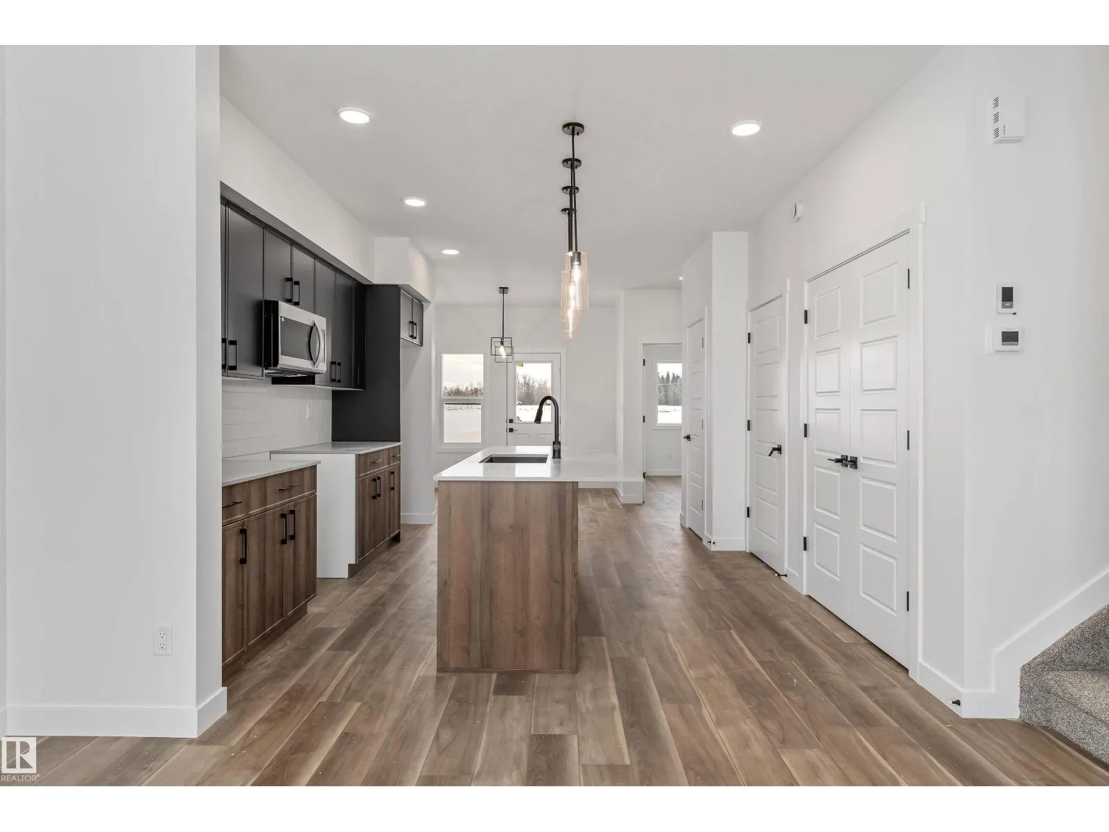 The Sylvan exudes superior craftsmanship, featuring 9â ceilings and Luxury Vinyl Plank flooring that transitions from an inviting foyer into a sun-filled front great room. The central kitchen functions as a stylish hub, equipped with quartz surfaces, a flush-ledge island with a Silgranit sink, and upgraded soft-close cabinetry paired with a tucked-away pantry. Uniquely designed for flexibility, the rear of the main floor includes a secluded bedroom and a full three-piece bath with a walk-in shower, situated near a bright nook and garden door. Upstairs, the primary suite offers a private sanctuary with a walk-in closet and ensuite, while two additional bedrooms share a second full bath and a convenient laundry closet. Finished with modern black fixtures and a rear parking pad with optional garage potential, this four-bedroom layout delivers exceptional utility and elegance. (id:27476)