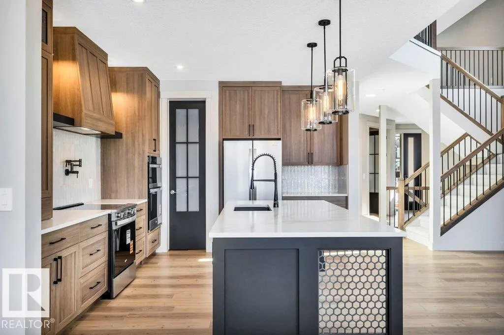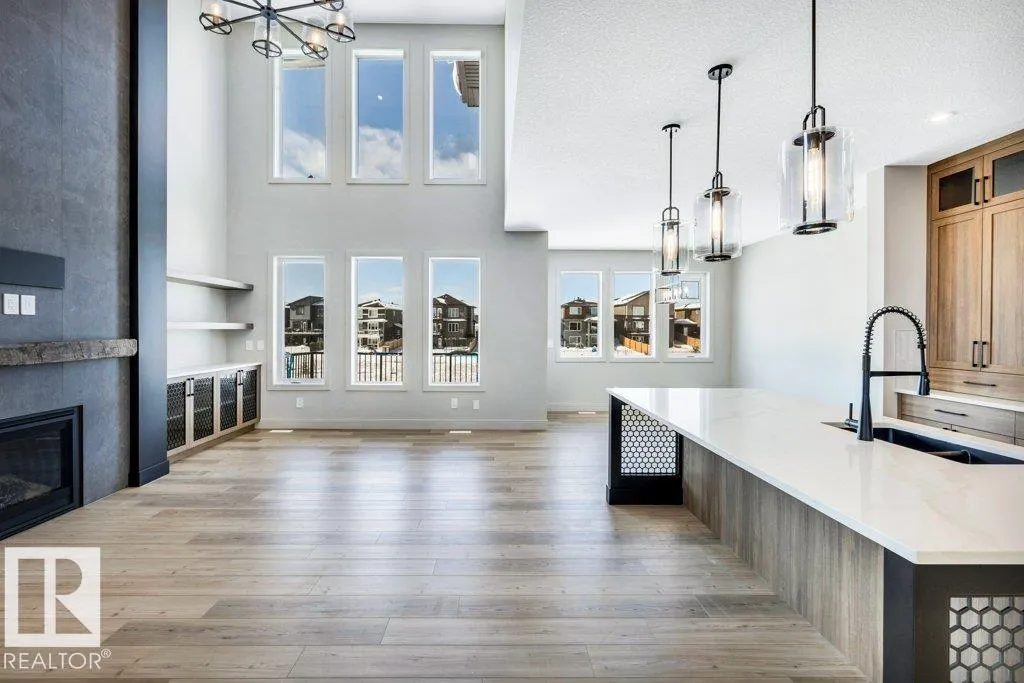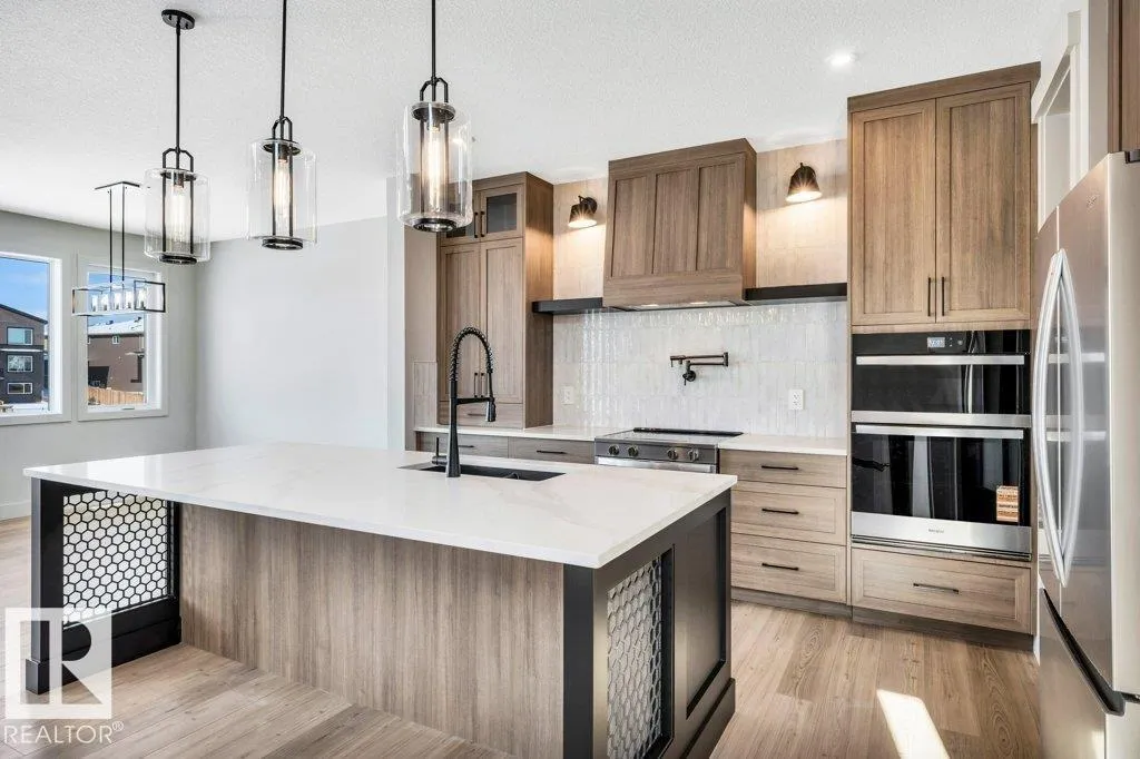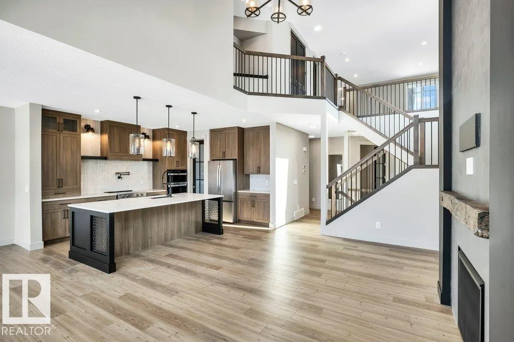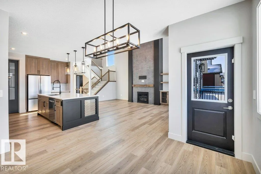 Welcome to this exquisite two-story walk-out home backing a pond built by Homexx. The main floor features an open-concept layout, ideal for entertaining. The chef-inspired kitchen boasts a large island, custom cabinetry, stainless steel appliances, and overlooks the dining area and great room. Upstairs, you'll find four spacious bedrooms, a bonus room with a vaulted ceiling, a laundry room, and two bathrooms. The primary bedroom is bright and airy, offering a 5-piece ensuite with a separate shower and tub, plus an impressive walk-through closet leading to the laundry. Additional highlights include quartz countertops, elegant lighting, luxury vinyl plank flooring, a gas fireplace, 8-foot interior doors, stylish railings with wrought iron spindles and 200 amp service. With excellent curb appeal, a double oversized attached garage, and proximity to walking trails this home has it all. (id:27476)