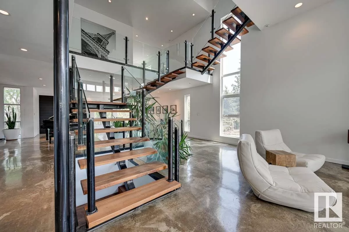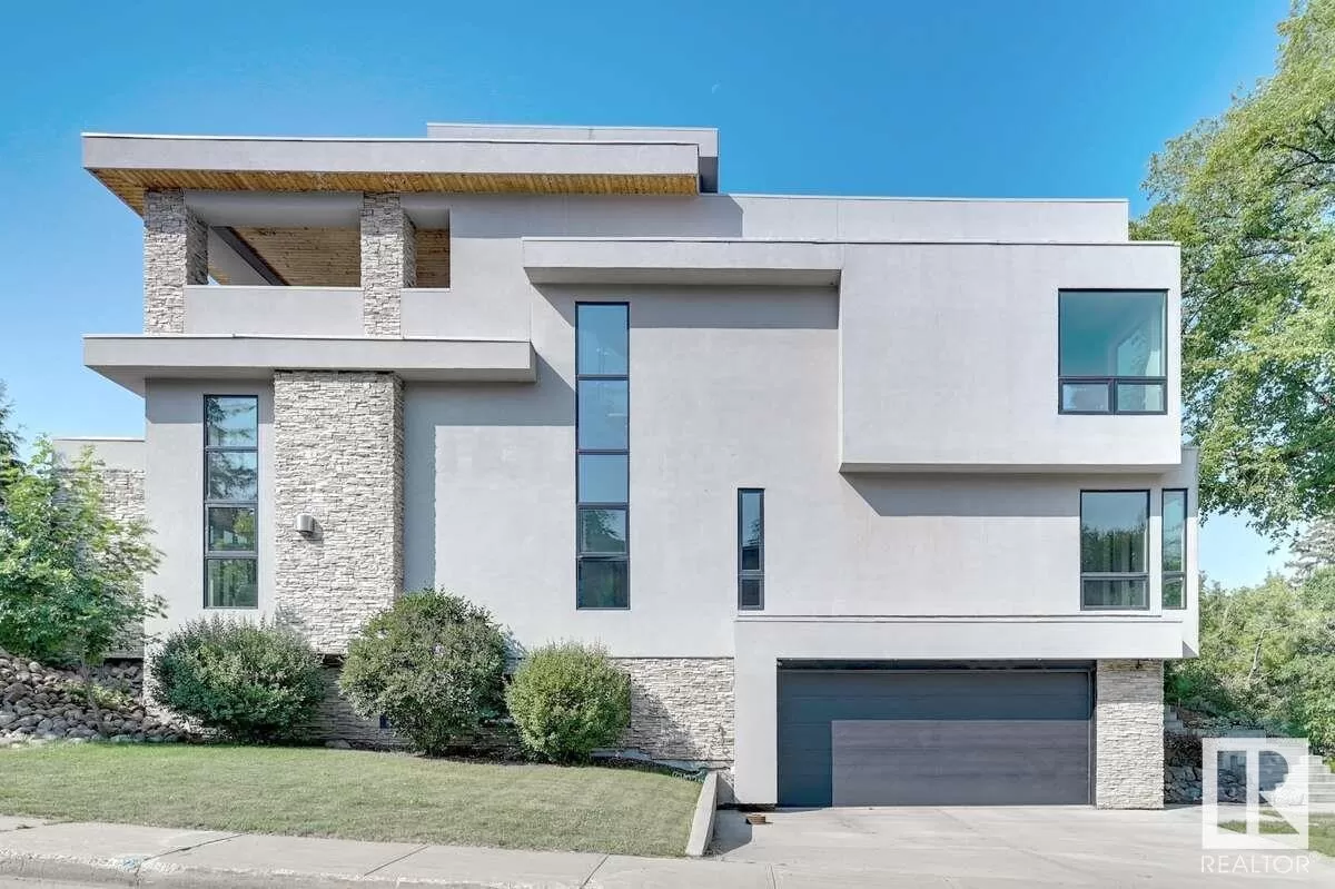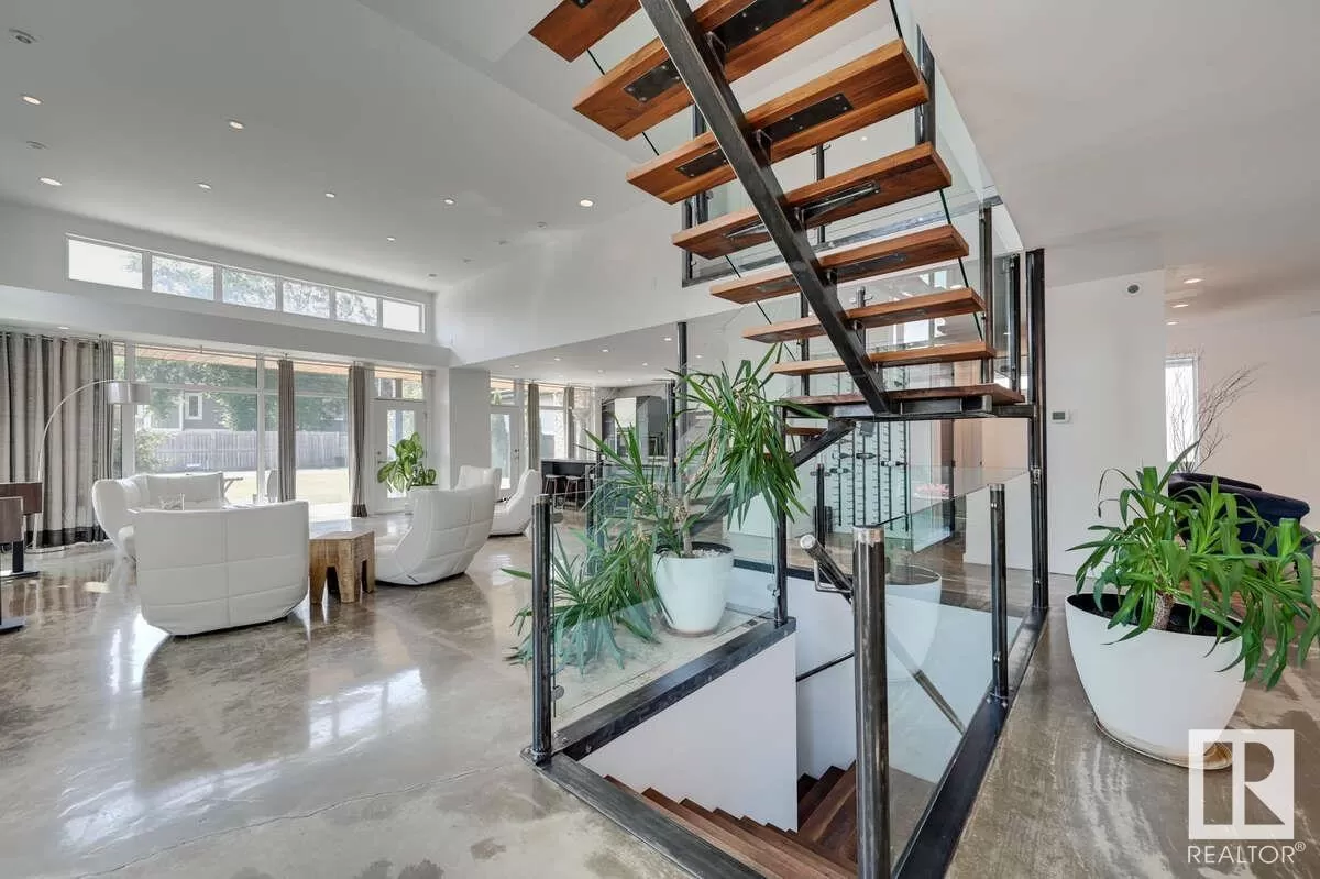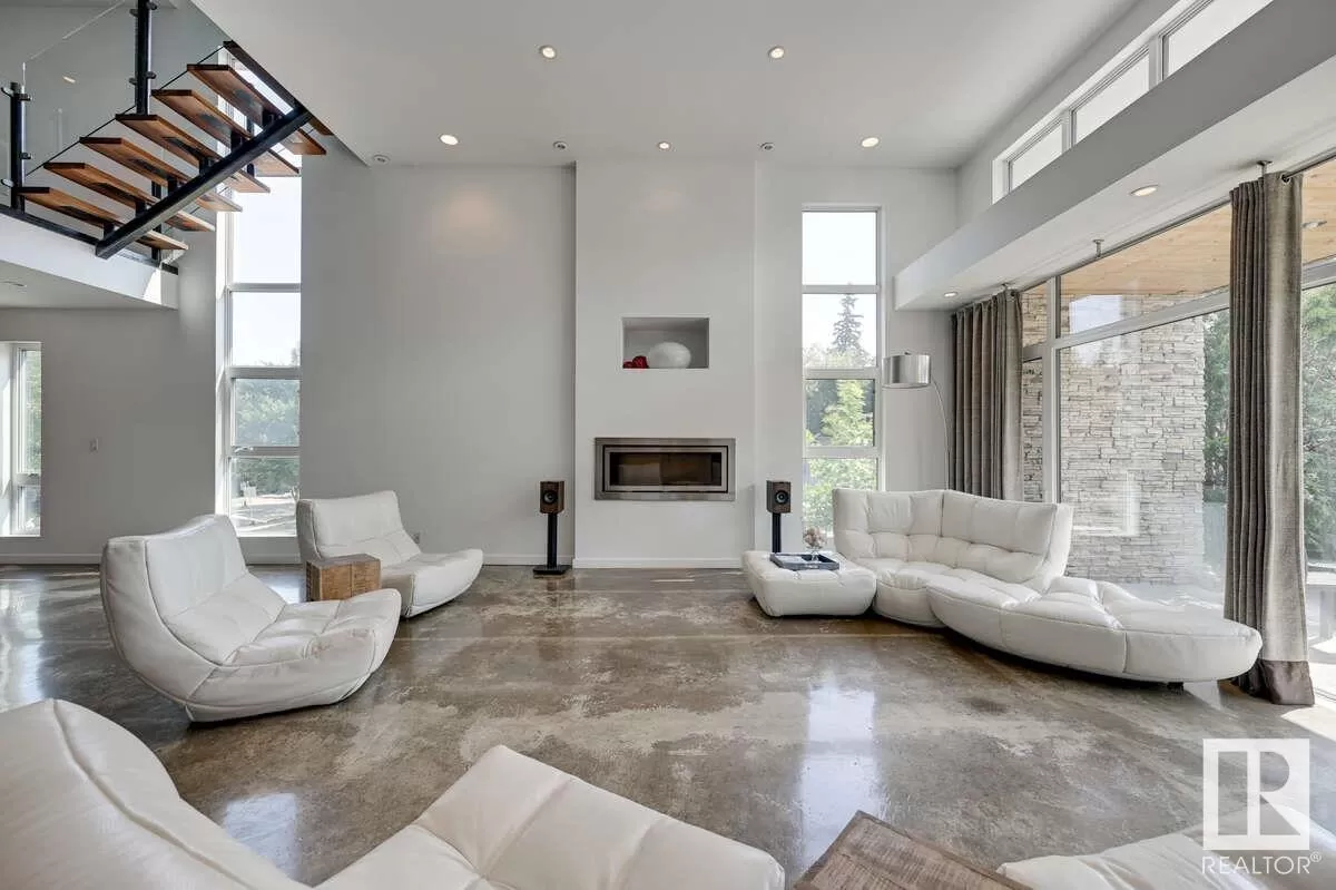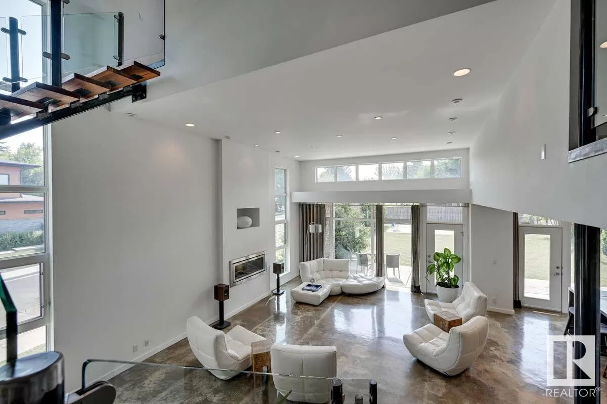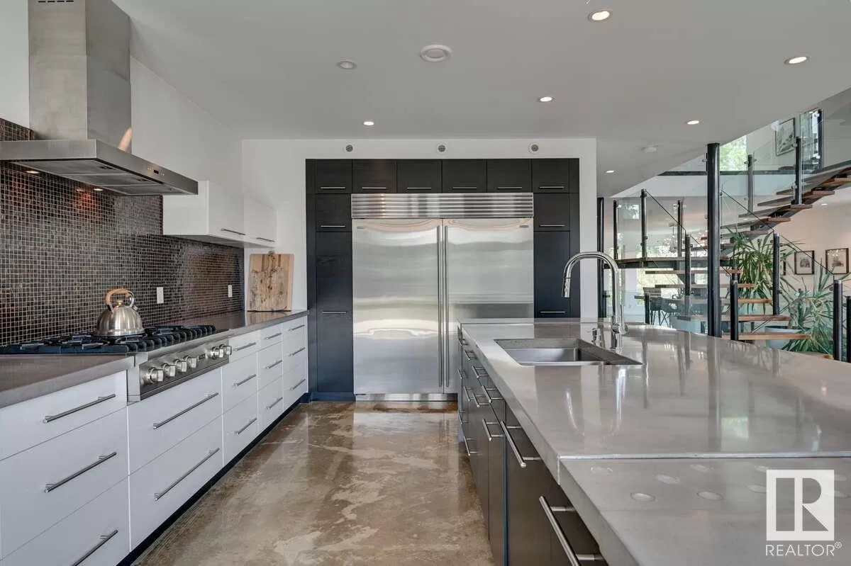For more information, please click on View Listing on Realtor Website. An architectural retreat in Braeside, St. Albertâs most coveted neighbourhood. With over 4,700 sqft of finished space this custom home blends sculptural design with quiet luxury. Soaring ceilings, triple-pane glass, and a floating steel staircase define the main floor, anchored by polished concrete and a chefâs kitchen with SubZero and Viking appliances. Upstairs: a peaceful loft, light-filled bedrooms, and a spa-inspired primary suite. Finished basement features a wood burning fireplace, bedroom, full bath, and integrated double garage. 1,400+ sqft rooftop terrace with 400 sqft covered lounge and rough-ins for an outdoor kitchen. Radiant in-floor heating, air handling with integrated coil, and passive solar design keep the home cool without conventional A/C. Located steps from schools, trails, and the Farmers Market, this home offers modern living in St. Albertâs most walkable enclave. (id:27476)