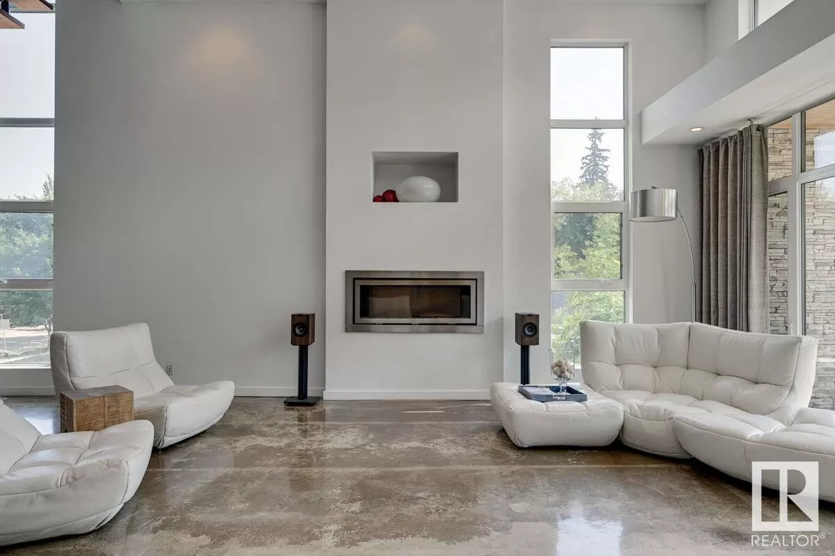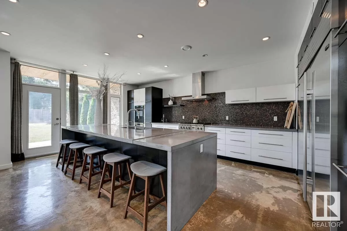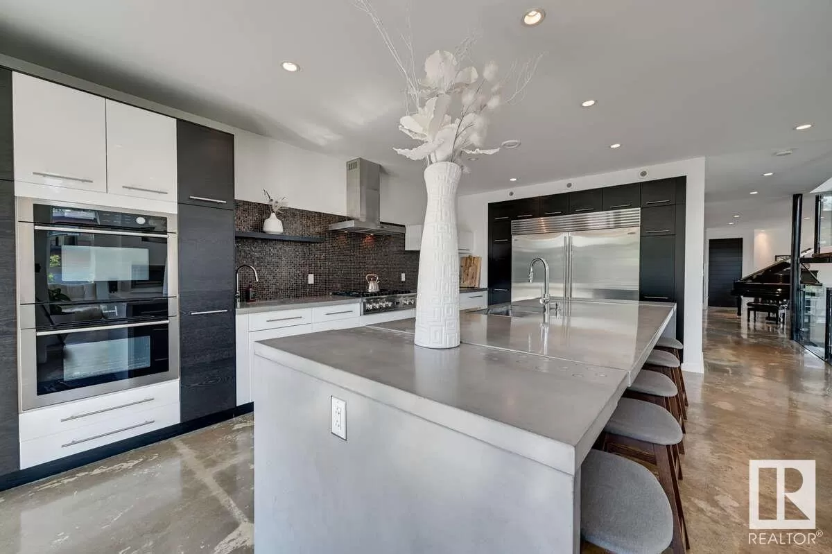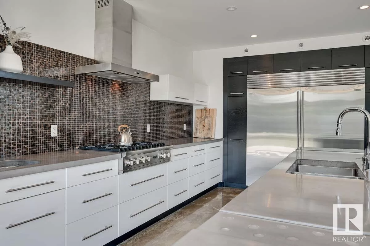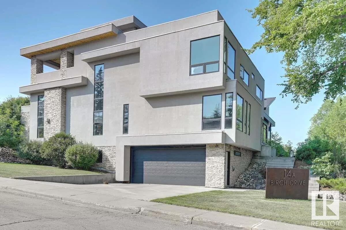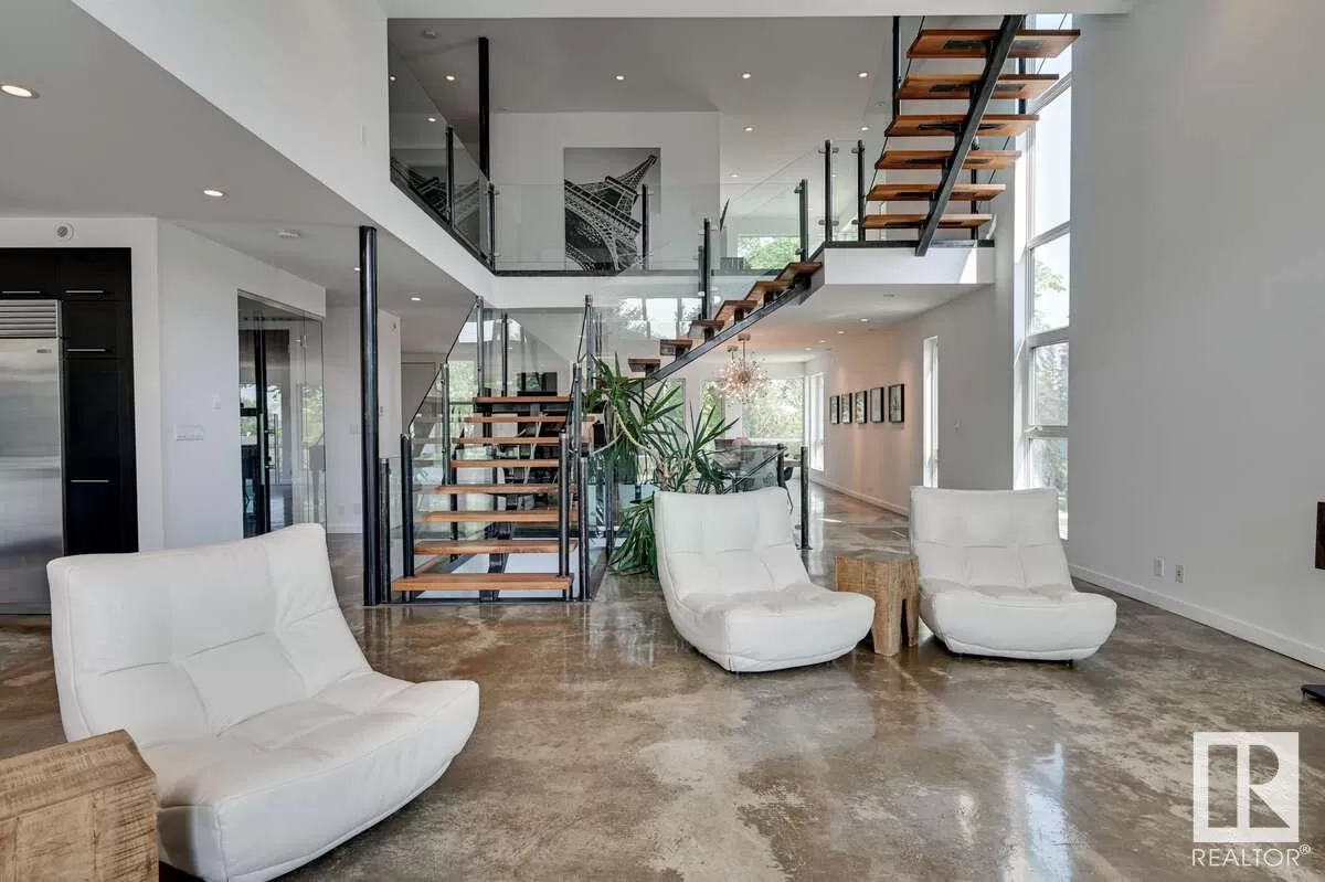 For more information, please click on View Listing on Realtor Website. An architectural retreat in Braeside, St. Albertâs most coveted neighbourhood. With over 4,700 sqft of finished space this custom home blends sculptural design with quiet luxury. Soaring ceilings, triple-pane glass, and a floating steel staircase define the main floor, anchored by polished concrete and a chefâs kitchen with SubZero and Viking appliances. Upstairs: a peaceful loft, light-filled bedrooms, and a spa-inspired primary suite. Finished basement features a wood burning fireplace, bedroom, full bath, and integrated double garage. 1,400+ sqft rooftop terrace with 400 sqft covered lounge and rough-ins for an outdoor kitchen. Radiant in-floor heating, air handling with integrated coil, and passive solar design keep the home cool without conventional A/C. Located steps from schools, trails, and the Farmers Market, this home offers modern living in St. Albertâs most walkable enclave. (id:27476)