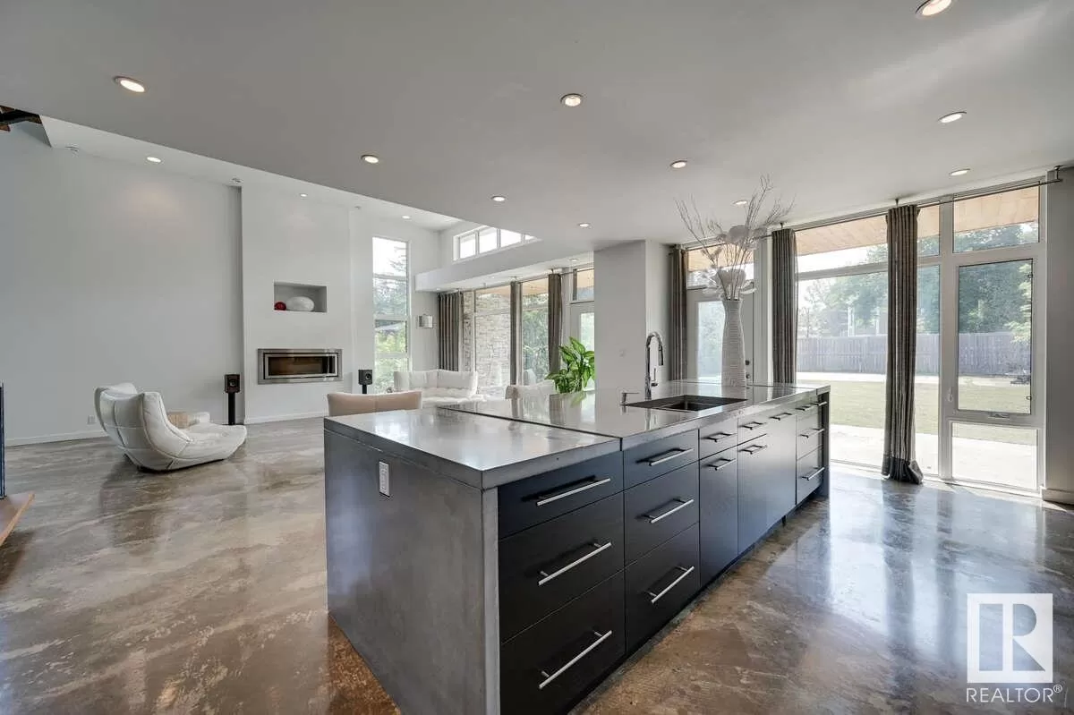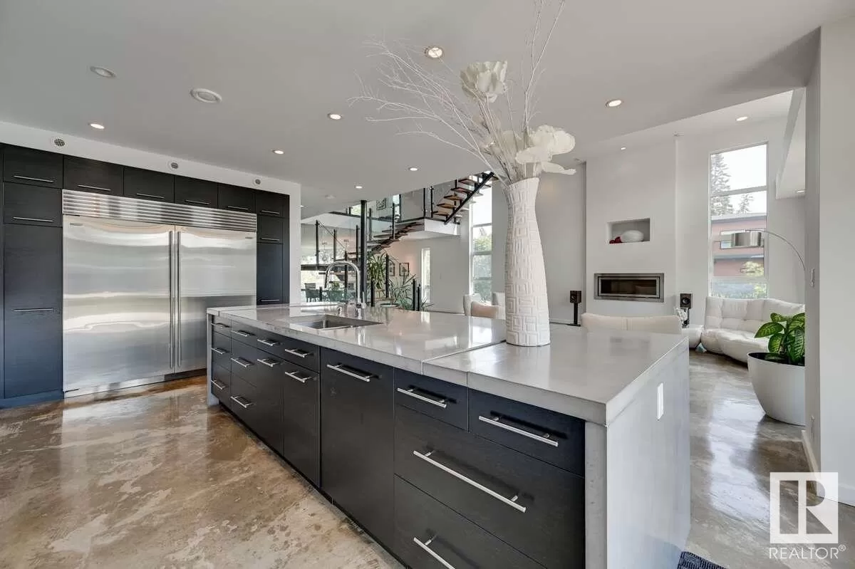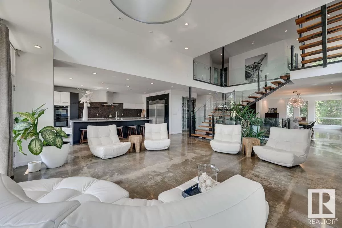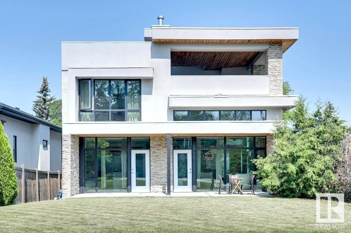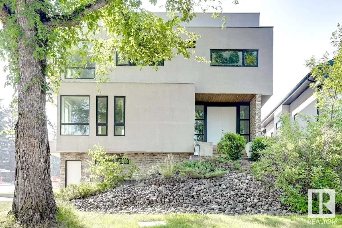 For more information, please click on View Listing on Realtor Website. An architectural retreat in Braeside, St. Albertâs most coveted neighbourhood. With over 4,700 sqft of finished space this custom home blends sculptural design with quiet luxury. Soaring ceilings, triple-pane glass, and a floating steel staircase define the main floor, anchored by polished concrete and a chefâs kitchen with SubZero and Viking appliances. Upstairs: a peaceful loft, light-filled bedrooms, and a spa-inspired primary suite. Finished basement features a wood burning fireplace, bedroom, full bath, and integrated double garage. 1,400+ sqft rooftop terrace with 400 sqft covered lounge and rough-ins for an outdoor kitchen. Radiant in-floor heating, air handling with integrated coil, and passive solar design keep the home cool without conventional A/C. Located steps from schools, trails, and the Farmers Market, this home offers modern living in St. Albertâs most walkable enclave. (id:27476)