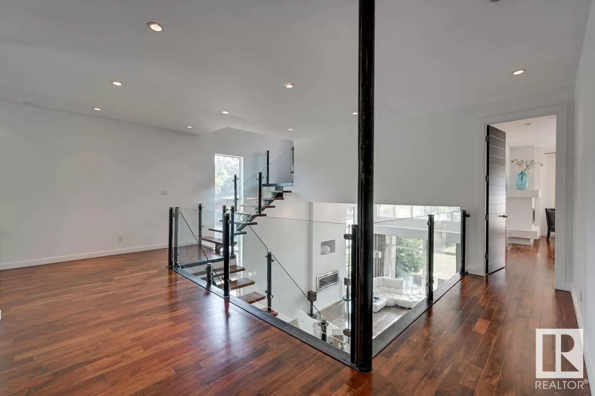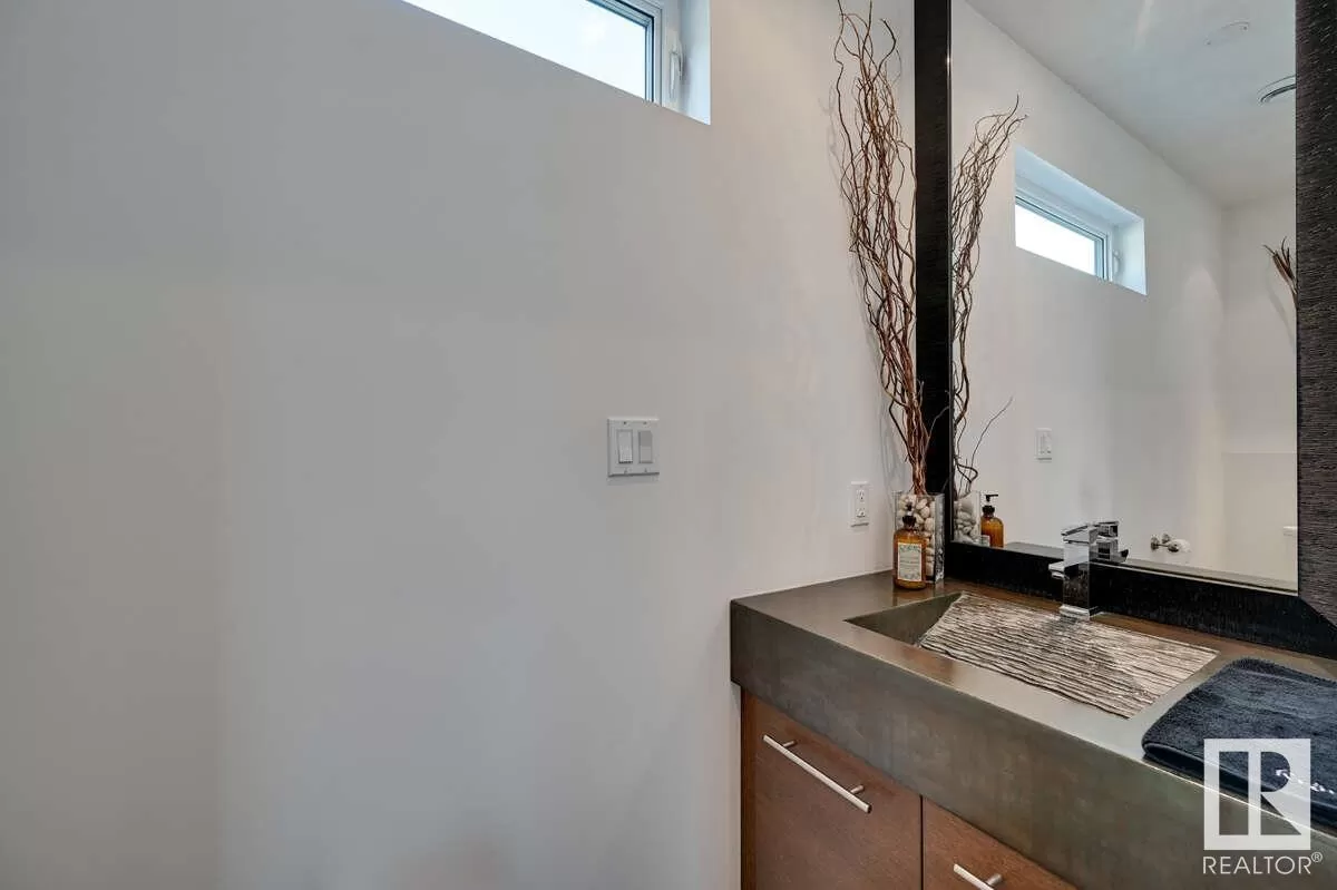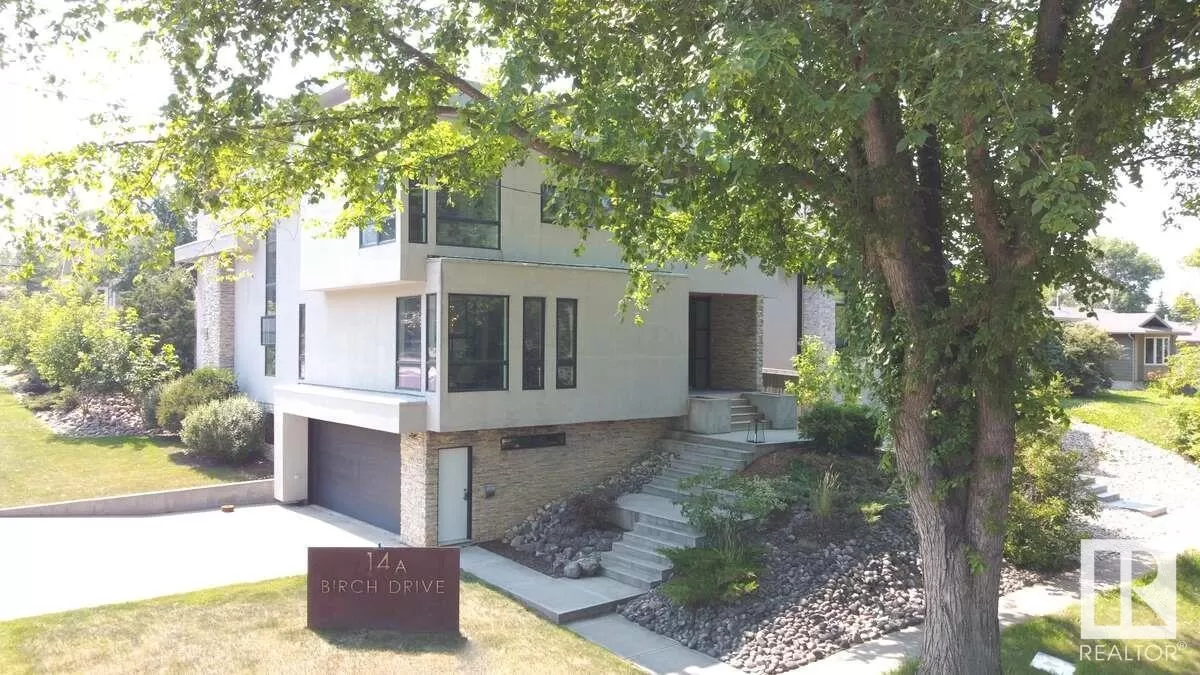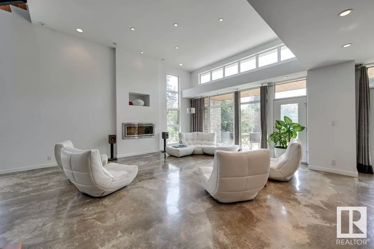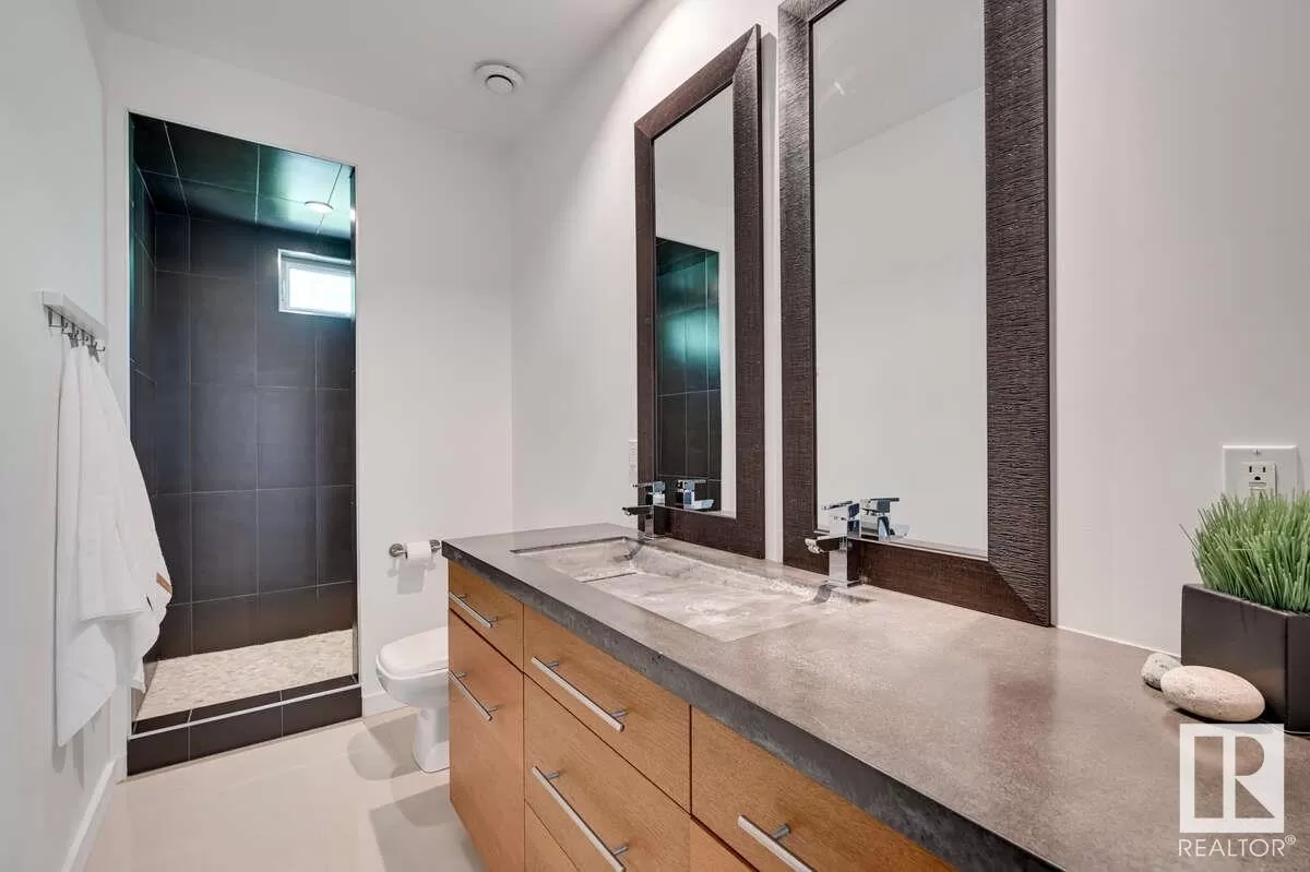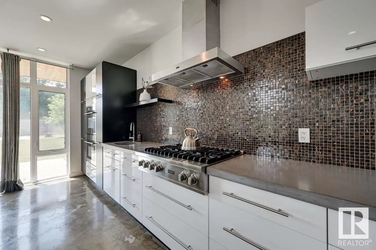 For more information, please click on View Listing on Realtor Website. An architectural retreat in Braeside, St. Albertâs most coveted neighbourhood. With over 4,700 sqft of finished space this custom home blends sculptural design with quiet luxury. Soaring ceilings, triple-pane glass, and a floating steel staircase define the main floor, anchored by polished concrete and a chefâs kitchen with SubZero and Viking appliances. Upstairs: a peaceful loft, light-filled bedrooms, and a spa-inspired primary suite. Finished basement features a wood burning fireplace, bedroom, full bath, and integrated double garage. 1,400+ sqft rooftop terrace with 400 sqft covered lounge and rough-ins for an outdoor kitchen. Radiant in-floor heating, air handling with integrated coil, and passive solar design keep the home cool without conventional A/C. Located steps from schools, trails, and the Farmers Market, this home offers modern living in St. Albertâs most walkable enclave. (id:27476)