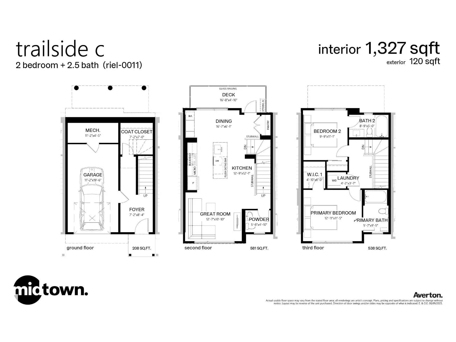NEW CONSTRUCTION â POSSESSION READY FOR FEBRUARY 2026! This thoughtfully designed townhome offers a functional layout with 2 bedrooms, 2.5 baths, and a double-ensuite design for comfort and convenience. The open-concept main floor includes vinyl flooring throughout, a spacious dining area with access to a large deck, and an upgraded kitchen with a chimney hood fan and modern plumbing, lighting, and hardware finishes. An attached single-car garage plus additional driveway parking adds everyday practicality. Finished in a soft white and organic wood grain palette, this home blends comfort with natural tones for a warm, modern feel. Year-round exterior care - snow removal and landscaping maintenance - is included. Images and renderings are representative of the homeâs layout and/or design only and may include virtual staging. Exact finishes may differ. Sale price is inclusive of GST. Averton promotional pricing of $15,000 off this move in ready home until Nov 30. (id:27476)