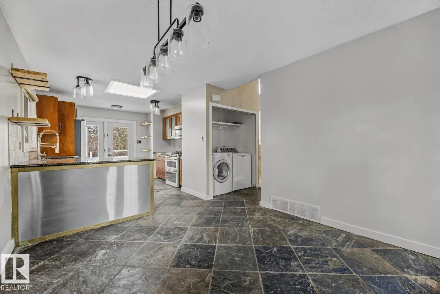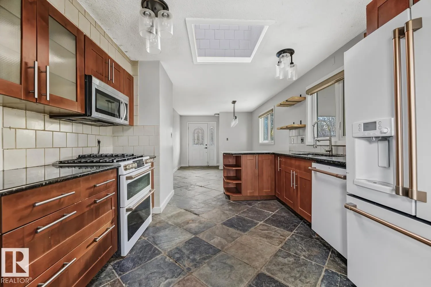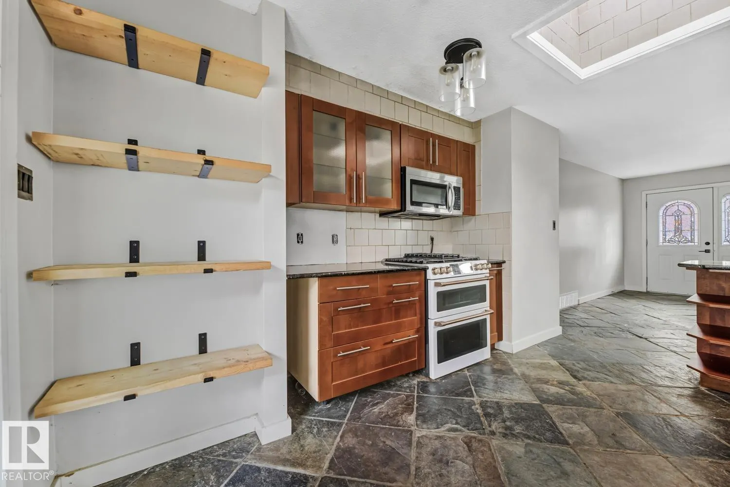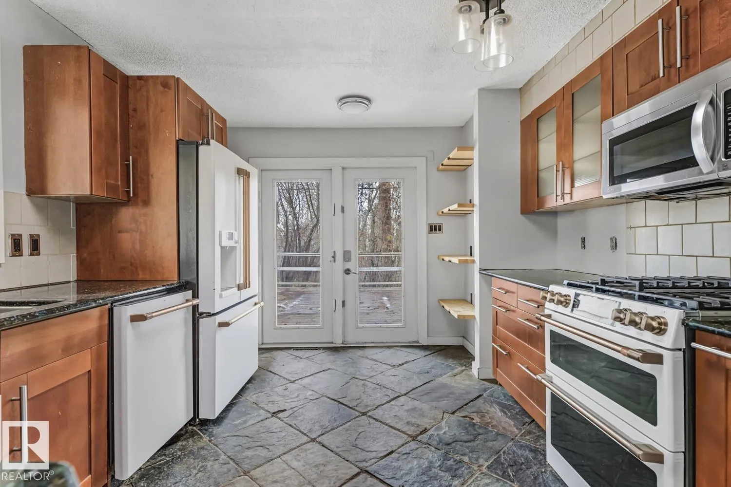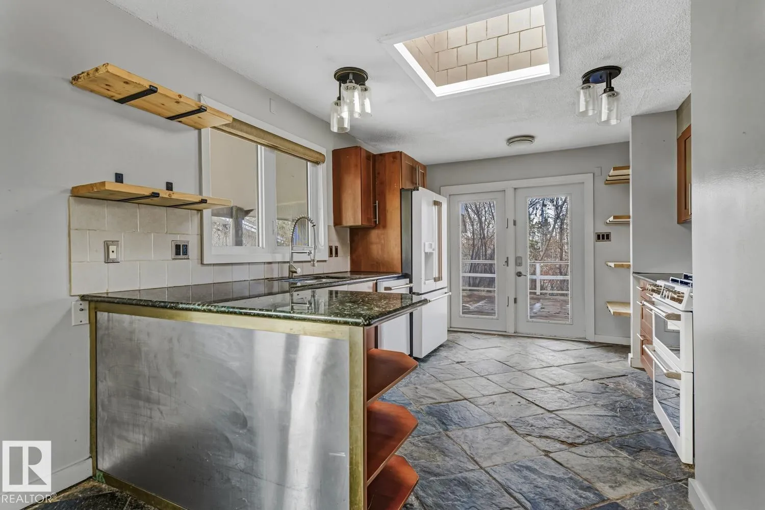 WELL SITUATED & BACKING ONTO GREEN SPACE! This 3 bed + 2 full baths 4 level-split home is located in mature Grandin on a quiet, tree-lined street! Main floor offers: spacious living room with hardwood floor, sky-light, wood burning fireplace and sliding door access to a huge outdoor deck. Efficient kitchen includes granite counter tops, slate tiles and deck access. Upstairs you will find 2 ample bedrooms and 4 pc bath. Lower level contains a huge bedroom with 3pc ensuite. Basement is partially finished with potential for additional bedroom. Upgrades include: newer roof on the house, windows, hot water tank and furnace. Fully fenced yard with single garage and car port. Walking distance to elementary school, playground, baseball and soccer fields. Quick access to amenities, St. Albert Trail and Anthony Henday Drive. QUICK POSSESSION! (id:27476)