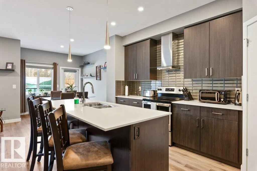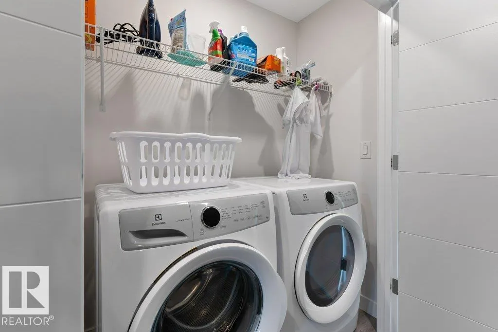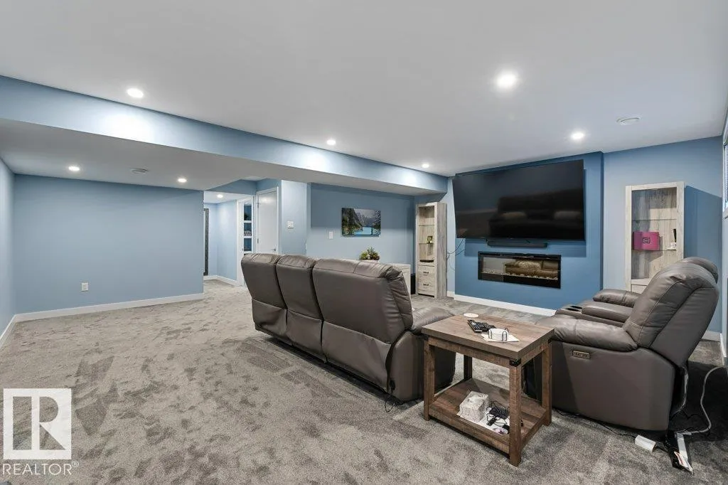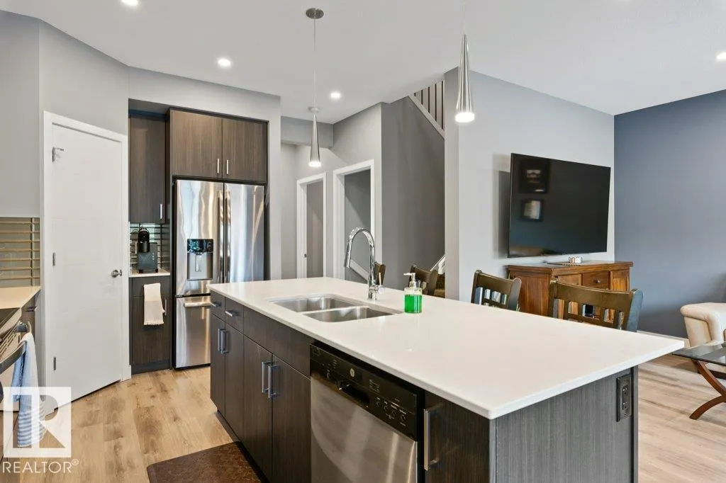 Welcome to this upgraded 1,670 sq ft half duplex in the sought after community of Riverside, offering great access to river valley trails, Anthony Henday, downtown & nearby schools. The bright main floor features an open concept layout with an island kitchen overlooking the spacious living room, ideal for entertaining or daily living. This level includes a 2 pce bath, electric blinds, air conditioning & direct access to the finished double attached garage w/epoxy flooring & painted walls. Upstairs, the primary suite features a custom-designed walk-in closet w/barn door detail & a private ensuite highlighted by upgraded swivel faucets. Two additional bedrooms, 4 pce bathroom & upper floor laundry complete this level. The finished basement, completed by the builder in 2023, offers a rec room, 3 pce bathroom, storage & a sound insulated space under the stairs. Outside, enjoy landscaped gardens, an interlocking brick patio, an extended maintenance free deck & a custom mural enhancing the outdoor living space. (id:27476)
