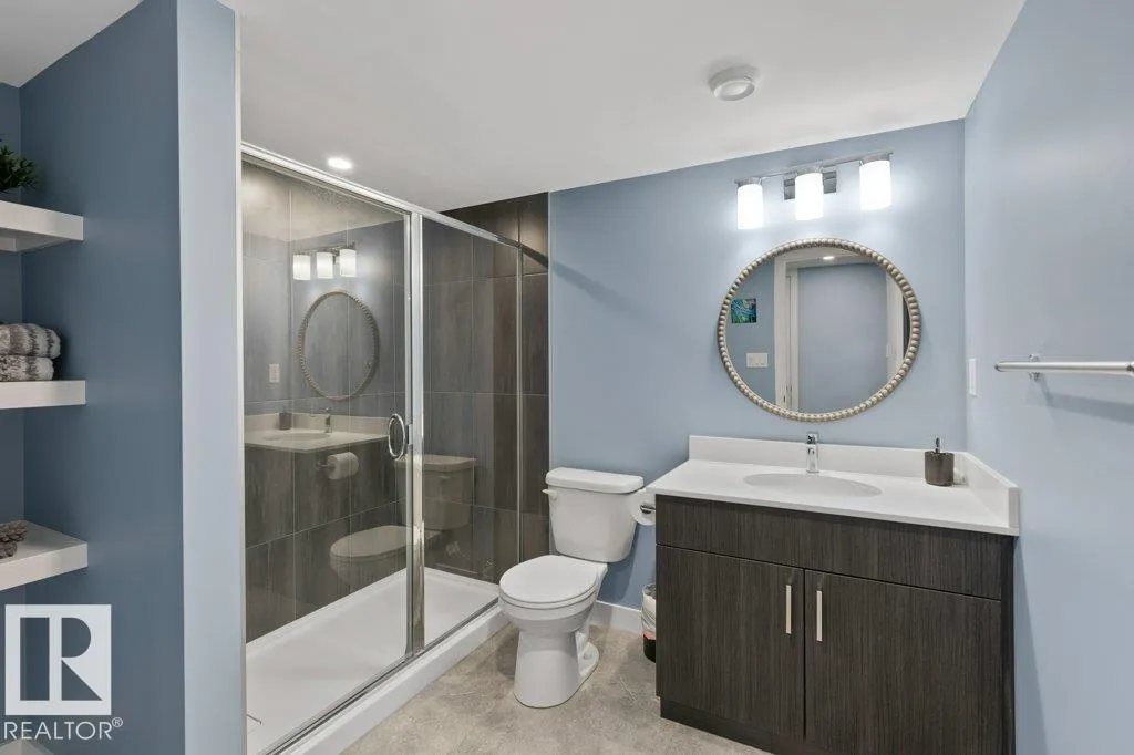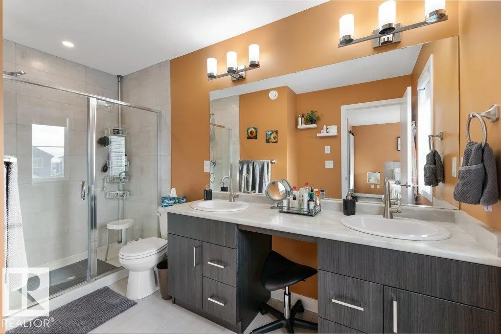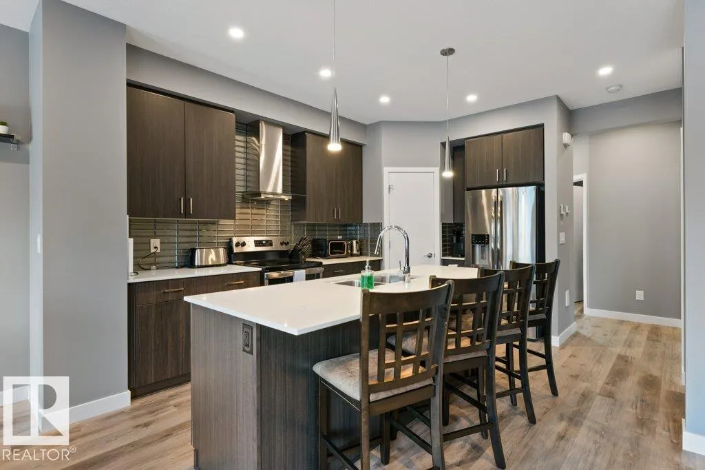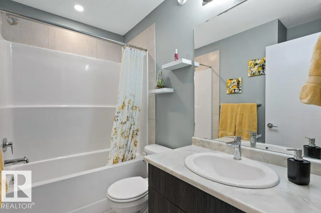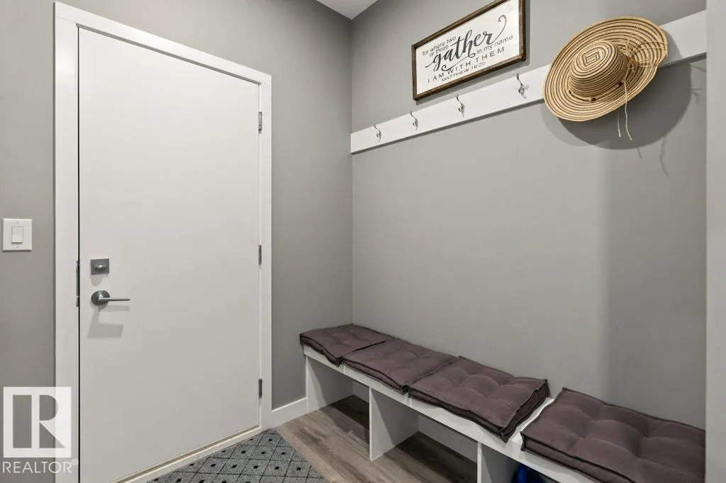 Welcome to this upgraded 1,670 sq ft half duplex in the sought after community of Riverside, offering great access to river valley trails, Anthony Henday, downtown & nearby schools. The bright main floor features an open concept layout with an island kitchen overlooking the spacious living room, ideal for entertaining or daily living. This level includes a 2 pce bath, electric blinds, air conditioning & direct access to the finished double attached garage w/epoxy flooring & painted walls. Upstairs, the primary suite features a custom-designed walk-in closet w/barn door detail & a private ensuite highlighted by upgraded swivel faucets. Two additional bedrooms, 4 pce bathroom & upper floor laundry complete this level. The finished basement, completed by the builder in 2023, offers a rec room, 3 pce bathroom, storage & a sound insulated space under the stairs. Outside, enjoy landscaped gardens, an interlocking brick patio, an extended maintenance free deck & a custom mural enhancing the outdoor living space. (id:27476)