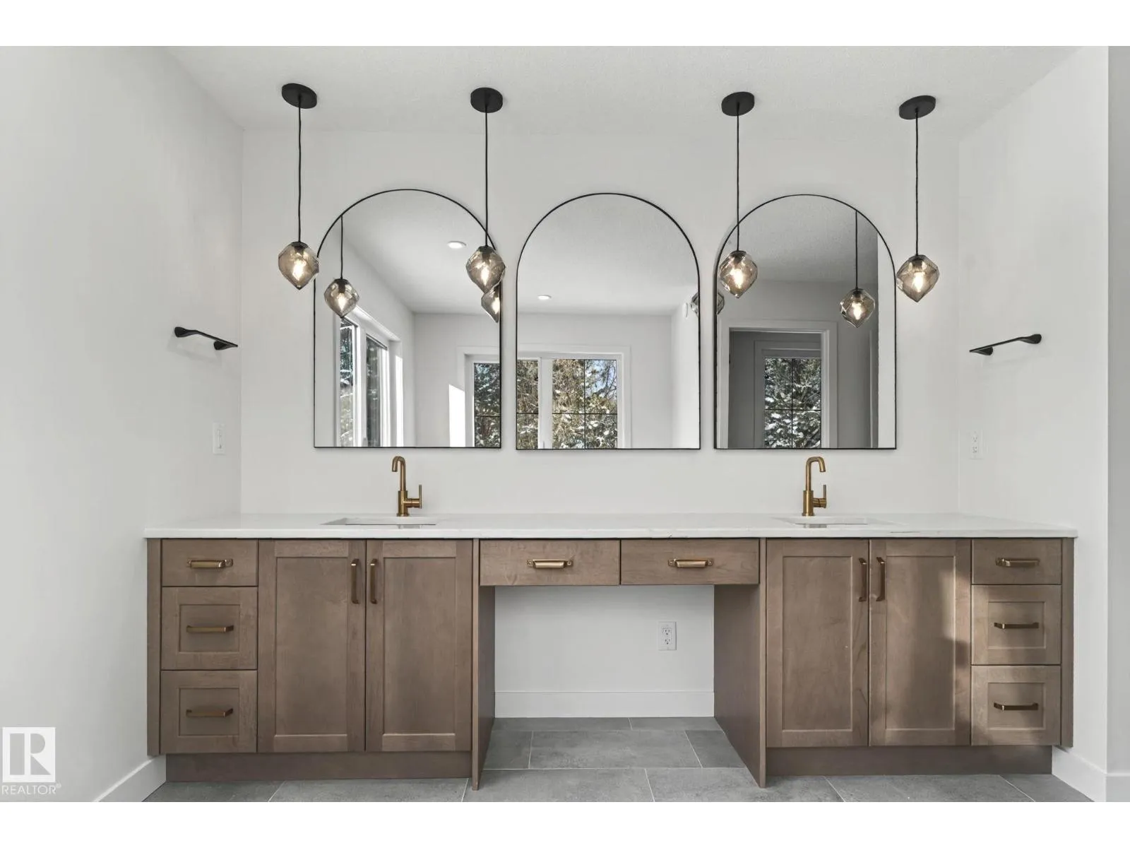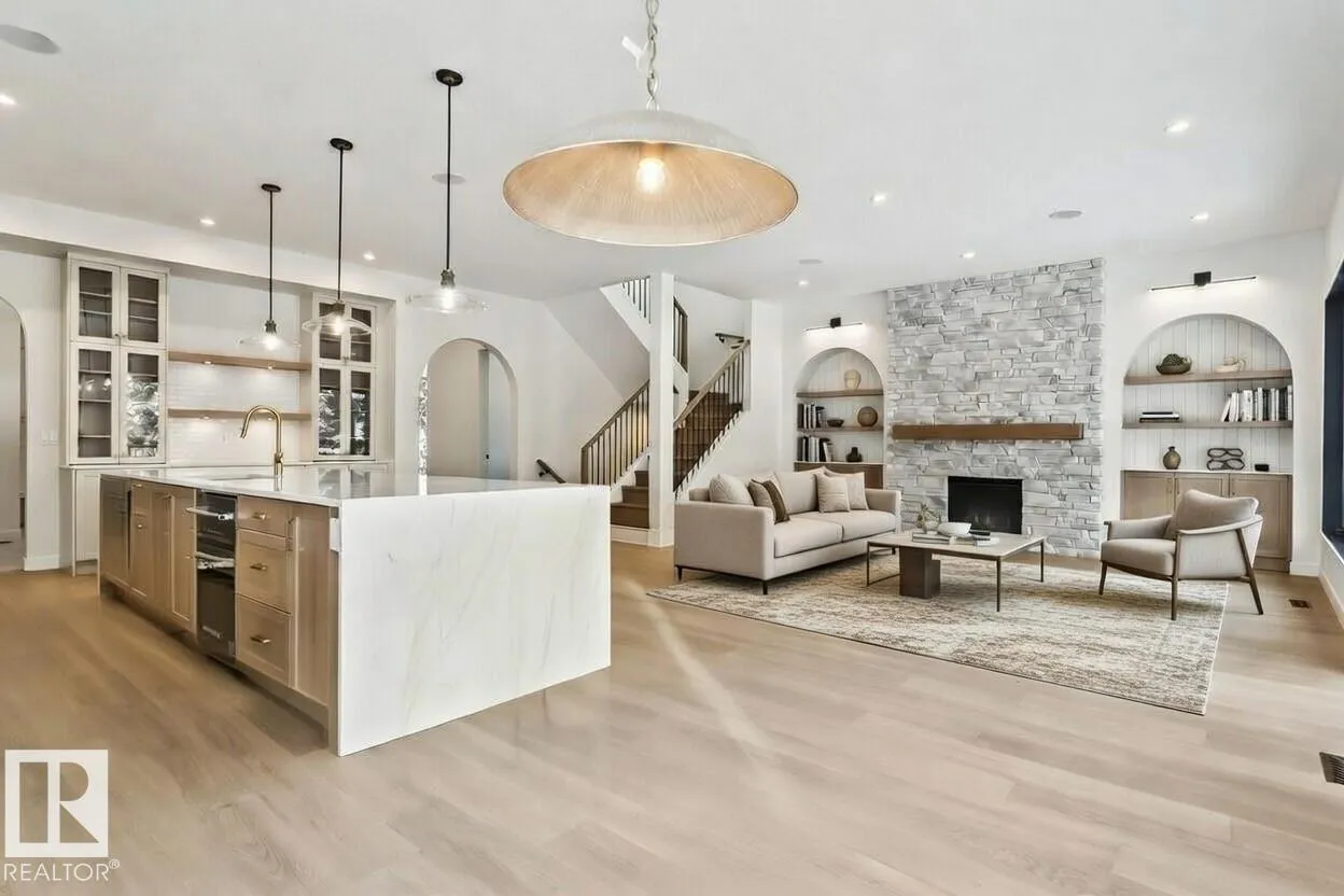 Stunning Riverside estate lot backing onto a natural storm pond with Big Lake views and sought-after southwest exposure. This architecturally refined home features 10â main floor ceilings, 8â doors, and a full Hardie Board exterior with cedar accents. The open-concept interior offers shaker cabinetry throughout, 9â kitchen cabinets with crown moulding, glass hutch cabinetry, quartz backsplash, upgraded hood fan, and premium KitchenAid appliances. Additional highlights include silgranit sinks with elegant gold fixtures, stained railings, upgraded lighting, a glass-enclosed den, and a striking plaster fireplace. The spa-inspired primary ensuite includes custom mirrors, gold plumbing, tiled niche, and upgraded tilework. Enjoy tranquil evenings on the covered deck overlooking water and nature with uninterrupted pond views. Ideally located steps from Lois Hole Provincial Park, scenic trails, downtown St. Albert, and convenient Anthony Henday access. All images shown are artist renderings and/or a show suite. (id:27476)