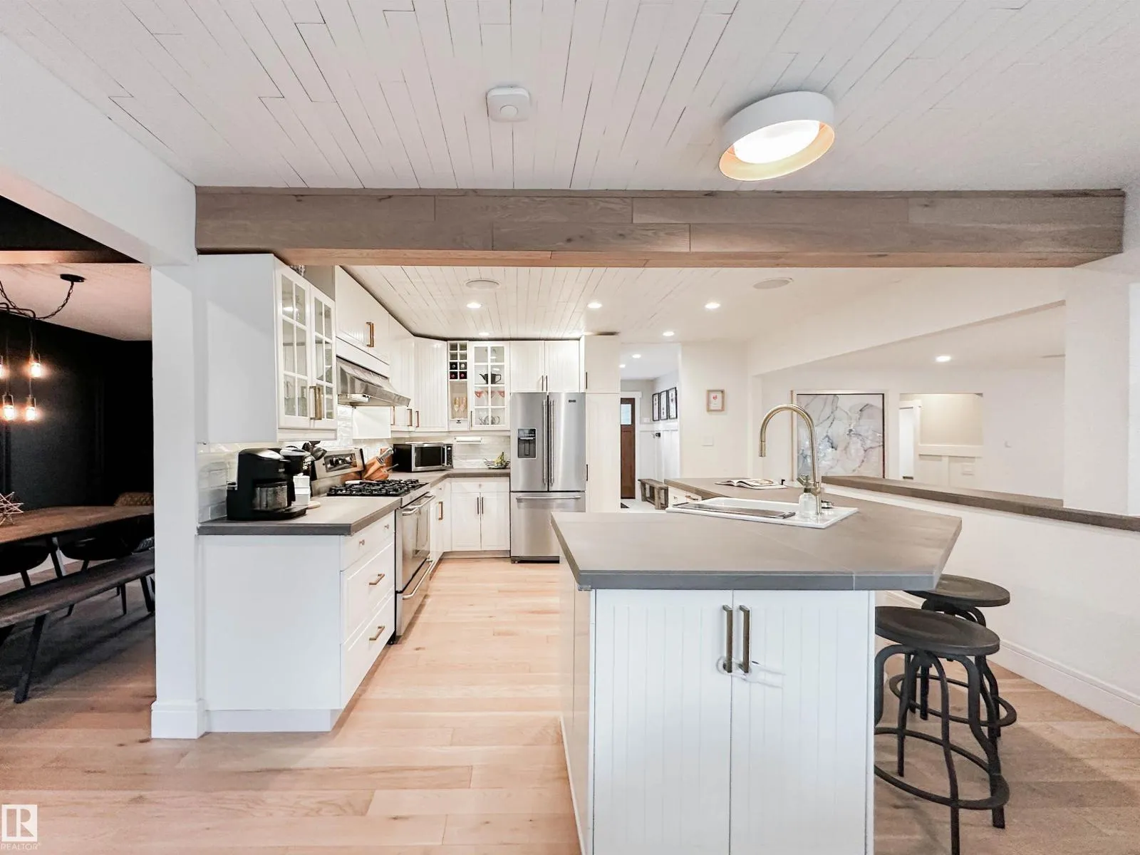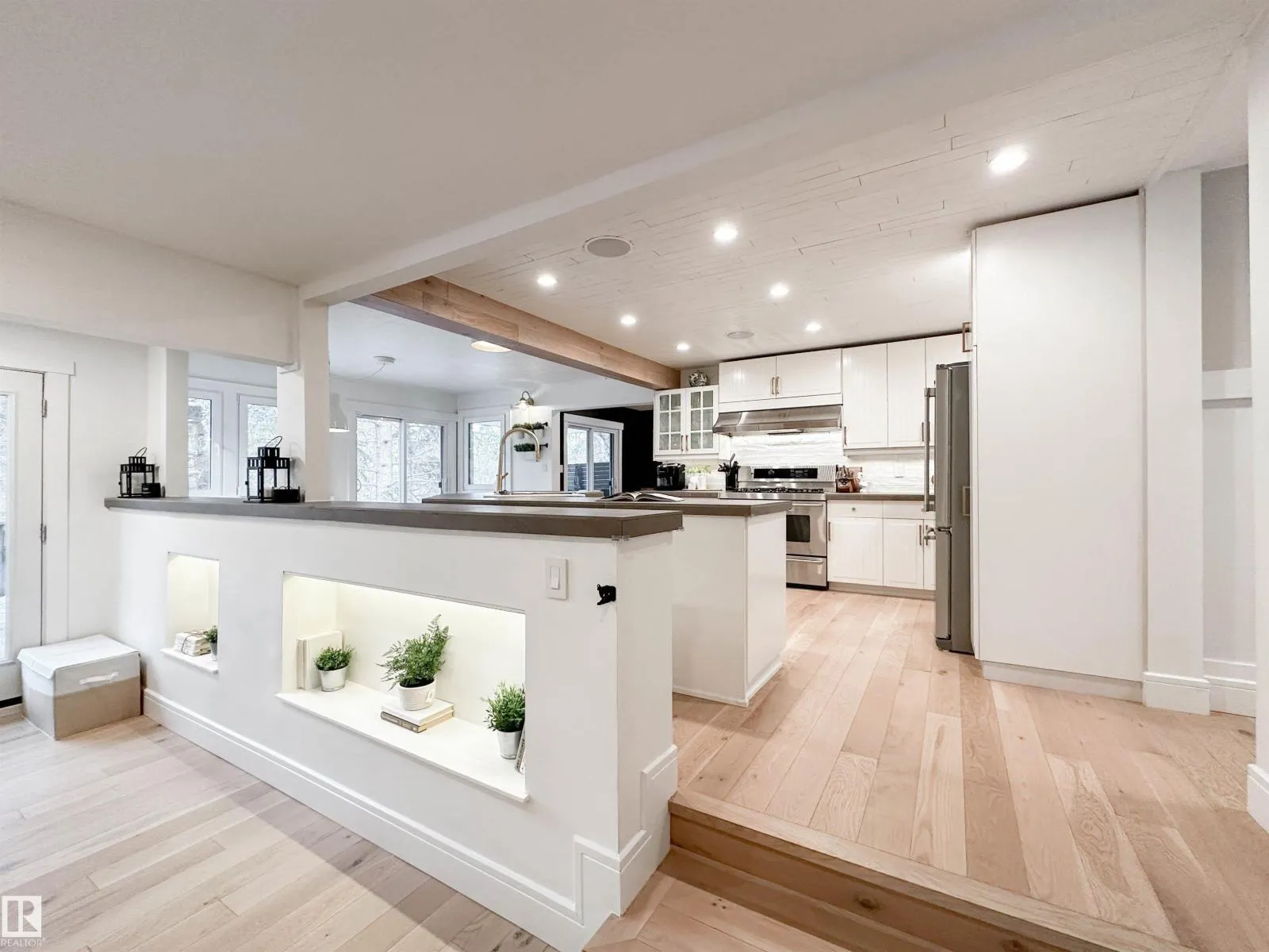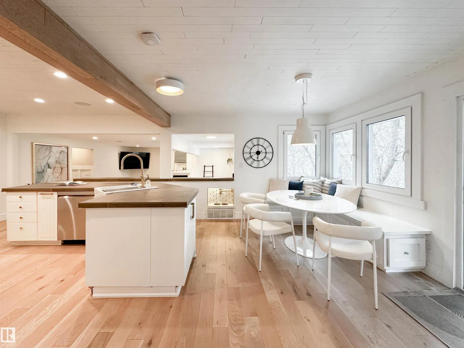 Welcome to this beautifully renovated Forest Lawn home, backing onto a peaceful ravine and located on a quiet, tree-lined street. This fully finished two-storey offers 5 bedrooms and a private, sunny west-facing backyard. The main floor features a bright open-concept layout with a stylish kitchen and cozy sitting nook, formal dining room, and spacious living area highlighted by a liquid-fuel fireplace. Direct deck access from the kitchen, dining, and living rooms makes entertaining effortless. A main-floor bedroom or office and 2pc bath complete this level. Upstairs offers a primary suite with 3pc ensuite & large barn door closet, plus two addâl bedrooms and a 4pc bath. The finished basement includes a bedroom, rec room, 3pc bath, laundry, and ample storage. Updates include shingles (2022), furnaces (2021), German tilt-turn windows, Hardie Board siding, new A/C, flooring, appliances, washer/dryer, basement bath renovation, built-in speakers, insulated heated garage, and updated driveway/sidewalk (2020). (id:27476)