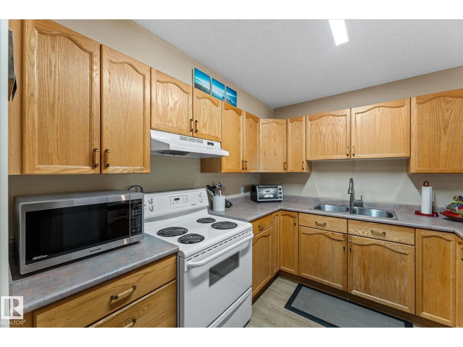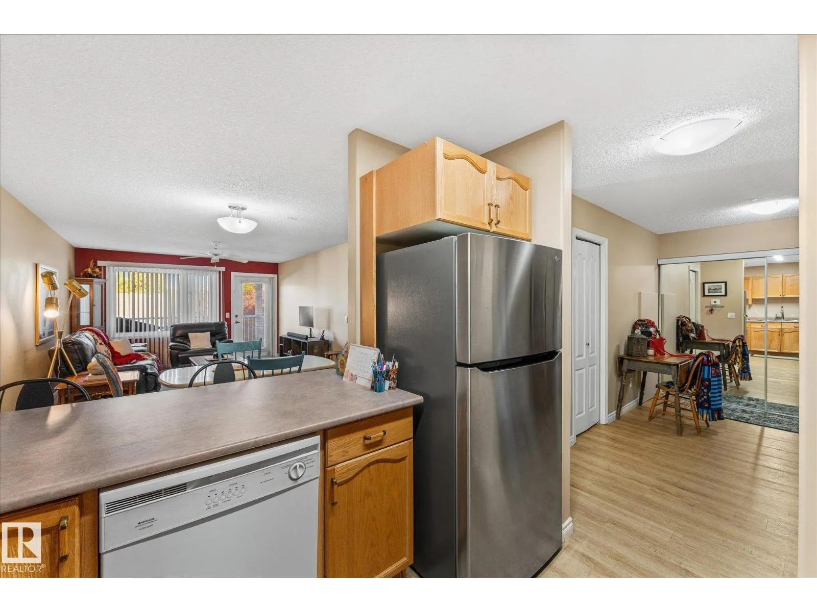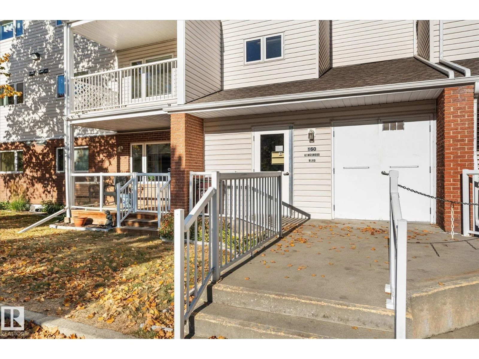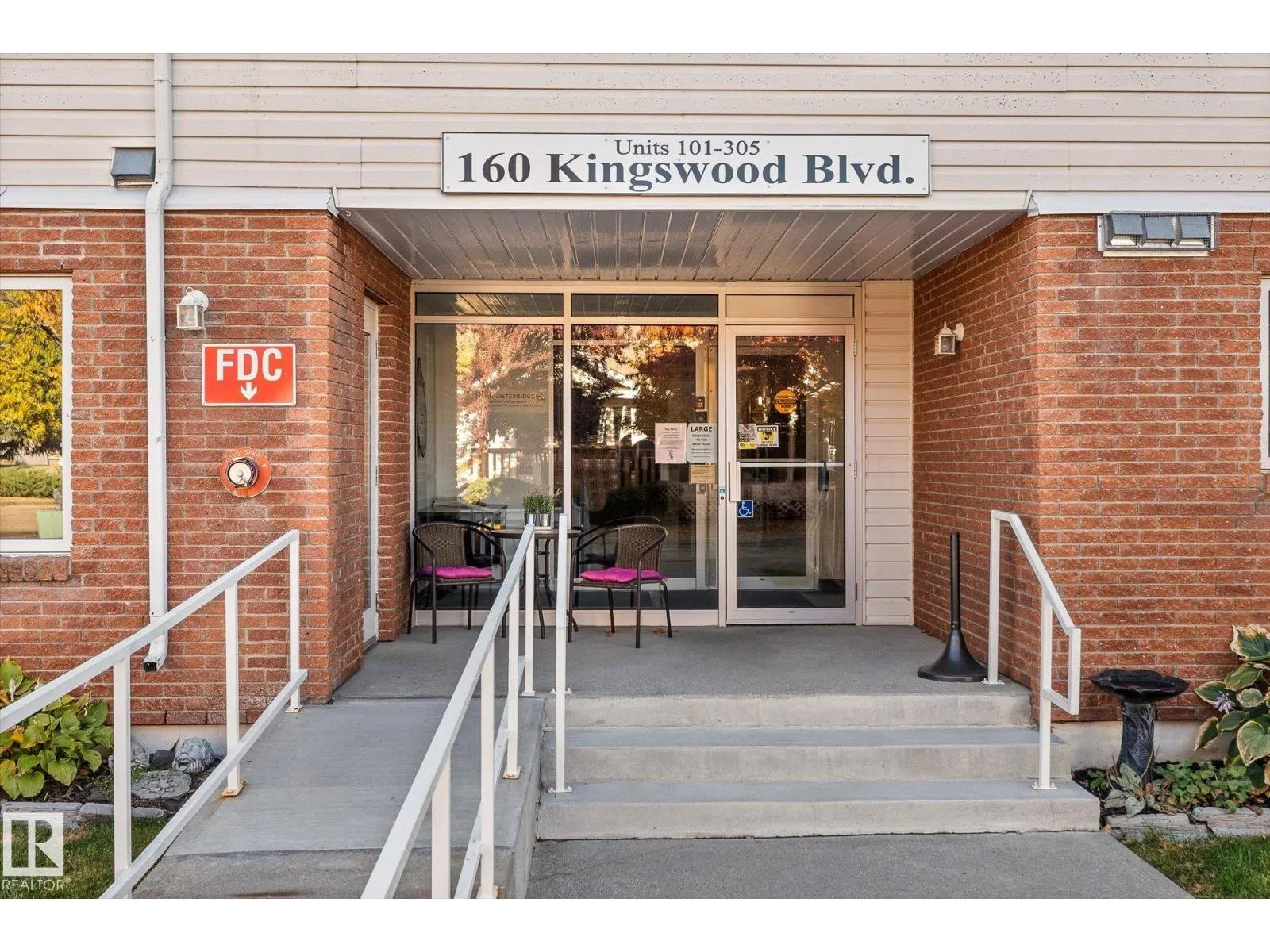 Enjoy comfortable, low-maintenance living in this bright and well-maintained 55+ condo in the desirable Kingswood neighbourhood, just minutes from the Servus Recreation Centre, scenic walking trails, and quick access to the Anthony Henday. The open-concept layout features vinyl plank flooring throughout, spacious kitchen with eating bar, inviting dining area, and a bright living room with access to a private balcony with natural gas hookup. Thoughtful design and wide spaces make the unit functional and easy to navigate, with the entire unit designed to be wheelchair accessible. The generous primary suite easily accommodates a king-size bed and has convenient access to the full ensuite with an oversized 6' soaker tub. Additional highlights include a versatile den space, in-suite laundry, heated underground parking with storage located near the elevator. Residents enjoy excellent amenities including a party room, games area, library, and guest suite for visitors, and condo fees include heat and water. (id:27476)