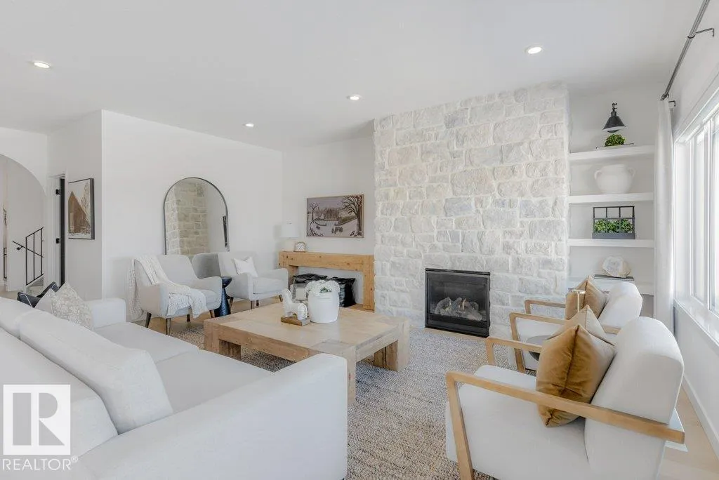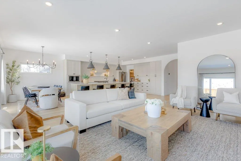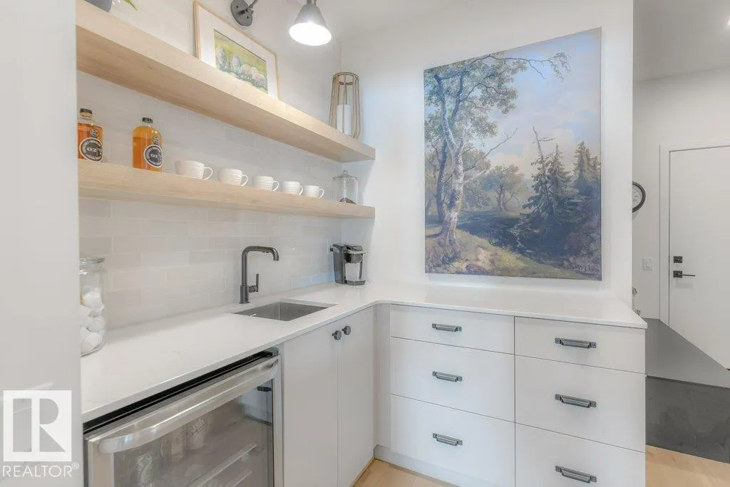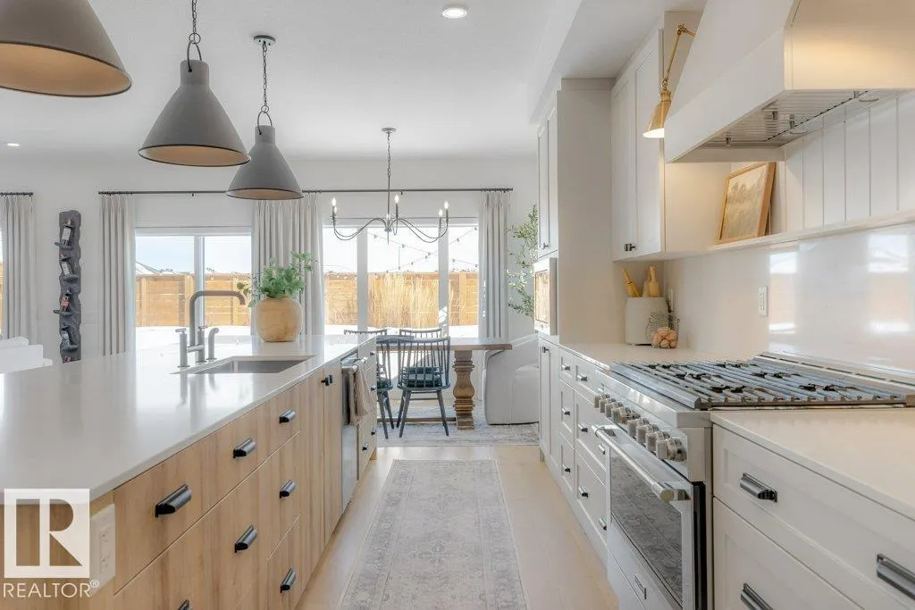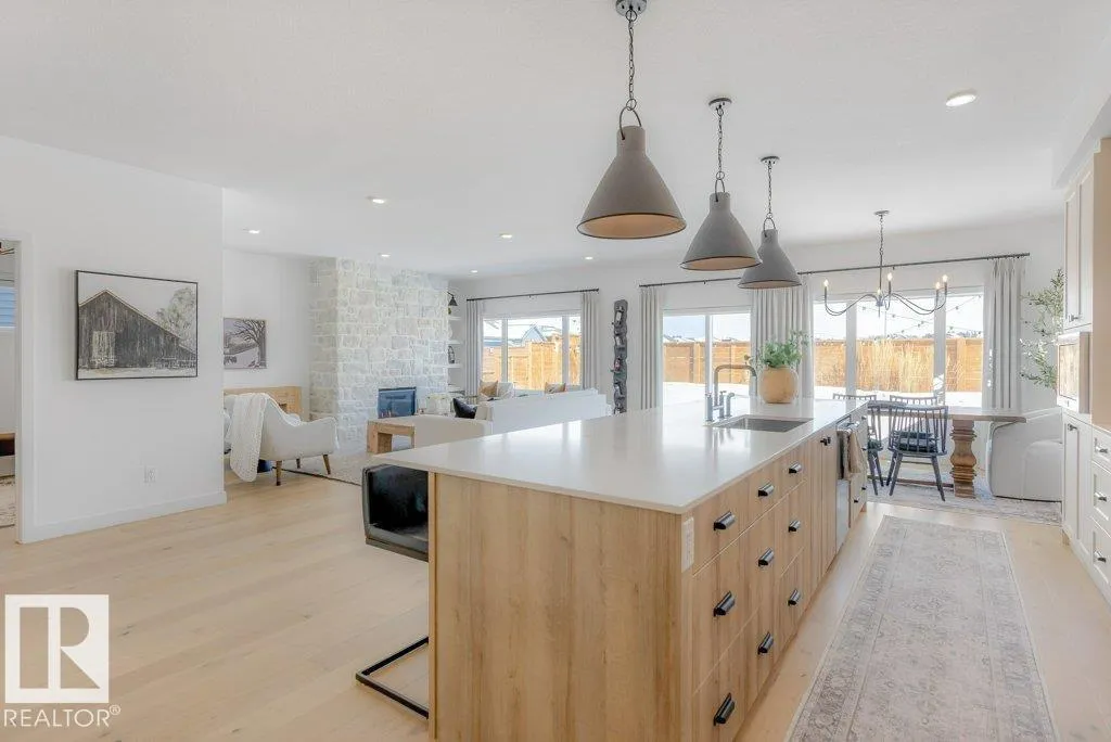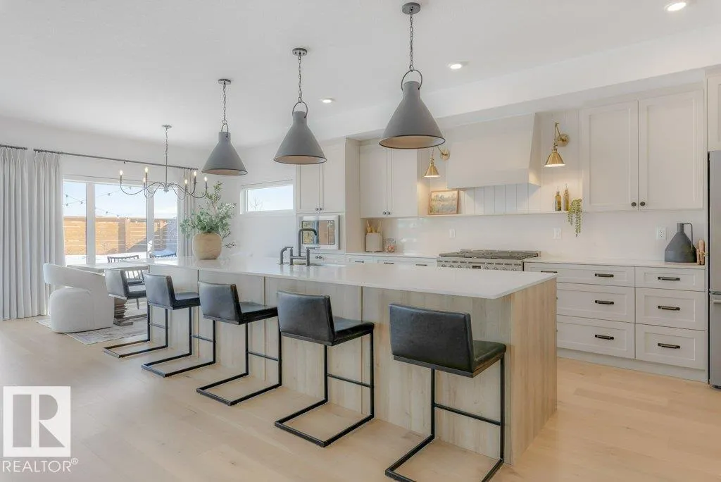 Stunning custom-built estate home in Riverside, St. Albert offering 2,633 sq. ft. of beautifully finished living space. This move-in ready home features 10â ceilings, gorgeous engineered hardwood floors and a bright great room with stunning stone gas fireplace. The chefâs kitchen is designed for entertaining with a 13-ft island, farmhouse faucet, quartz backsplash, 6-burner gas stove with custom shiplap feature wall and a fully equipped butlerâs pantry with sink, bar fridge and built-in shelving. A striking wine room with fluted glass door adds a unique touch. Upstairs offers a large bonus room, a spa-like primary suite with 2 walk-in closets and luxurious ensuite, plus two spacious bedrooms connected by a Jack & Jill bathroom. Upper floor laundry room as well. Enjoy central A/C, hot water on demand, security system and roughed-in EV charger. The professionally landscaped yard features a composite deck, rock retaining wall and lighting. Oversized insulated triple garage completes this exceptional home. (id:27476)