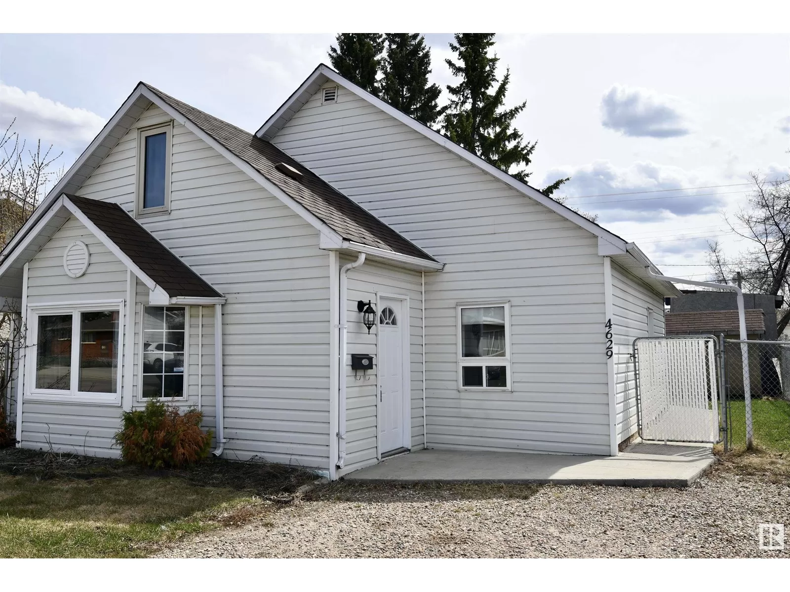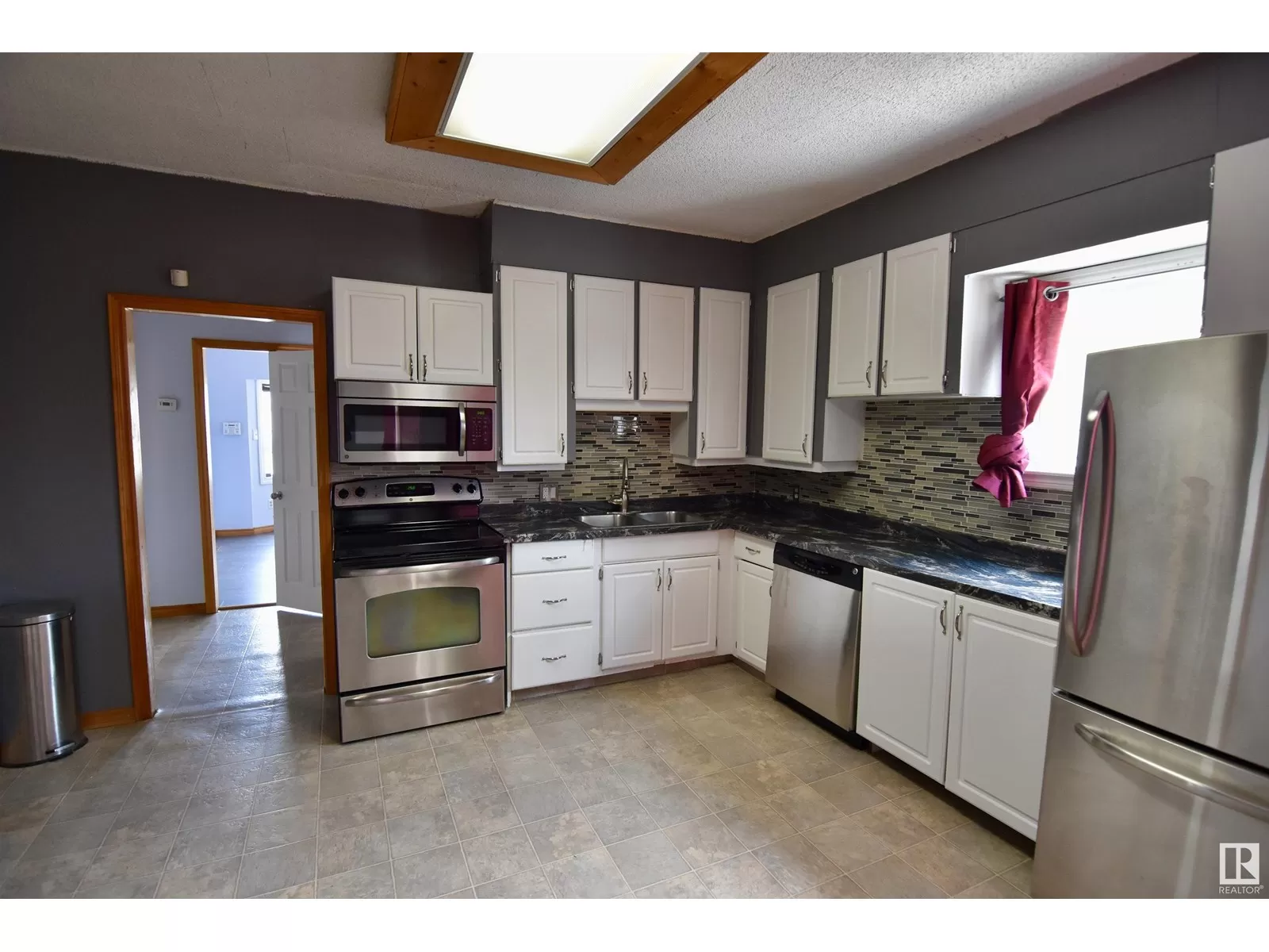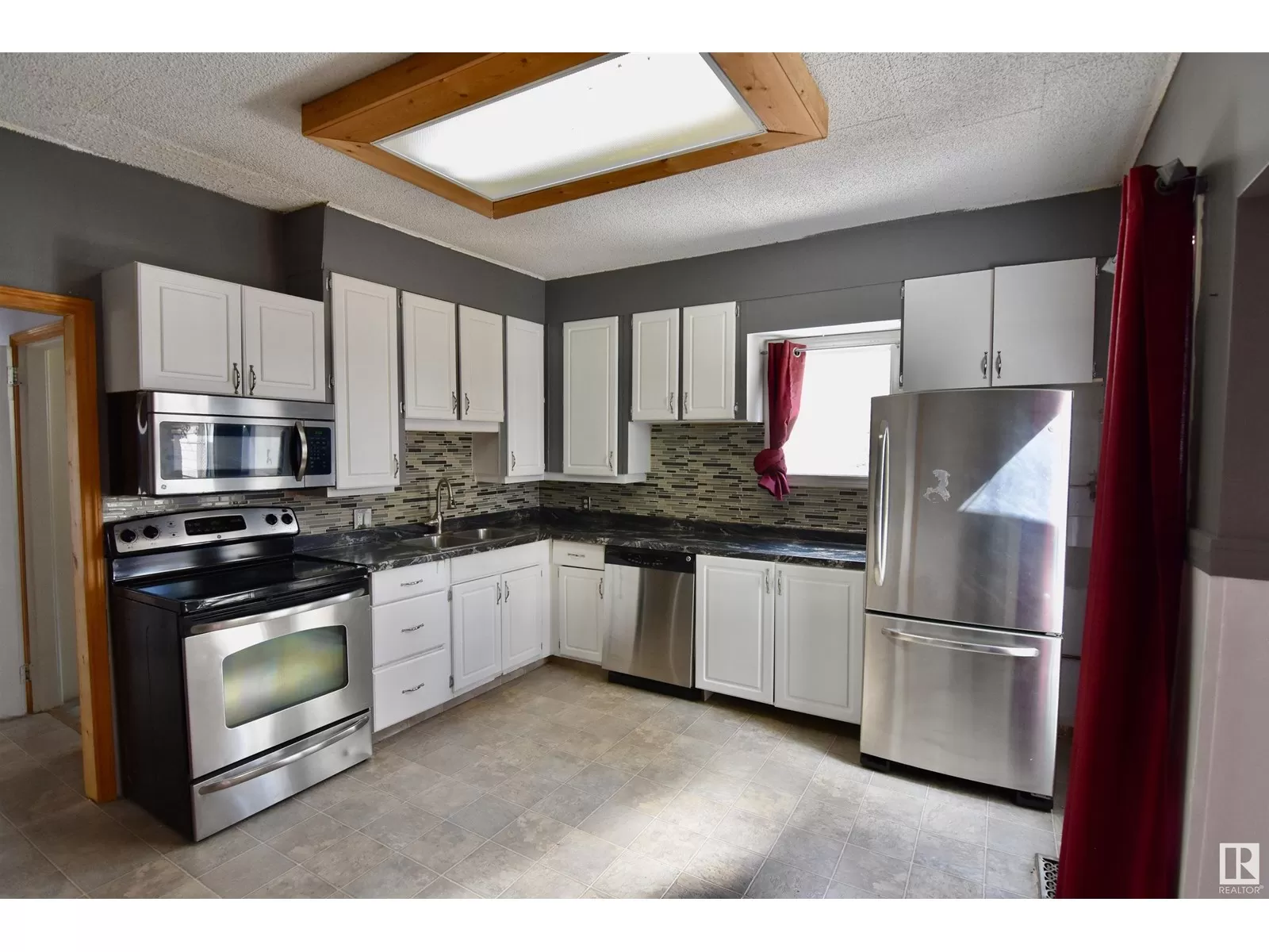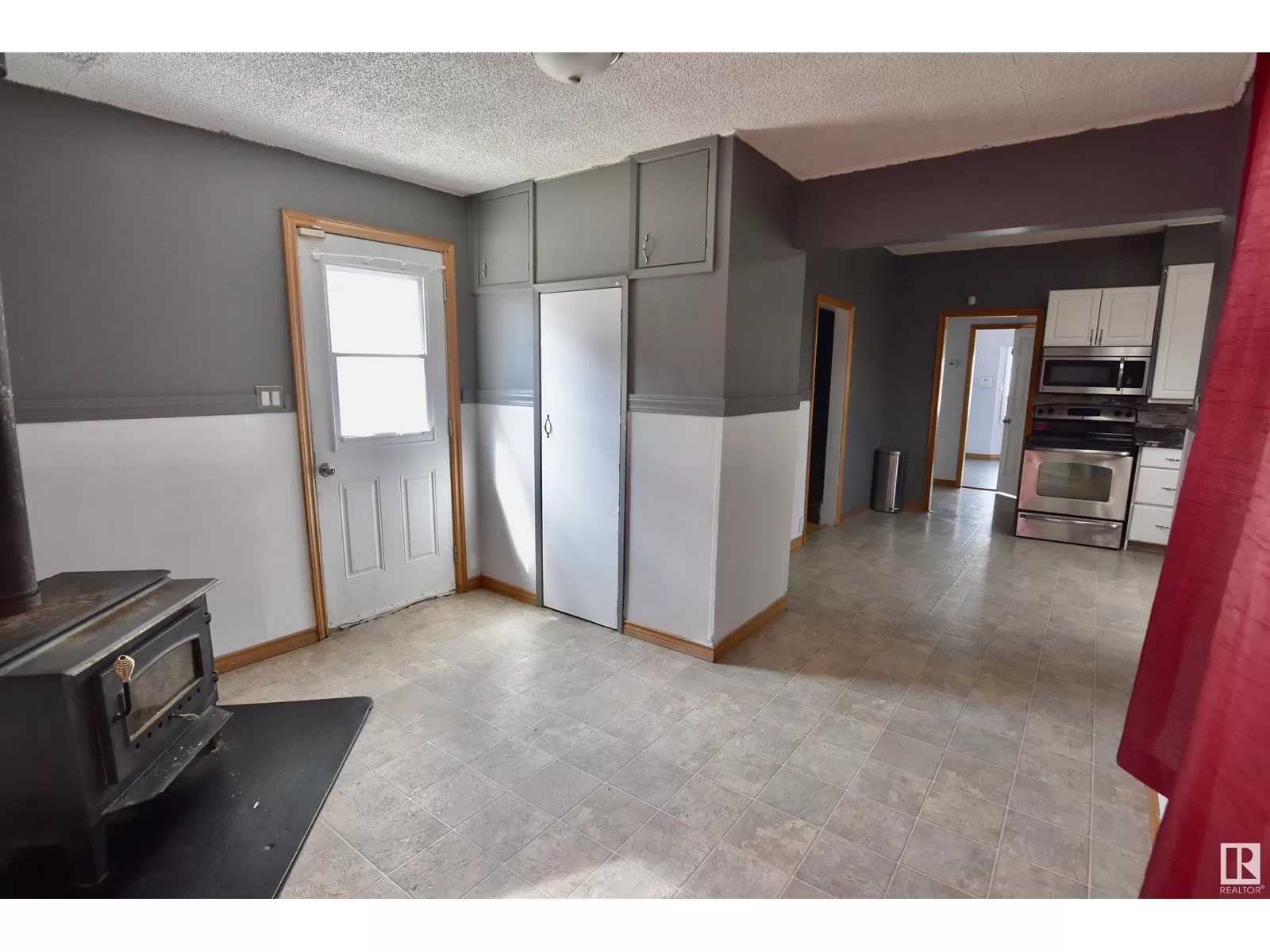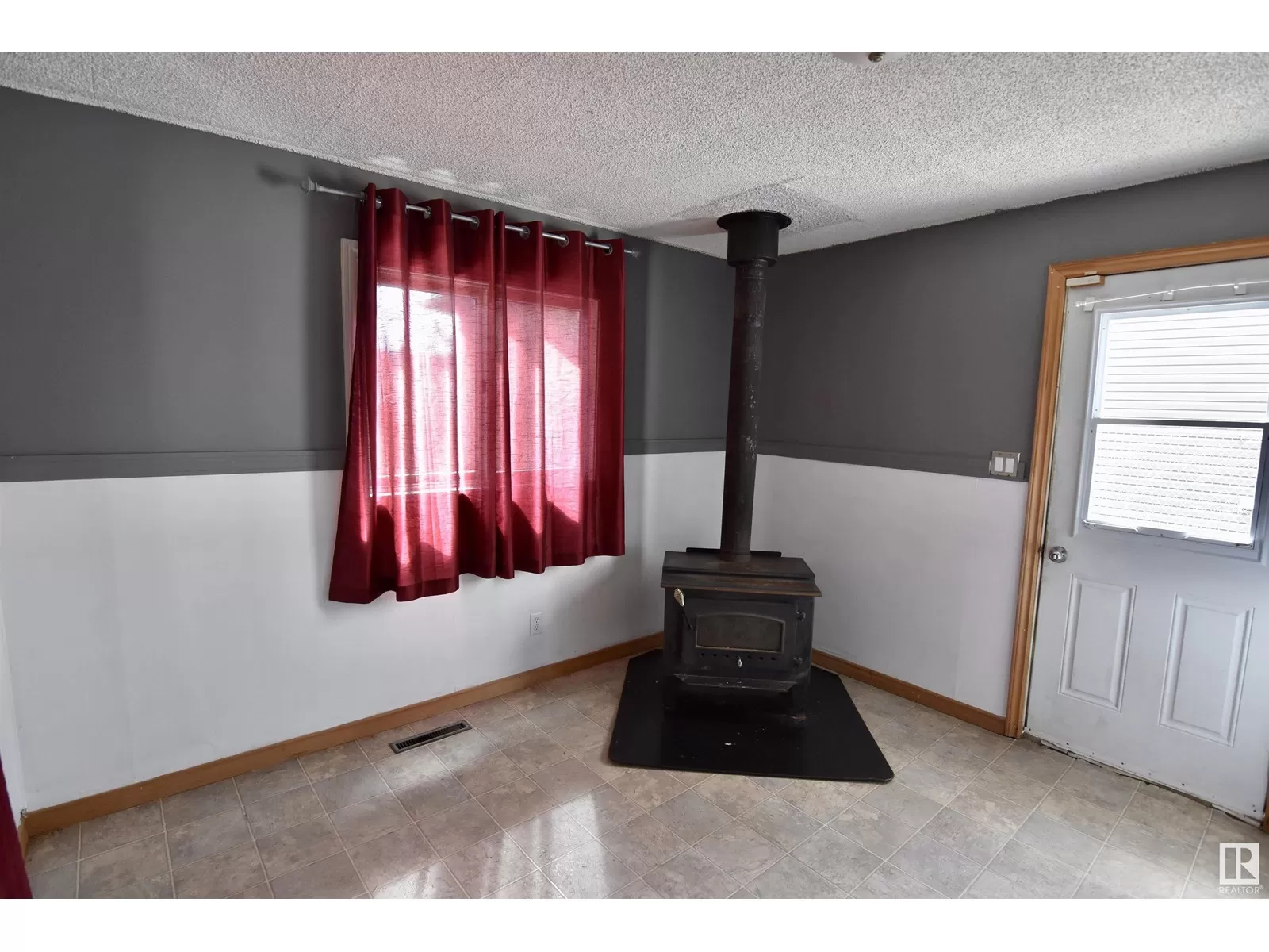Unique character home close to schools! Tired of cookie-cutter homes? This 1940, 3 bedroom home is apt to catch your attention. The front living room boasts vinyl plank flooring, a bright bay window and a traditional tray ceiling. The eat-in kitchen has seen some updates and features white cabinetry, modern back splash & stainless steel appliances. The back entrance is is cozy with its wood stove and seating area. You'll find 2 bedrooms on the main floor, one featuring the laundry facilities. Upstairs is one more charming bedroom and flex space that's ideal for a play area, reading area or extra storage. Outside is fully fenced with 2 storage sheds and a small patio area. With a bit of your own elbow grease and imagination, this could be your ideal first home or possibly a rental for some additional income. (id:27476)