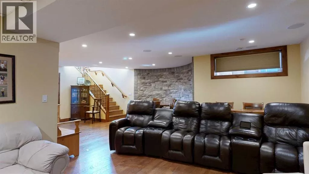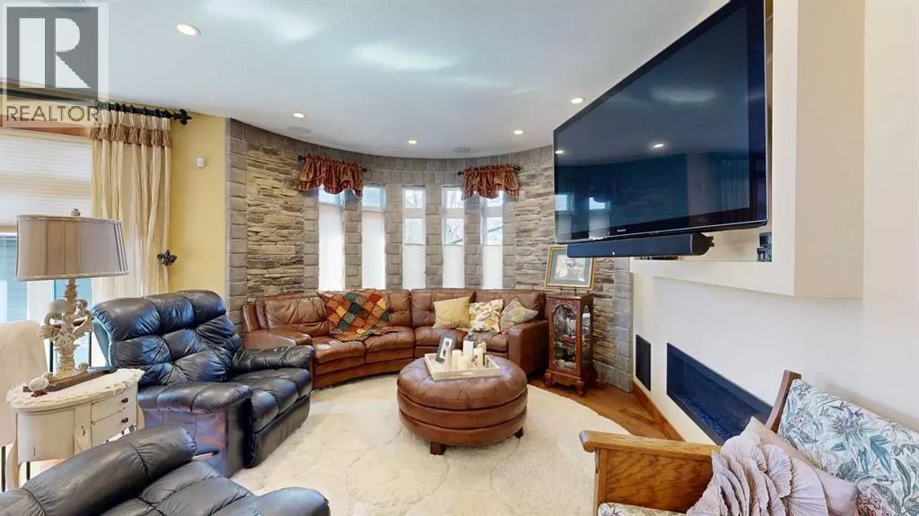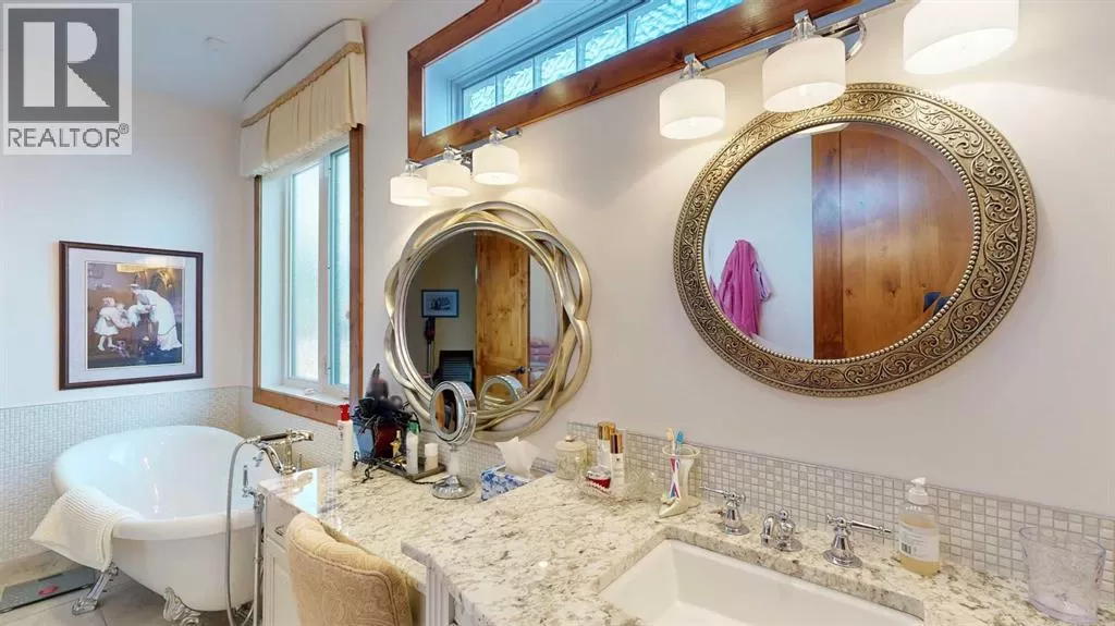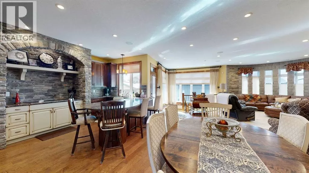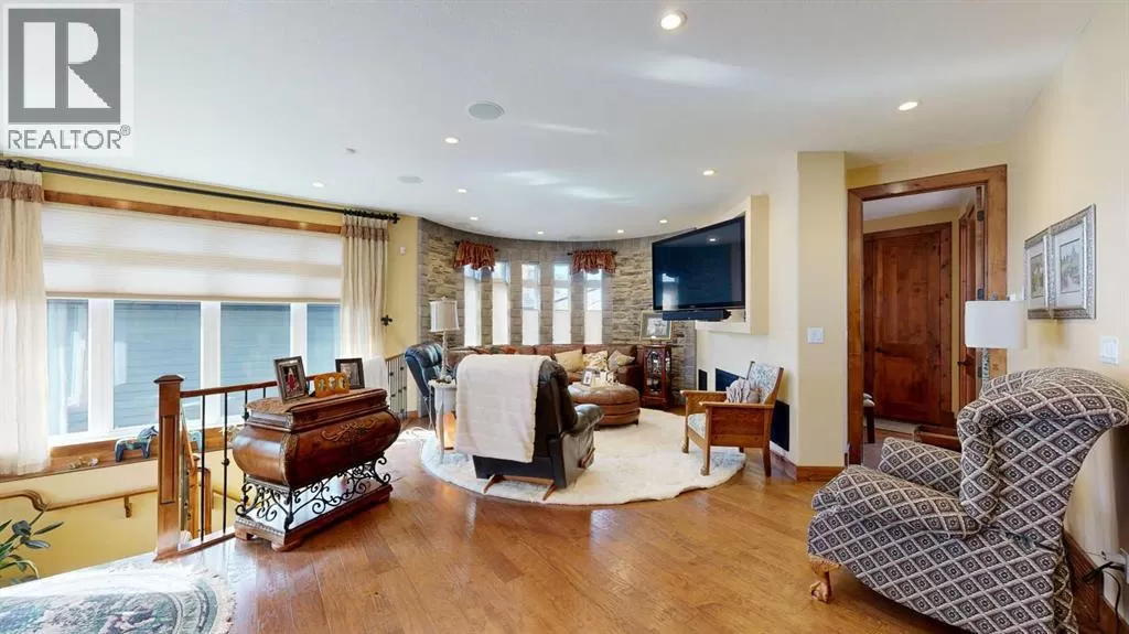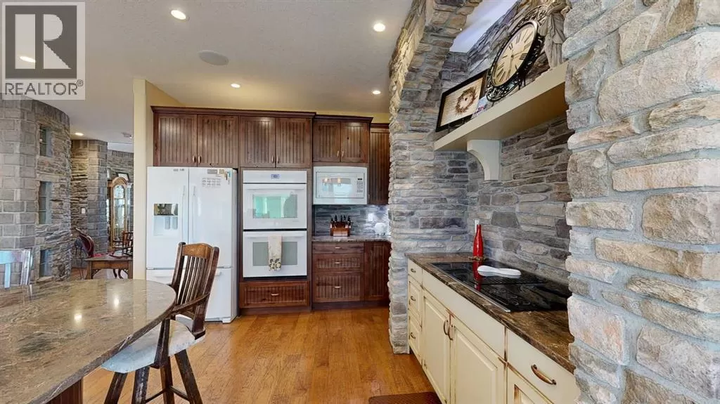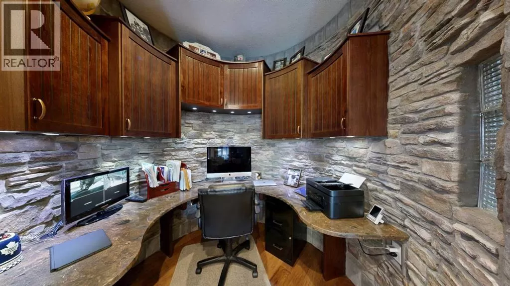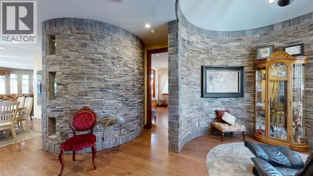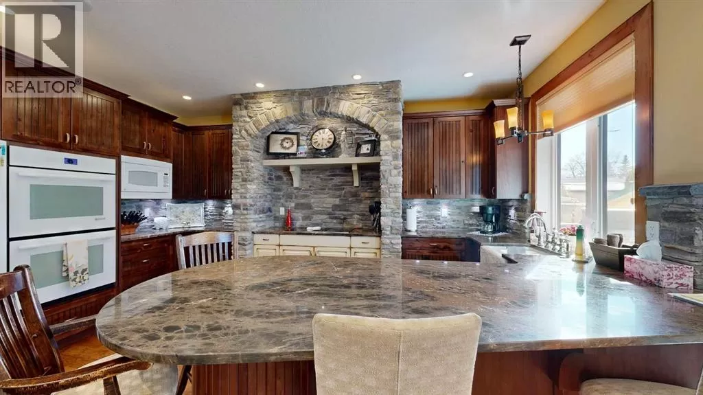 This stunning, custom designed home is a masterpiece of architecture and craftsmanship. Carefully and meticulously built by a master craftsman, every corner of this home has been developed for the ultimate living experience. Inside, the floors are rich hardwood and there are a number of curved walls done in Country Ledgestone. To the right is a curved den which has a vision art TV and unique custom windows. The heart of this home is the gourmet kitchen, featuring solid alder cabinets, granite countertops, a double oven, and a stone arch encompassing the cooktop. The Solas Heat & Glo fireplace beside the dining room table is a standout feature. Adjacent to the dining room, a curved stone wall creates an office with custom-made curved cabinets. The living room is spacious and inviting, with a gas fireplace, a large screen TV for entertainment, and garden door access to the back deck. The primary bedroom is a generous size, adorned with elegant wallpaper, crystal chandeliers, and an adjoining ensuite. This bathroom features a clawfoot tub, opulent granite shower and countertops, heated tile floor, and a heated towel bar. This bathroom can also be accessed via the back entrance, which also houses the washer and dryer. There is a 2-pc bathroom which is accented with a stone wall. Heading downstairs, there is another curved stone wall leading the way to the media room. Down the hall, there are 2 more bedrooms, one is oversized with 3 built in twin beds and 2 closets. There is a large storage room and utility room with a boiler. Modern amenities include 6 TVs with their own receivers (2 are 3D), 7 pairs of 3D glasses, 8â knotty alder doors on main floor (7â downstairs), wide trim and baseboards, transoms above exterior doors, and LED pot lights. The home was well constructed with an ICF foundation and triple pane windows. The front facade of this home is beautifully done in stone and the yard is low maintenance with grass, attractive shrub beds, and exposed aggregate sidew alk. In the back, there is a detached, 3 car garage with underfloor heat and a full wall of cabinets. The area between the house and garage is completely fenced. This home is just a short walk to main street shopping and to the schools, making it suitable for families in any stage of life. (id:27476)