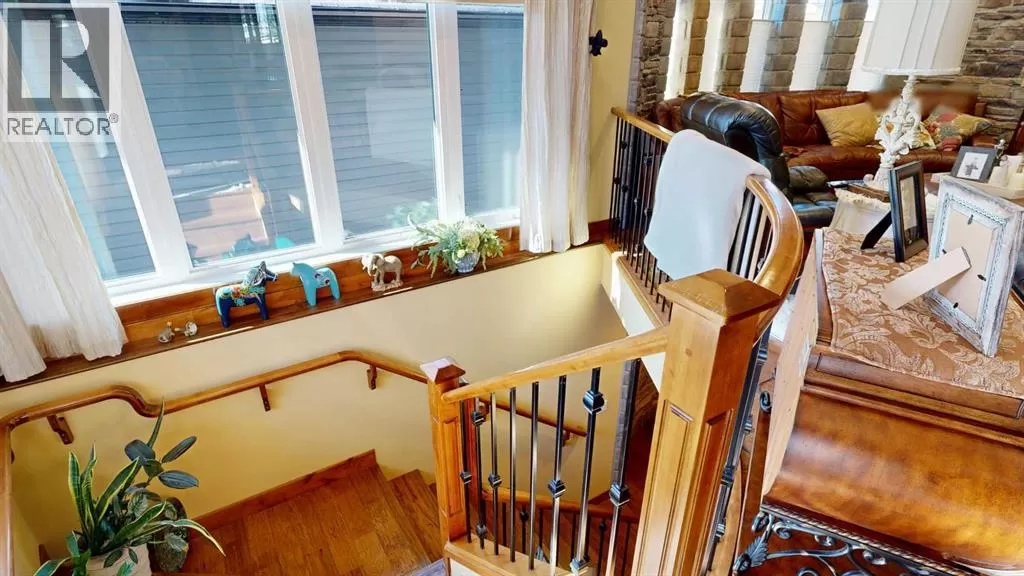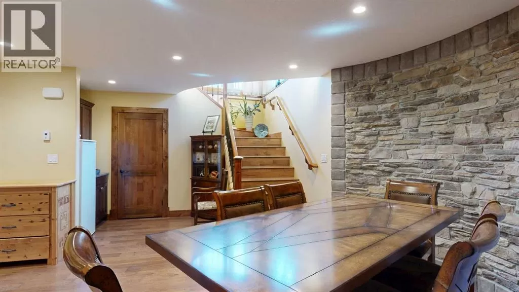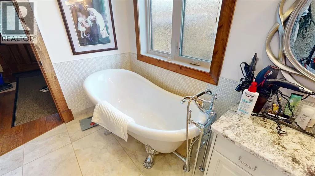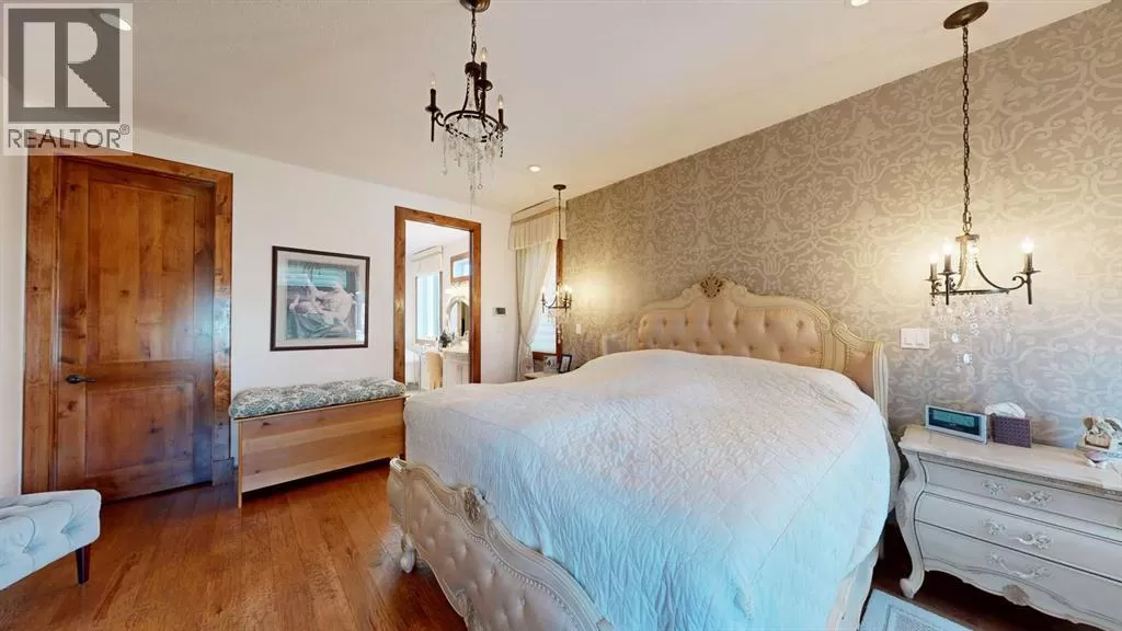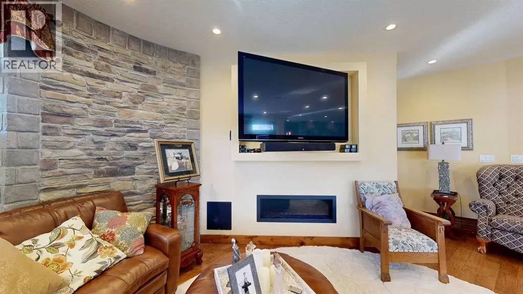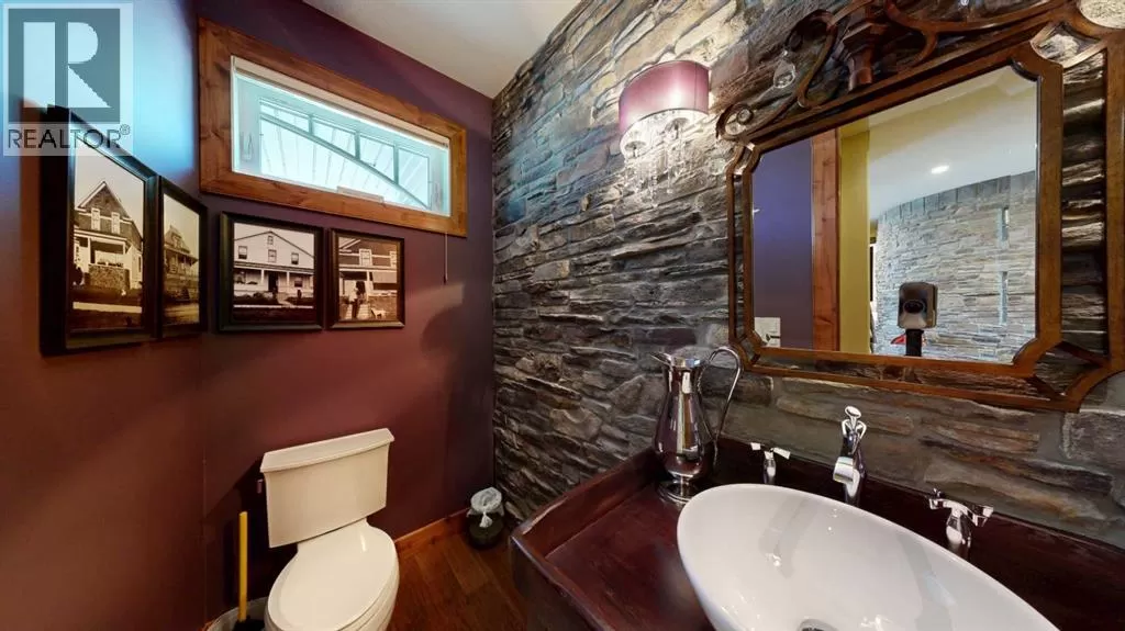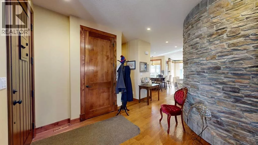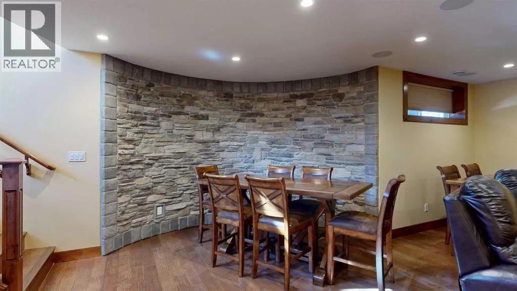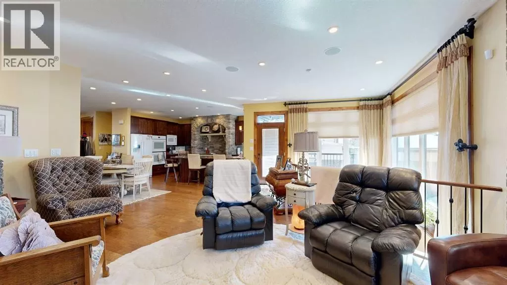 This stunning, custom designed home is a masterpiece of architecture and craftsmanship. Carefully and meticulously built by a master craftsman, every corner of this home has been developed for the ultimate living experience. Inside, the floors are rich hardwood and there are a number of curved walls done in Country Ledgestone. To the right is a curved den which has a vision art TV and unique custom windows. The heart of this home is the gourmet kitchen, featuring solid alder cabinets, granite countertops, a double oven, and a stone arch encompassing the cooktop. The Solas Heat & Glo fireplace beside the dining room table is a standout feature. Adjacent to the dining room, a curved stone wall creates an office with custom-made curved cabinets. The living room is spacious and inviting, with a gas fireplace, a large screen TV for entertainment, and garden door access to the back deck. The primary bedroom is a generous size, adorned with elegant wallpaper, crystal chandeliers, and an adjoining ensuite. This bathroom features a clawfoot tub, opulent granite shower and countertops, heated tile floor, and a heated towel bar. This bathroom can also be accessed via the back entrance, which also houses the washer and dryer. There is a 2-pc bathroom which is accented with a stone wall. Heading downstairs, there is another curved stone wall leading the way to the media room. Down the hall, there are 2 more bedrooms, one is oversized with 3 built in twin beds and 2 closets. There is a large storage room and utility room with a boiler. Modern amenities include 6 TVs with their own receivers (2 are 3D), 7 pairs of 3D glasses, 8â knotty alder doors on main floor (7â downstairs), wide trim and baseboards, transoms above exterior doors, and LED pot lights. The home was well constructed with an ICF foundation and triple pane windows. The front facade of this home is beautifully done in stone and the yard is low maintenance with grass, attractive shrub beds, and exposed aggregate sidew alk. In the back, there is a detached, 3 car garage with underfloor heat and a full wall of cabinets. The area between the house and garage is completely fenced. This home is just a short walk to main street shopping and to the schools, making it suitable for families in any stage of life. (id:27476)
