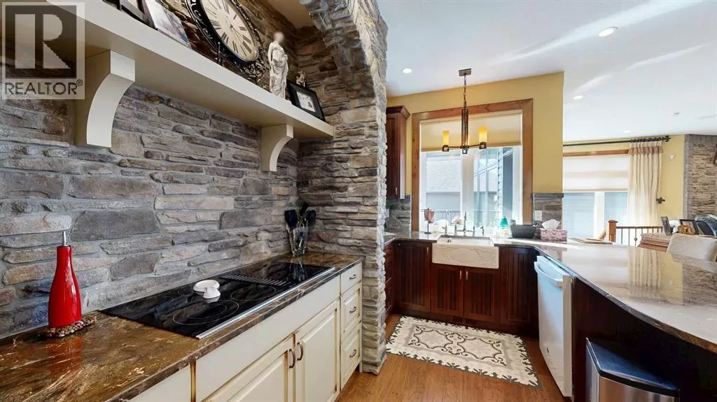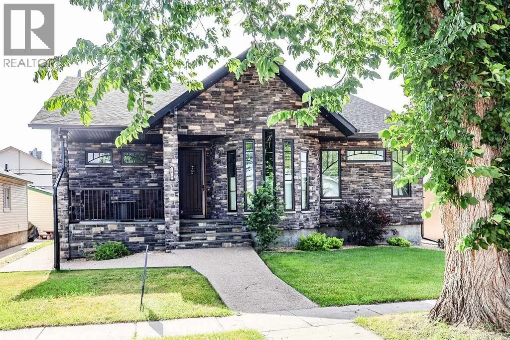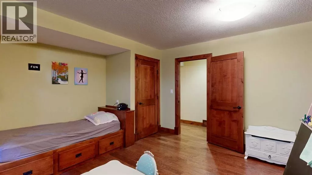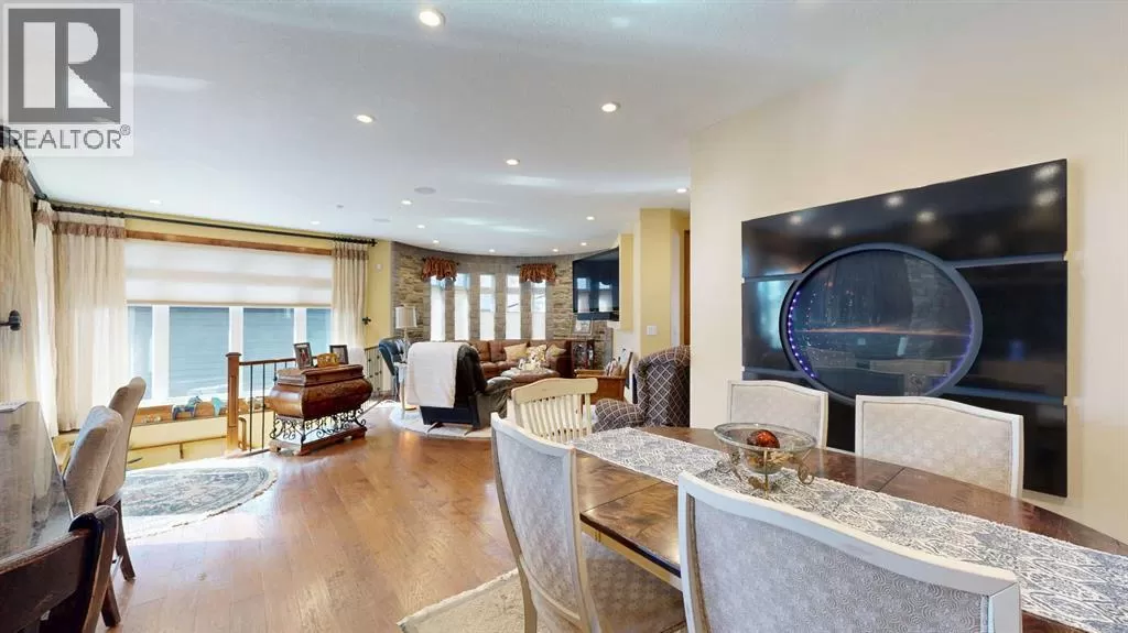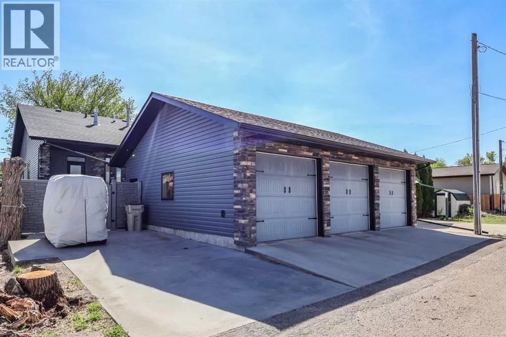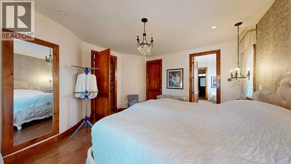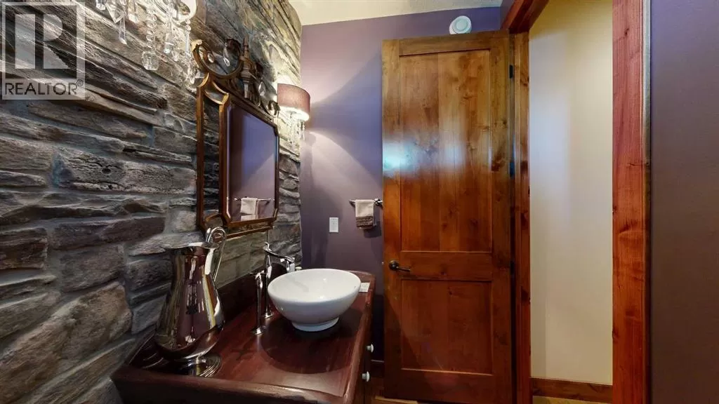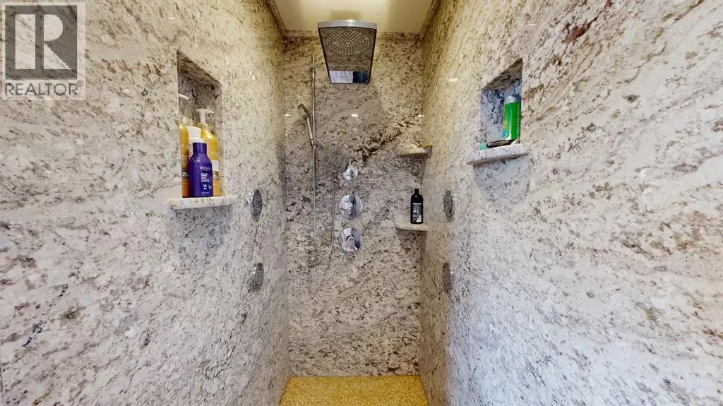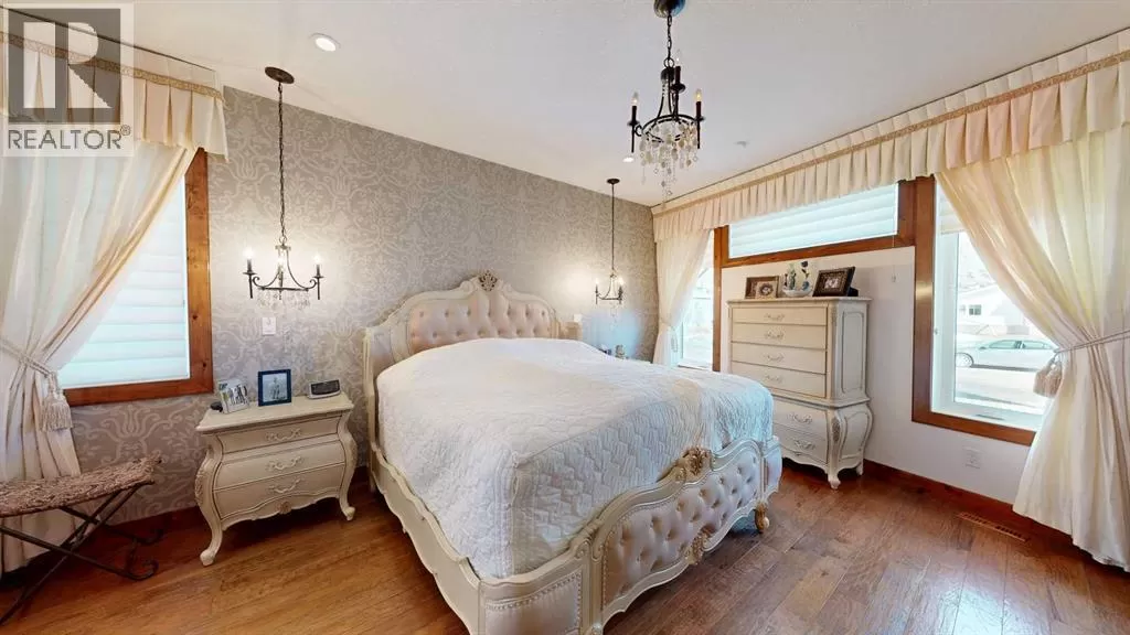 This stunning, custom designed home is a masterpiece of architecture and craftsmanship. Carefully and meticulously built by a master craftsman, every corner of this home has been developed for the ultimate living experience. Inside, the floors are rich hardwood and there are a number of curved walls done in Country Ledgestone. To the right is a curved den which has a vision art TV and unique custom windows. The heart of this home is the gourmet kitchen, featuring solid alder cabinets, granite countertops, a double oven, and a stone arch encompassing the cooktop. The Solas Heat & Glo fireplace beside the dining room table is a standout feature. Adjacent to the dining room, a curved stone wall creates an office with custom-made curved cabinets. The living room is spacious and inviting, with a gas fireplace, a large screen TV for entertainment, and garden door access to the back deck. The primary bedroom is a generous size, adorned with elegant wallpaper, crystal chandeliers, and an adjoining ensuite. This bathroom features a clawfoot tub, opulent granite shower and countertops, heated tile floor, and a heated towel bar. This bathroom can also be accessed via the back entrance, which also houses the washer and dryer. There is a 2-pc bathroom which is accented with a stone wall. Heading downstairs, there is another curved stone wall leading the way to the media room. Down the hall, there are 2 more bedrooms, one is oversized with 3 built in twin beds and 2 closets. There is a large storage room and utility room with a boiler. Modern amenities include 6 TVs with their own receivers (2 are 3D), 7 pairs of 3D glasses, 8â knotty alder doors on main floor (7â downstairs), wide trim and baseboards, transoms above exterior doors, and LED pot lights. The home was well constructed with an ICF foundation and triple pane windows. The front facade of this home is beautifully done in stone and the yard is low maintenance with grass, attractive shrub beds, and exposed aggregate sidew alk. In the back, there is a detached, 3 car garage with underfloor heat and a full wall of cabinets. The area between the house and garage is completely fenced. This home is just a short walk to main street shopping and to the schools, making it suitable for families in any stage of life. (id:27476)
