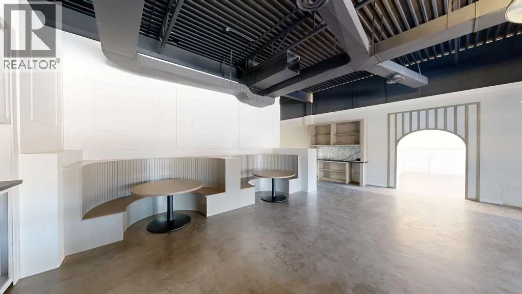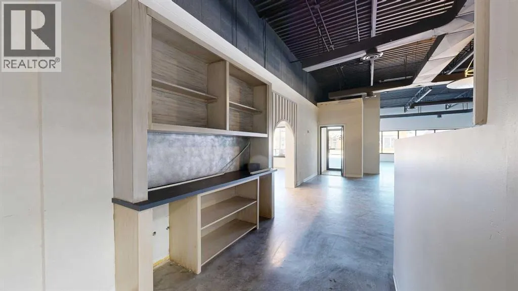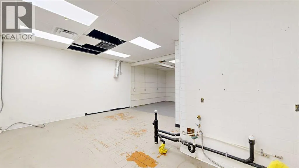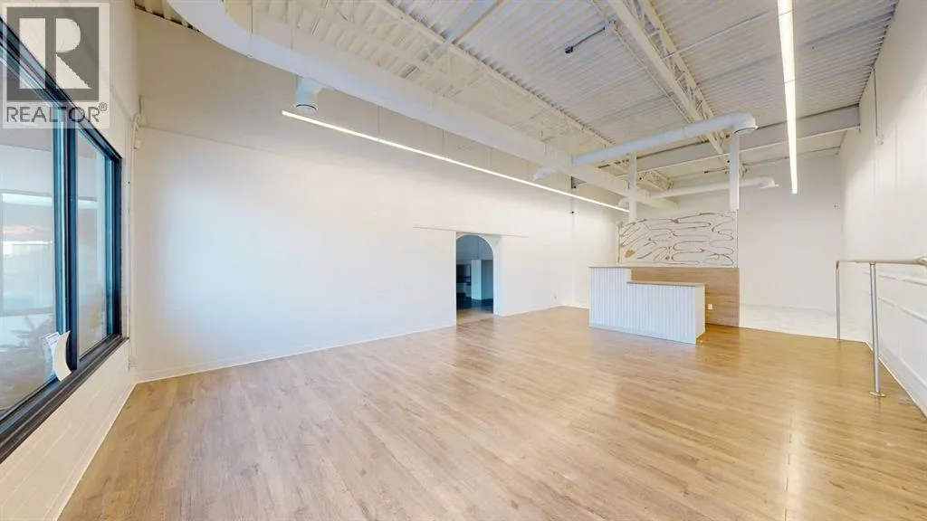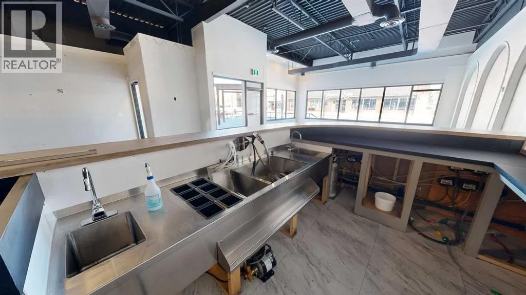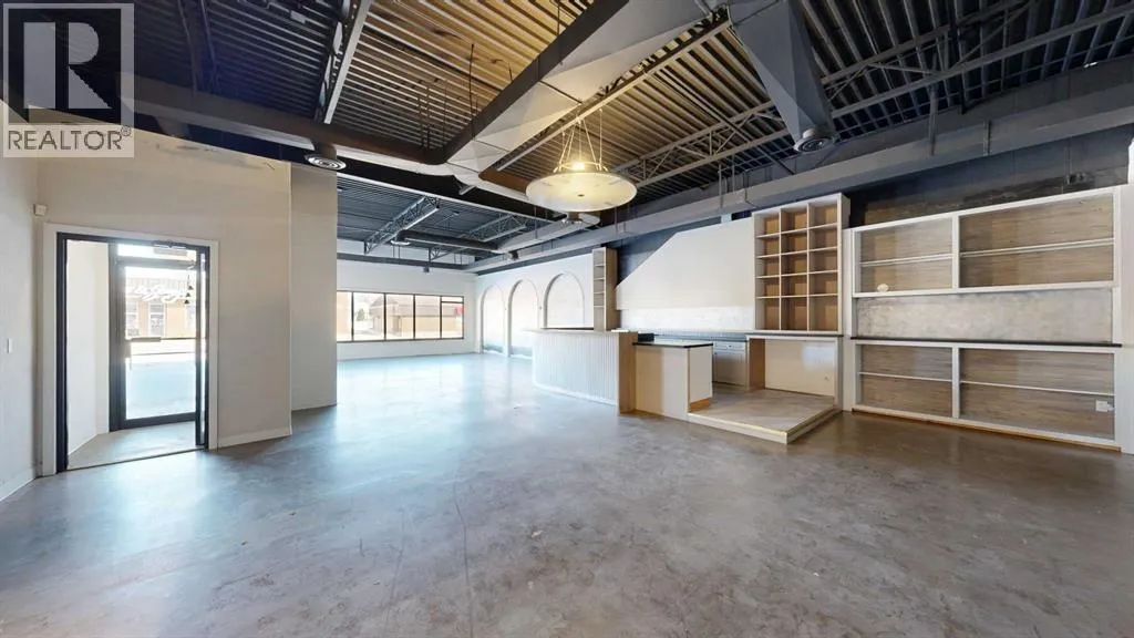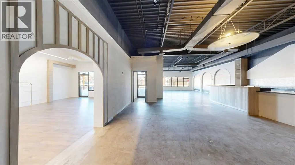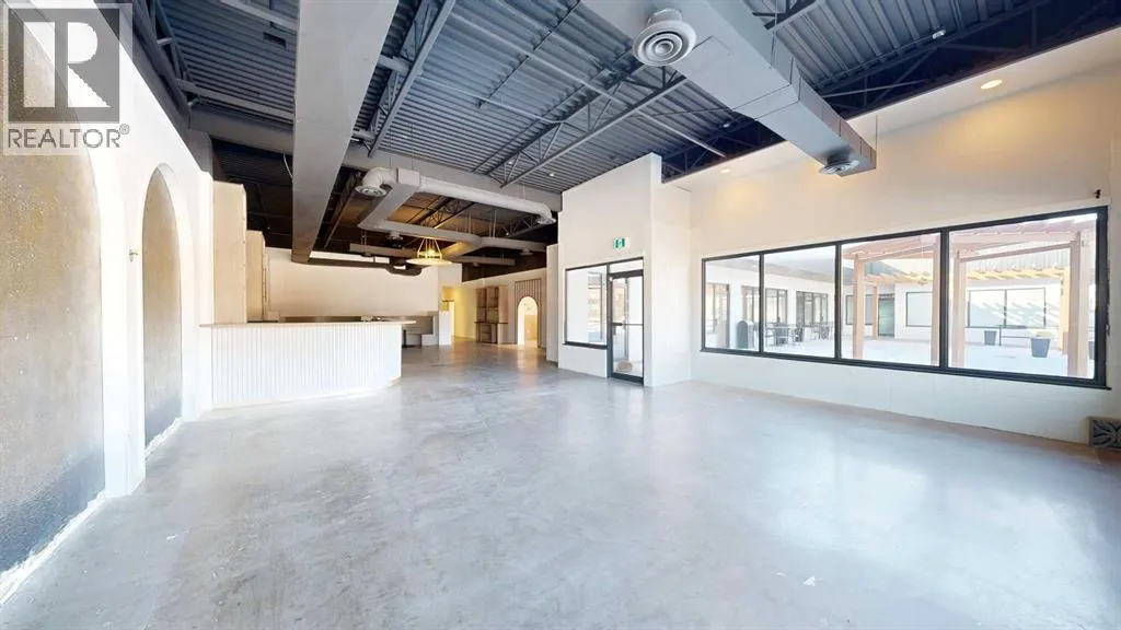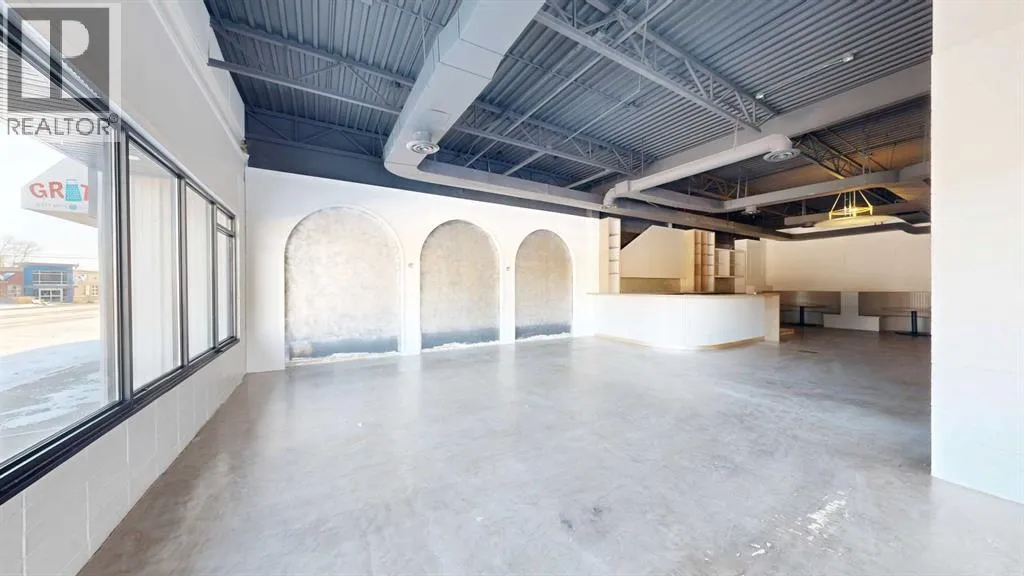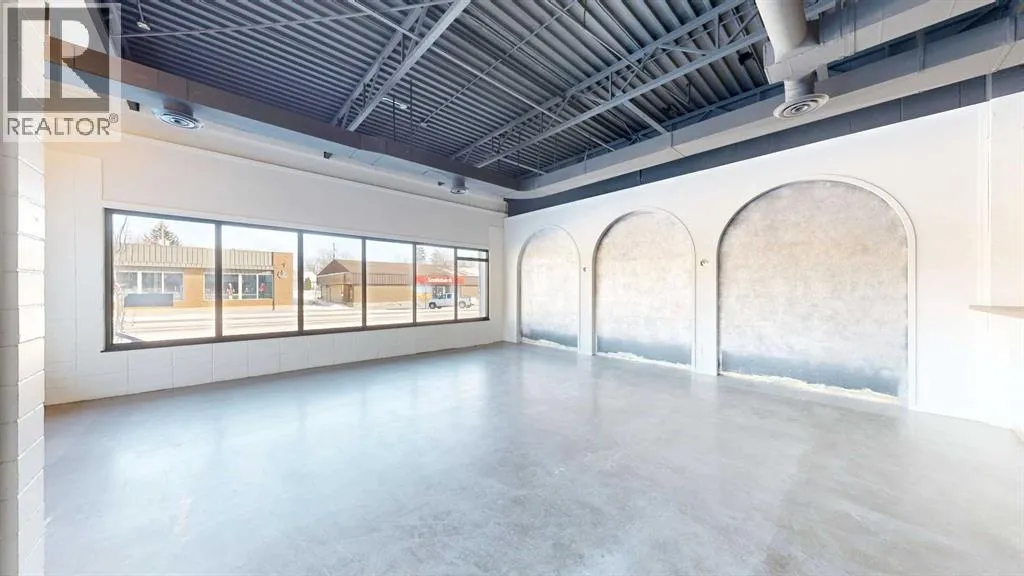 This expansive commercial property on main street in Stettler features a visually appealing and versatile layout suitable for a variety of business styles. The interior blends industrial and modern design, highlighted by exposed beams and ductwork in the high ceilings. Large windows fill the space with natural light for an open, airy feel. This property is partitioned into two main spaces, each with their own front and back doors. The south side has an open area with polished concrete floors, making the space well suited for retail or event use. There is an existing bar with stainless steel commercial sinks, plenty of counterspace, and display shelving. This space currently has two tables with built in seating. The kitchen area adjacent is ready for development. An arched doorway leads you to a bright space with warm wood-look flooring and windows along the front. This could potentially provide a comfortable setting for retail, offices, or meeting areas. Beyond this is another space with marble-look flooring for even more flexibility. There is a large office or storage room as well as a comfortable washroom just around the corner. The hall, which divides the two main spaces, has storage room with shelving and two modern washrooms. With its blend of open concept areas and private rooms, this property can easily accommodate creative studios, professional offices, retail operations, or multi-use commercial ventures. The landlord is open to demising the space with an acceptable lease. (id:27476)