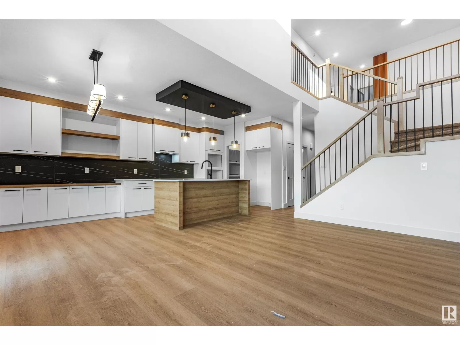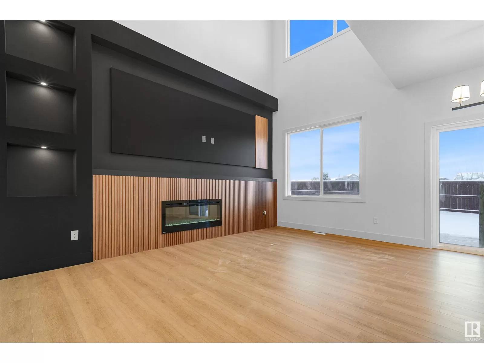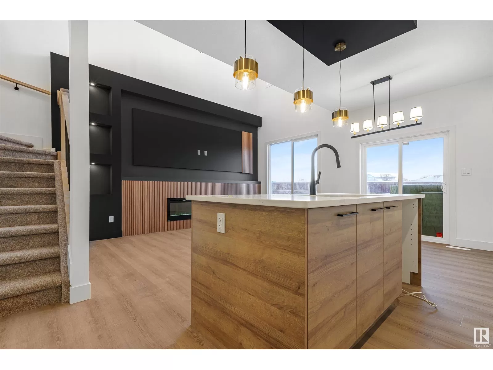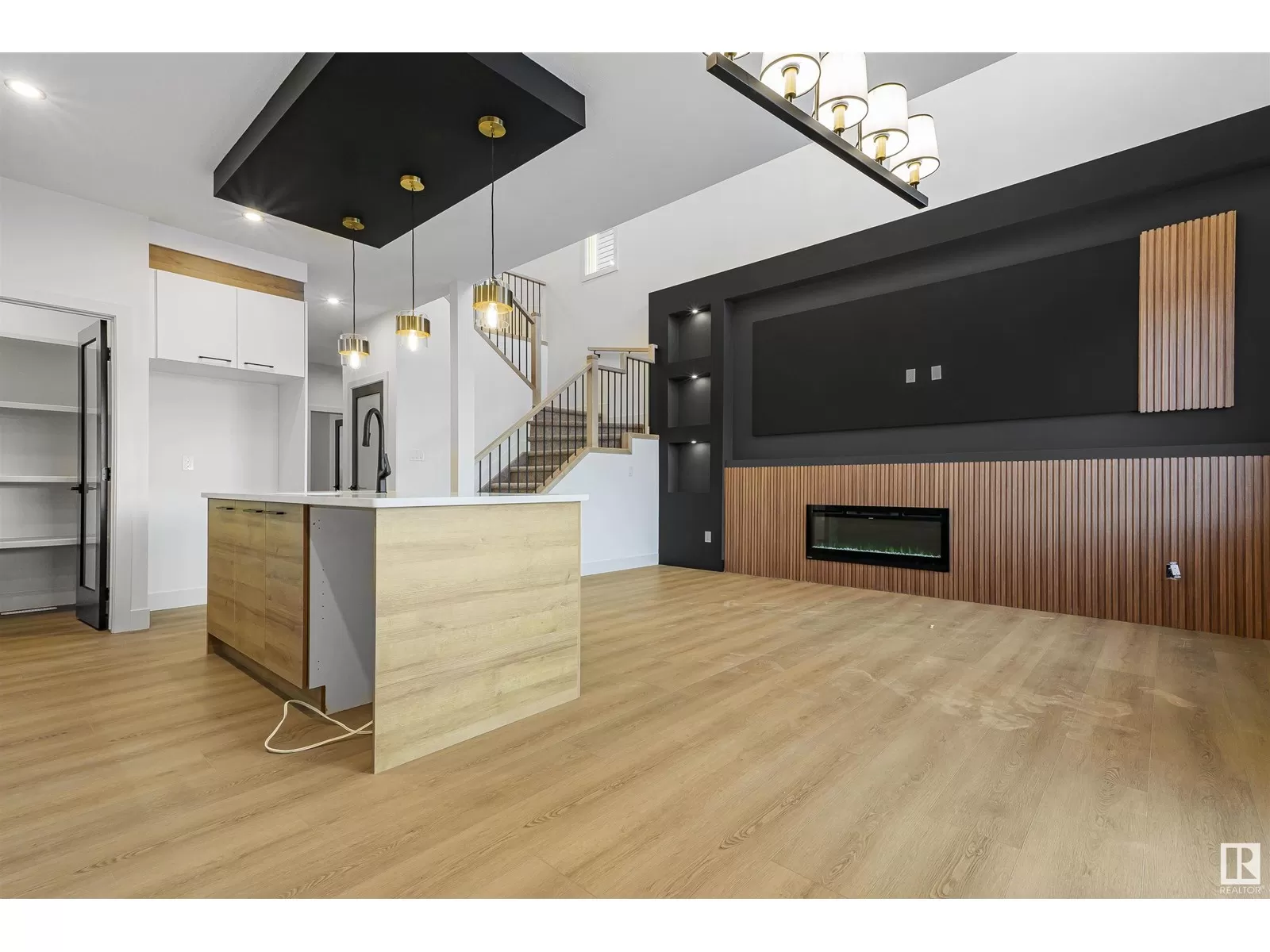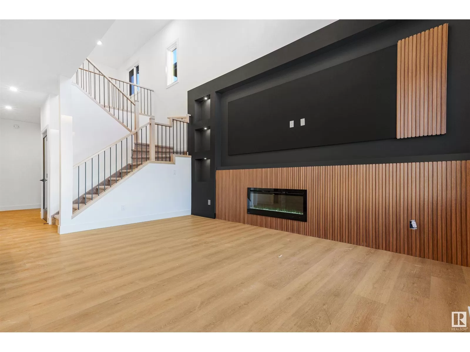 DOUBLE ATTACHED GARAGE- HALF DUPLEX . Main floor entrance leads to Living Area with feature wall and then down the hall OPEN TO ABOVE Living Area with Electric fireplace , Stunning kitchen with modern cabinetry, quartz countertops, center island and spacious pantry. Spacious dinning nook with lots of sunlight. Main floor bedroom with closet & full bathroom. Stairs lead to upper level bonus room. Primary bedroom with 5piece ensuite/ spacious walk in closet/ Featured ceiling & wall design. two more bedrooms down the hall with 4 piece bath. Laundry is also conveniently located on upper level. Unfinished basement with separate entrance waiting for your personal finishes. (id:27476)