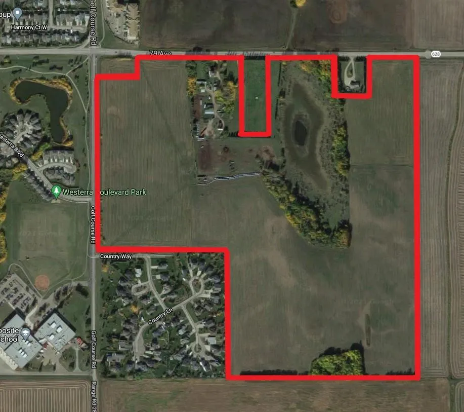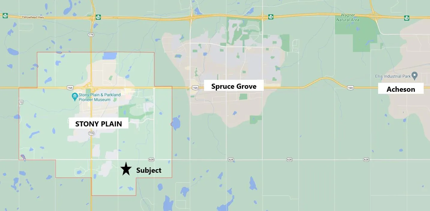 Exceptional opportunity for future development with this 124-acre +/- parcel in the Town of Stony Plain! Positioned prominently on the corner of a busy intersection where Golf Course Road meets Highway 628/79 Ave. This property has excellent exposure, with an estimated 4,480 vehicles per day on Highway 628 and 3,900 vehicles per day on Golf Course Road. The potential here is vast, spanning from high to low density residential and commercial retail development possibilities. This large and distinctive parcel benefits from municipal water and sewer lines adjacent to the property. Conveniently located near multiple residential communities and across from Stony Plain Memorial Composite High School, it currently serves as farmland with a residence on-site. Just a mere 15 minutes from the Acheson Industrial Area and a quick 25-minute drive to Edmonton. Zoned FD (Future Development). (id:27476)