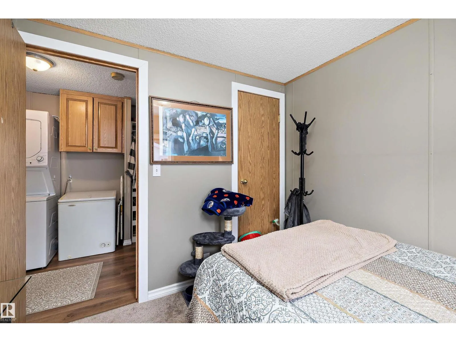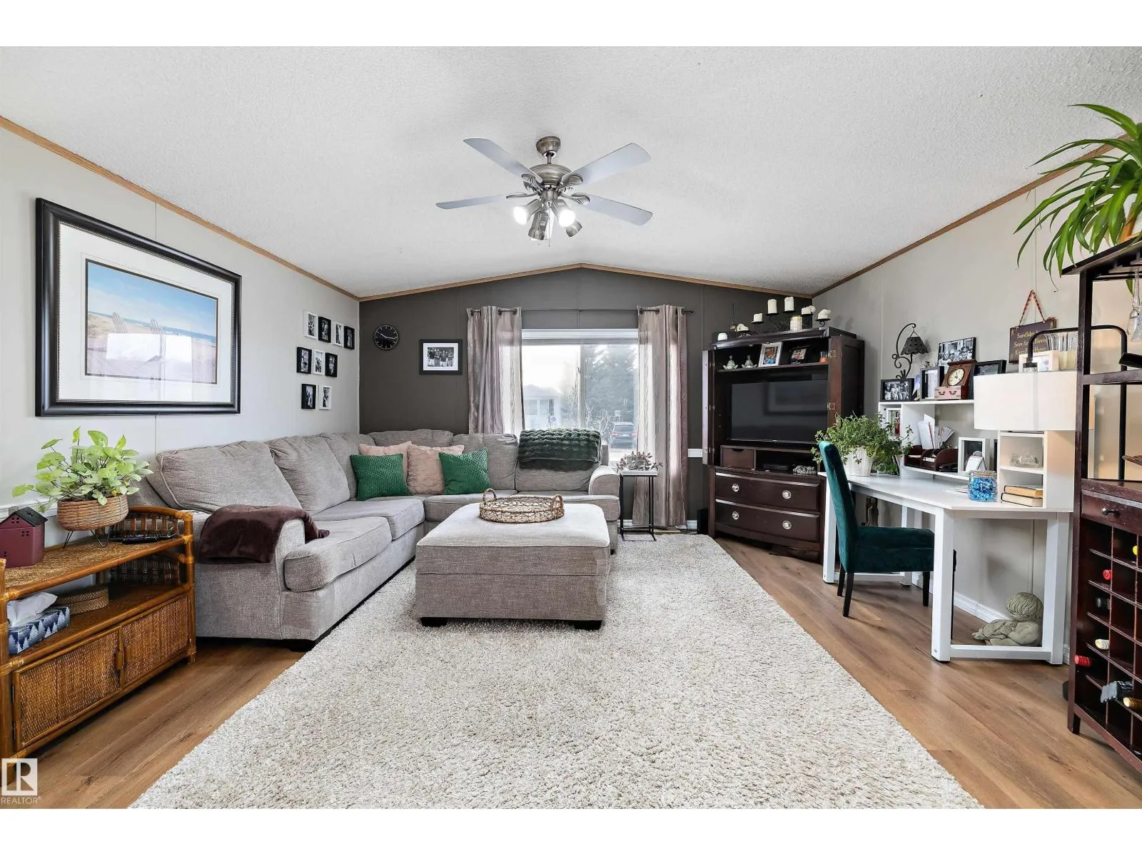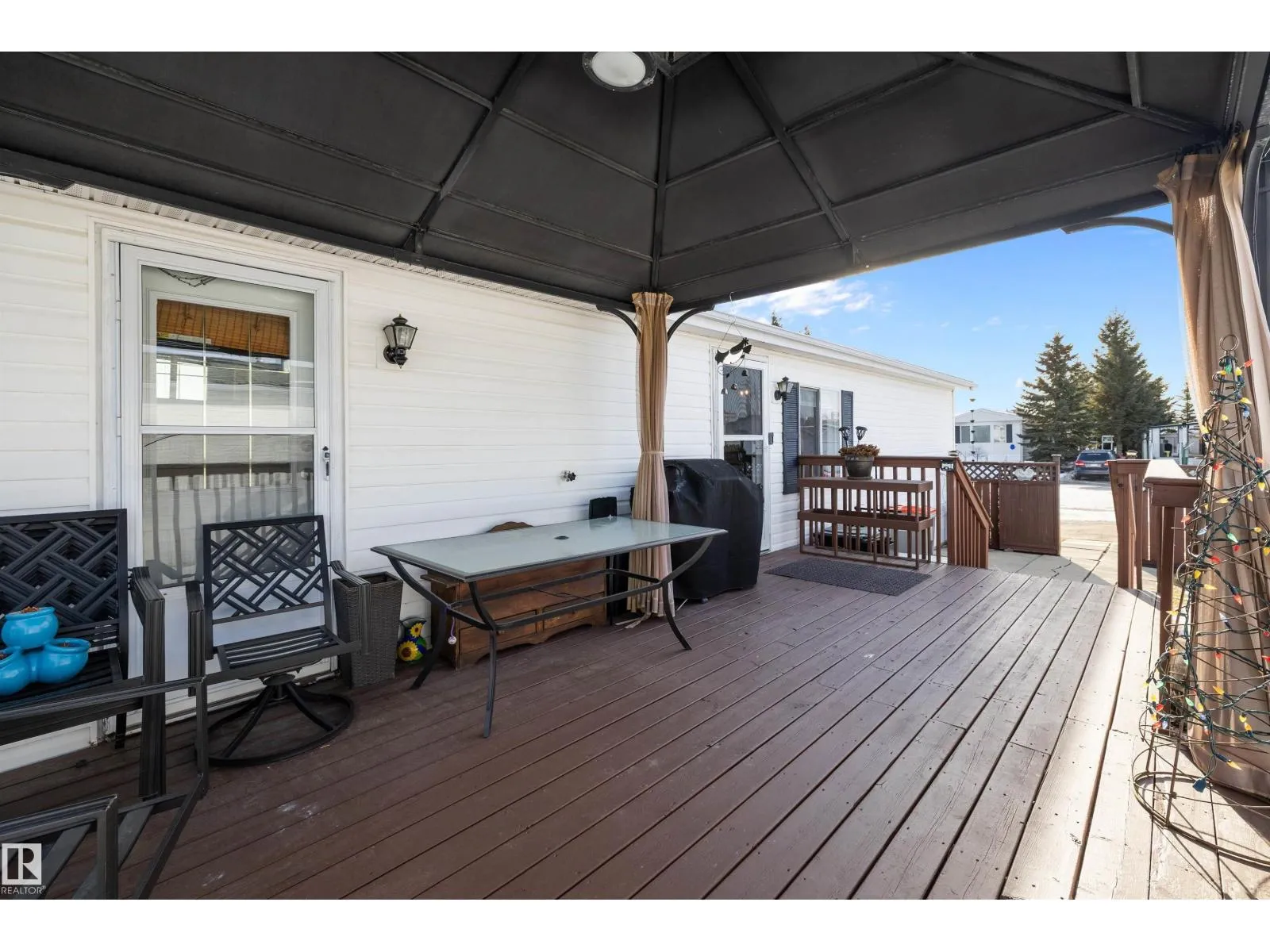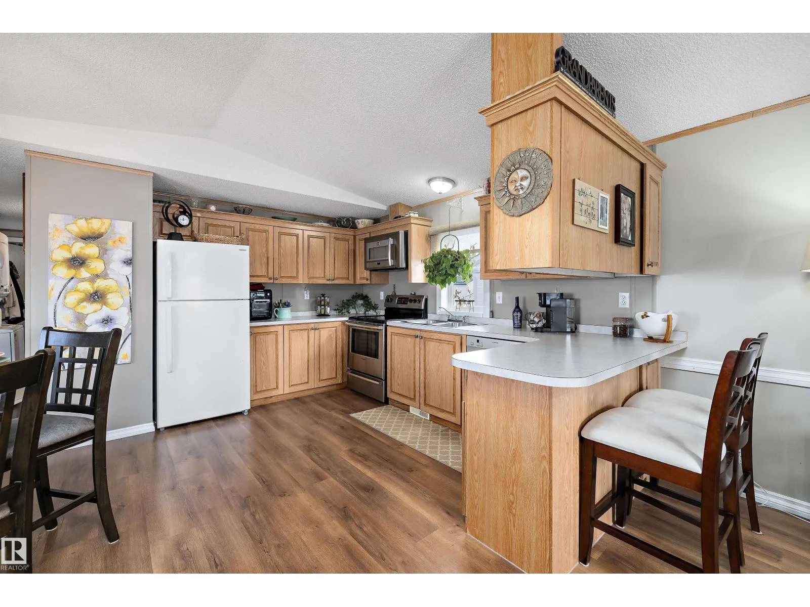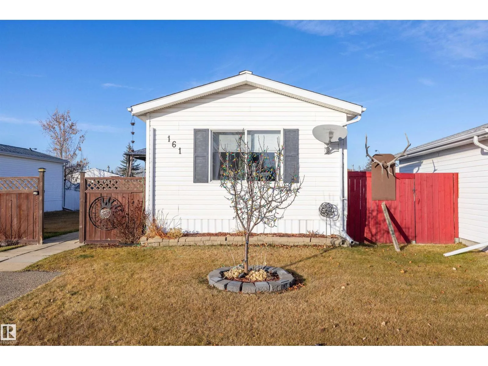 Step inside this quaint 2 bedroom home in the quiet community of Meridian Meadows. This home has been lovingly maintained and features an open concept kitchen and living space with vaulted ceilings that is drenched in natural sunlight with a large south facing livingroom window. Living space has newer laminate flooring and kitchen has some updated appliances. Toward the rear of the home you will find a 4 piece bathroom, 2nd bedroom, Primary bedroom with large closet, and stackable washer/dryer. There are 2 doorways onto the BIG deck in the sunny west facing yard. The yard is fenced and also features a storage shed and firepit area. This home is located in a quiet cul de sac. Meridian Meadows is well maintained and features a fenced in dog park area. The community office often puts on small community events. (id:27476)