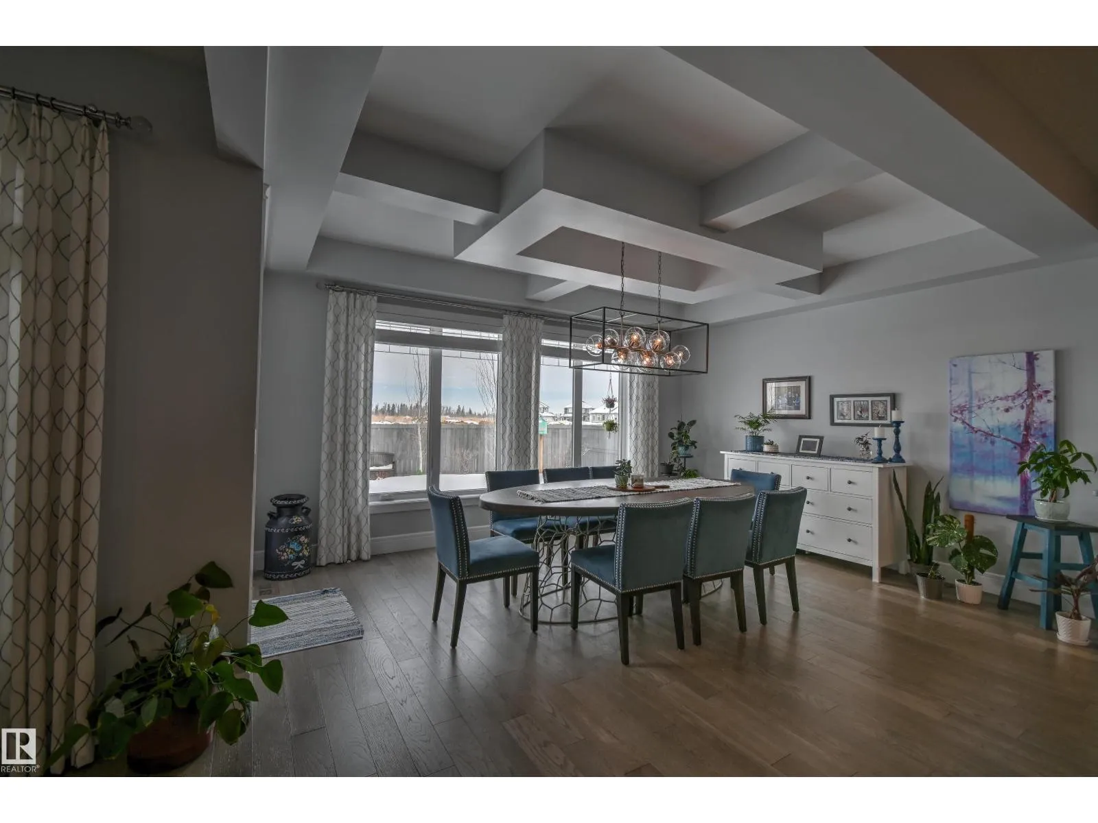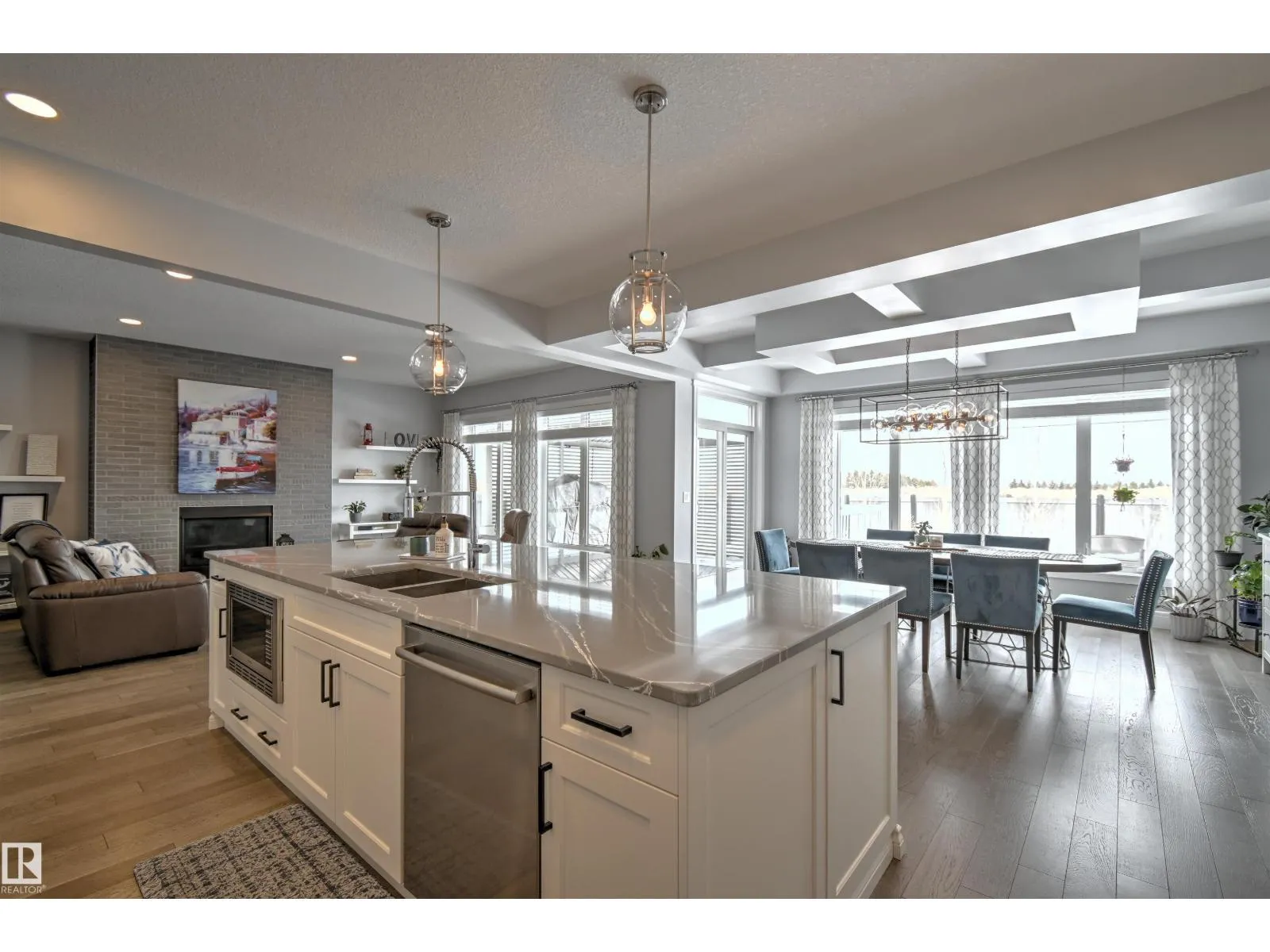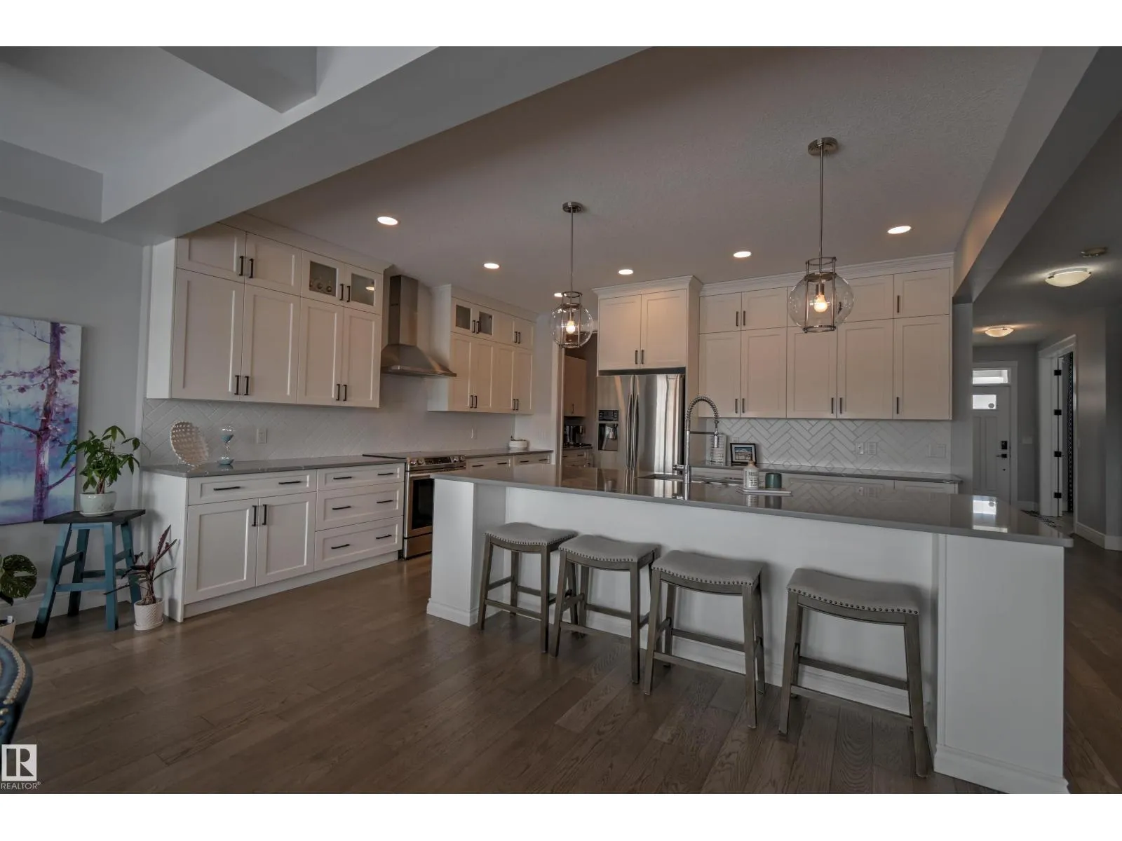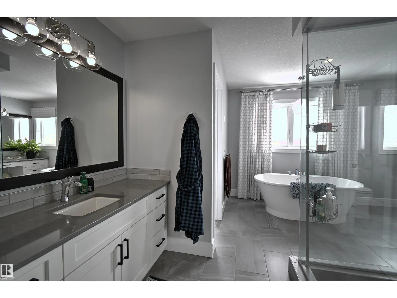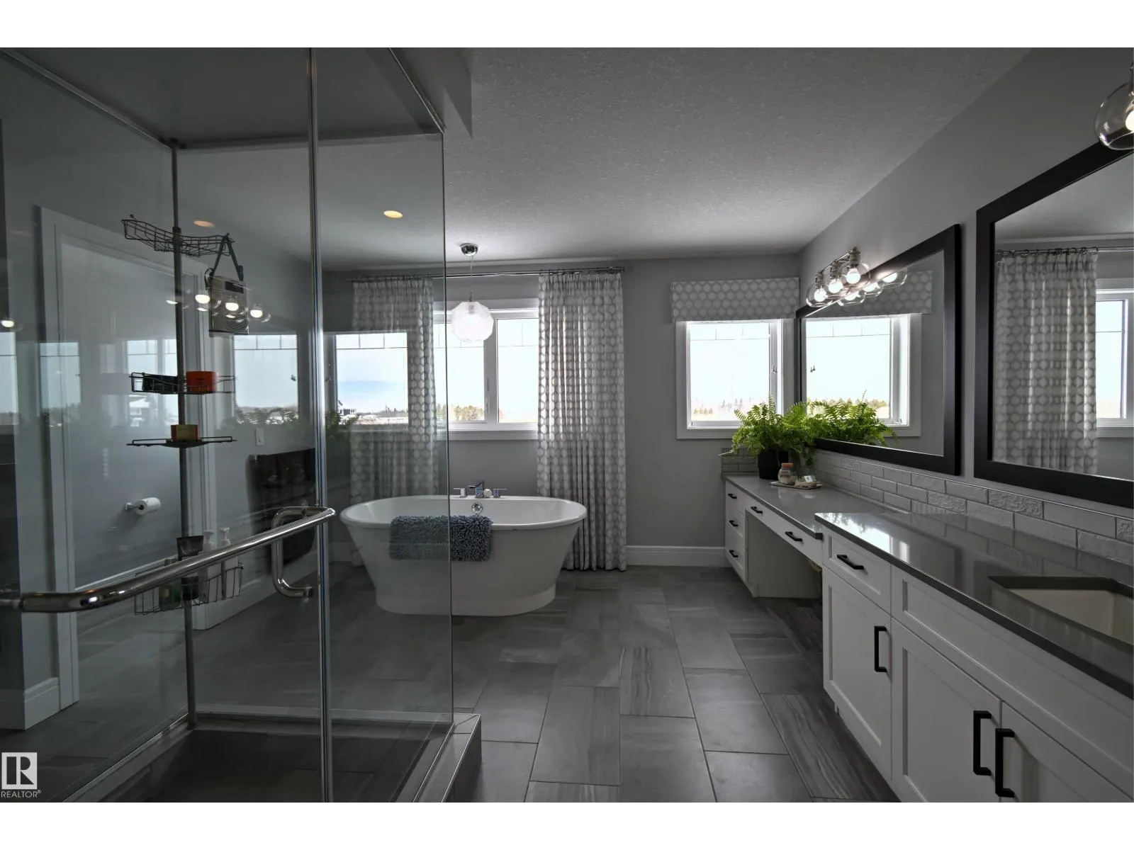 Welcome to Genesis Lake, an exceptional residence combining luxury, function and thoughtful upgrades. This home features a four-car heated garage with convenient pass-through to a private backyard, professionally landscaped beds with concrete curbing, and a composite deck with gazebo for summer entertaining. Inside, enjoy 9-foot ceilings, 8-foot doors, engineered hardwood, central A/C, and a front office overlooking the patio. The gourmet kitchen offers white cabinetry to the ceiling, a massive island, stainless hood, and chevron tile backsplash. Adjoining dining with coffered ceiling opens to a generous eating area. A walk-through pantry,with butler/coffee bar lead to a mudroom with custom shelving. A tiled dog wash with glass door and abundant storage add everyday convenience. Upstairs, a vaulted bonus room, spacious bedrooms with views, and a primary suite with laundry access and a luxurious 5-piece ensuite complete the home. The basement is fully finish & solar power and LED lighting (id:27476)