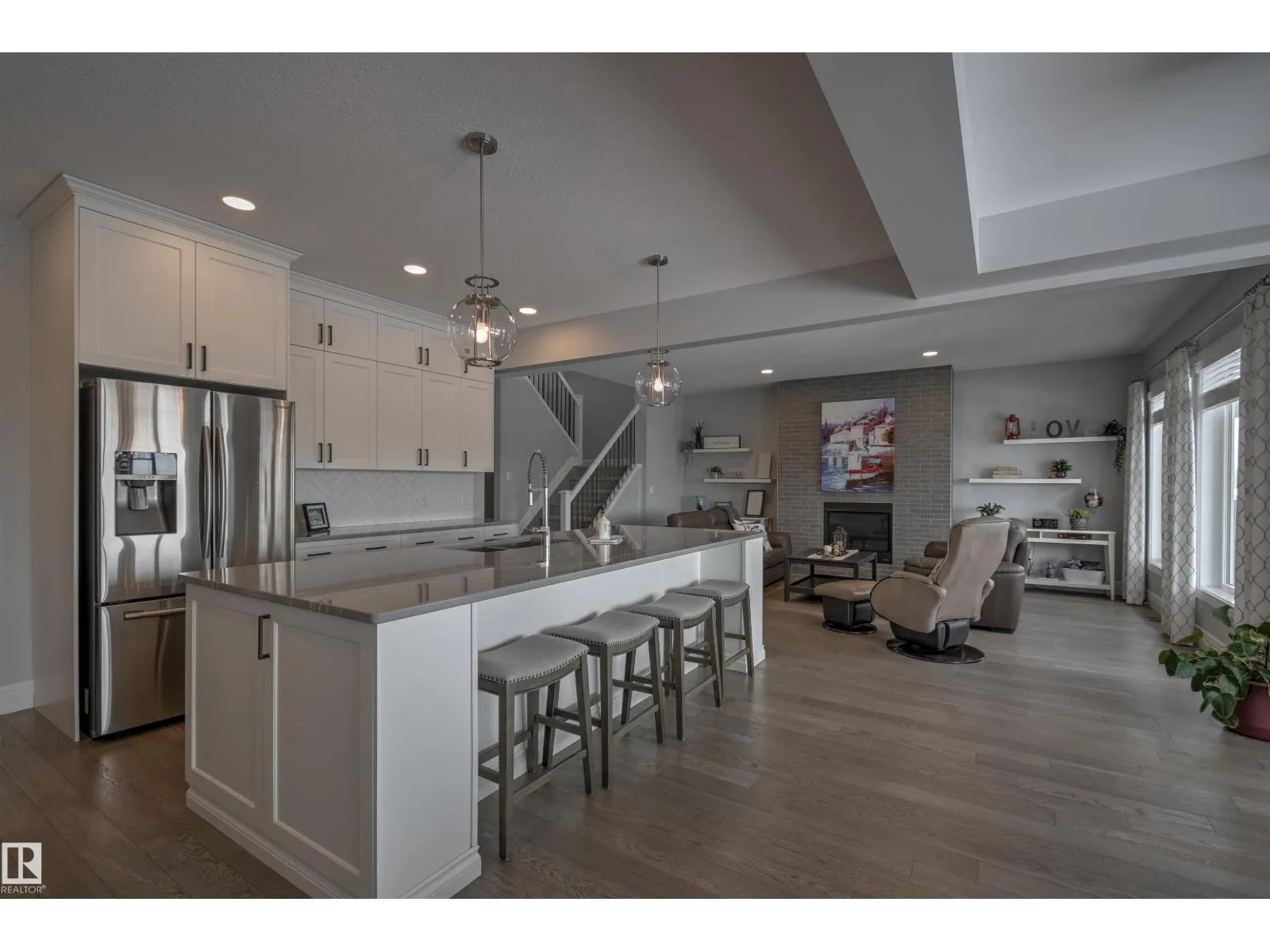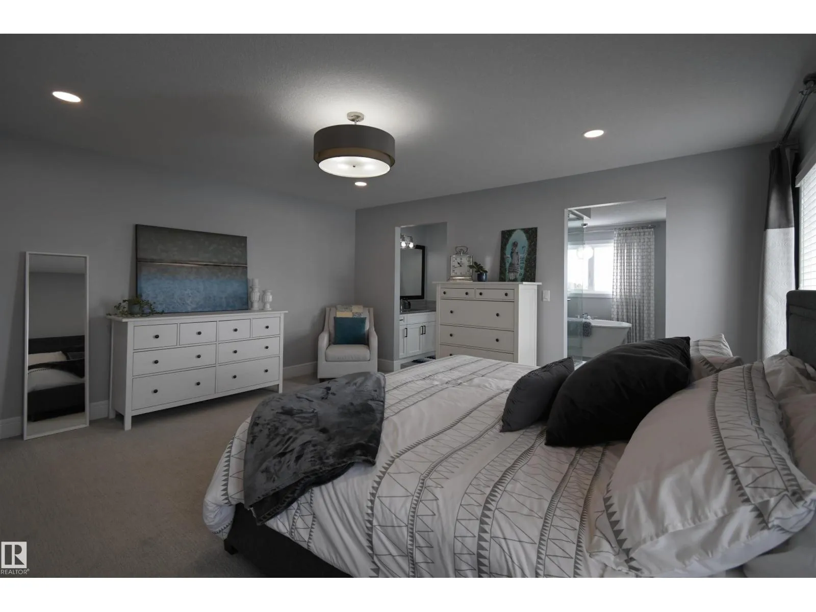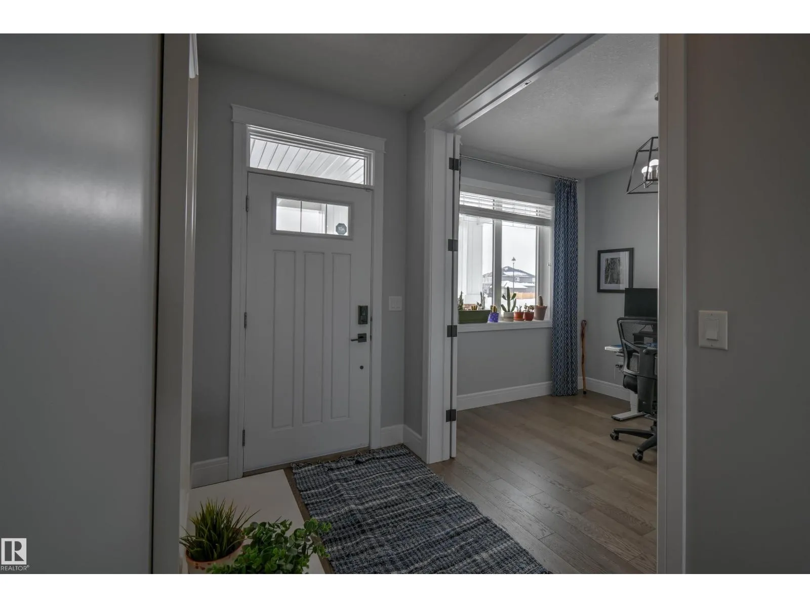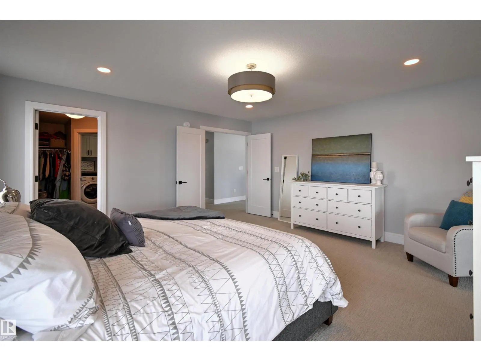 Welcome to Genesis Lake, an exceptional residence combining luxury, function and thoughtful upgrades. This home features a four-car heated garage with convenient pass-through to a private backyard, professionally landscaped beds with concrete curbing, and a composite deck with gazebo for summer entertaining. Inside, enjoy 9-foot ceilings, 8-foot doors, engineered hardwood, central A/C, and a front office overlooking the patio. The gourmet kitchen offers white cabinetry to the ceiling, a massive island, stainless hood, and chevron tile backsplash. Adjoining dining with coffered ceiling opens to a generous eating area. A walk-through pantry,with butler/coffee bar lead to a mudroom with custom shelving. A tiled dog wash with glass door and abundant storage add everyday convenience. Upstairs, a vaulted bonus room, spacious bedrooms with views, and a primary suite with laundry access and a luxurious 5-piece ensuite complete the home. The basement is fully finish & solar power and LED lighting (id:27476)