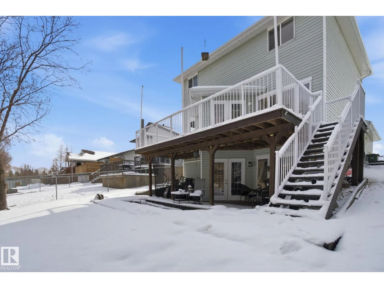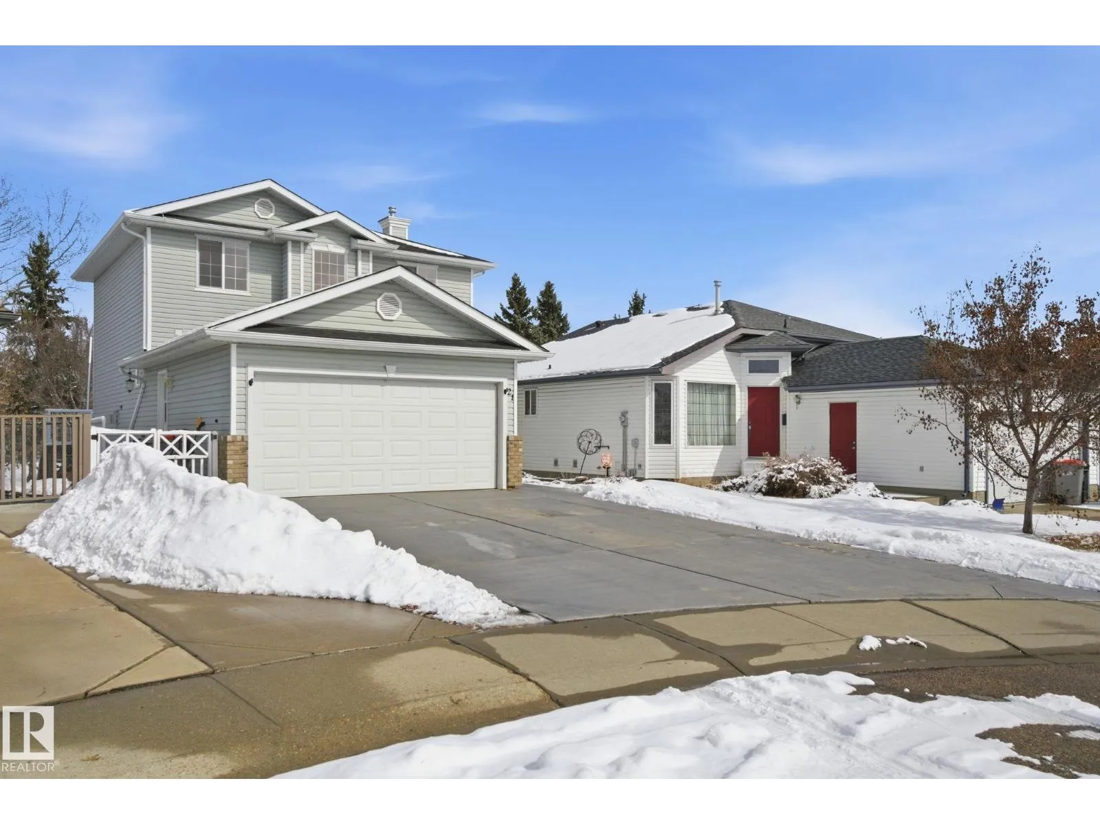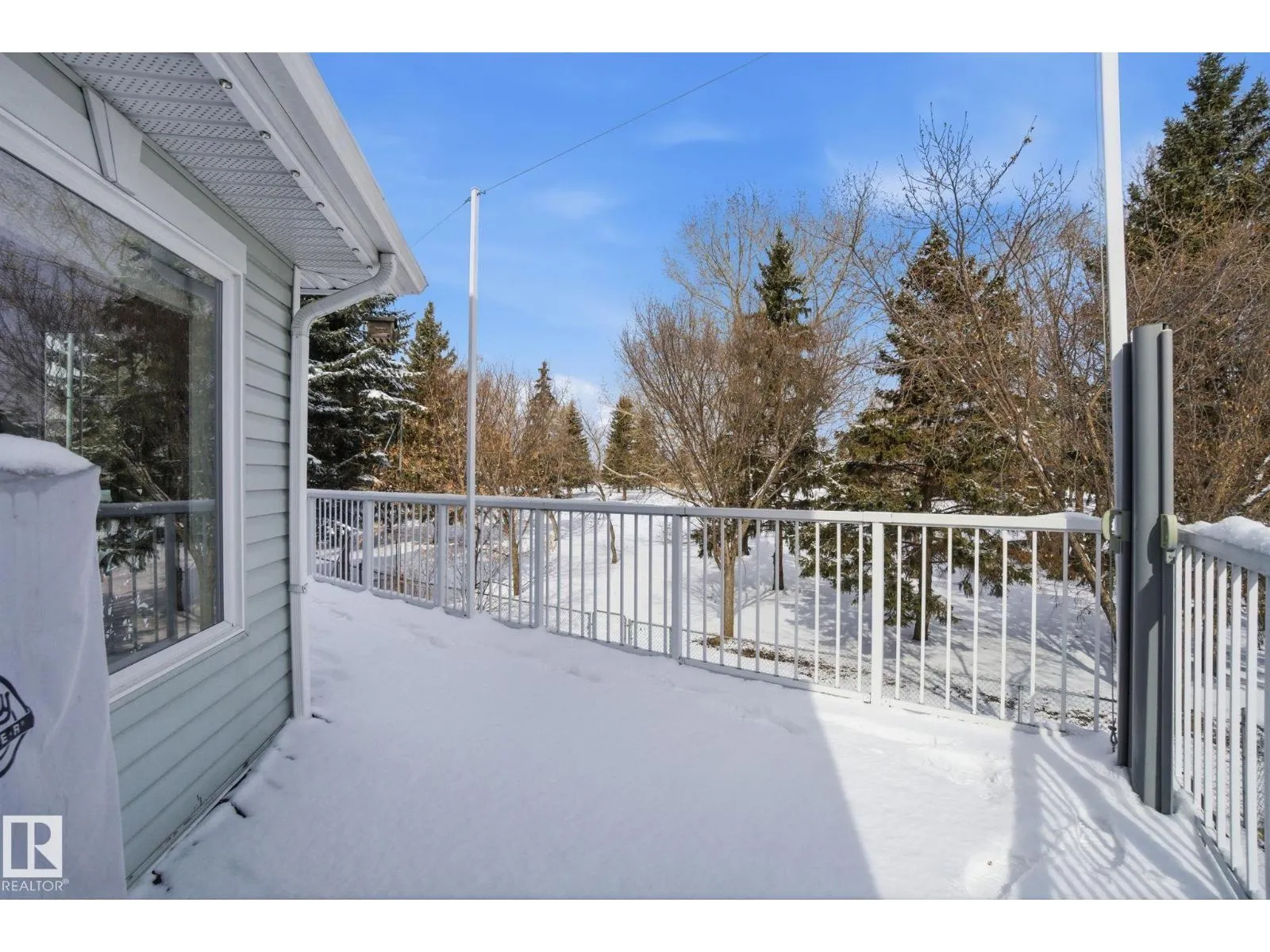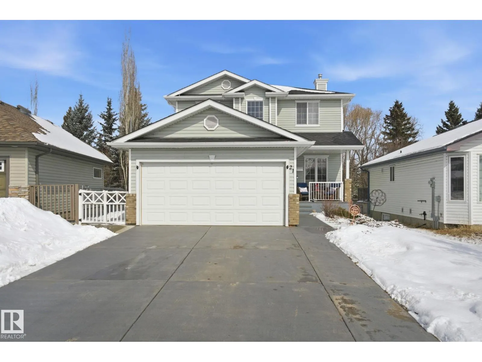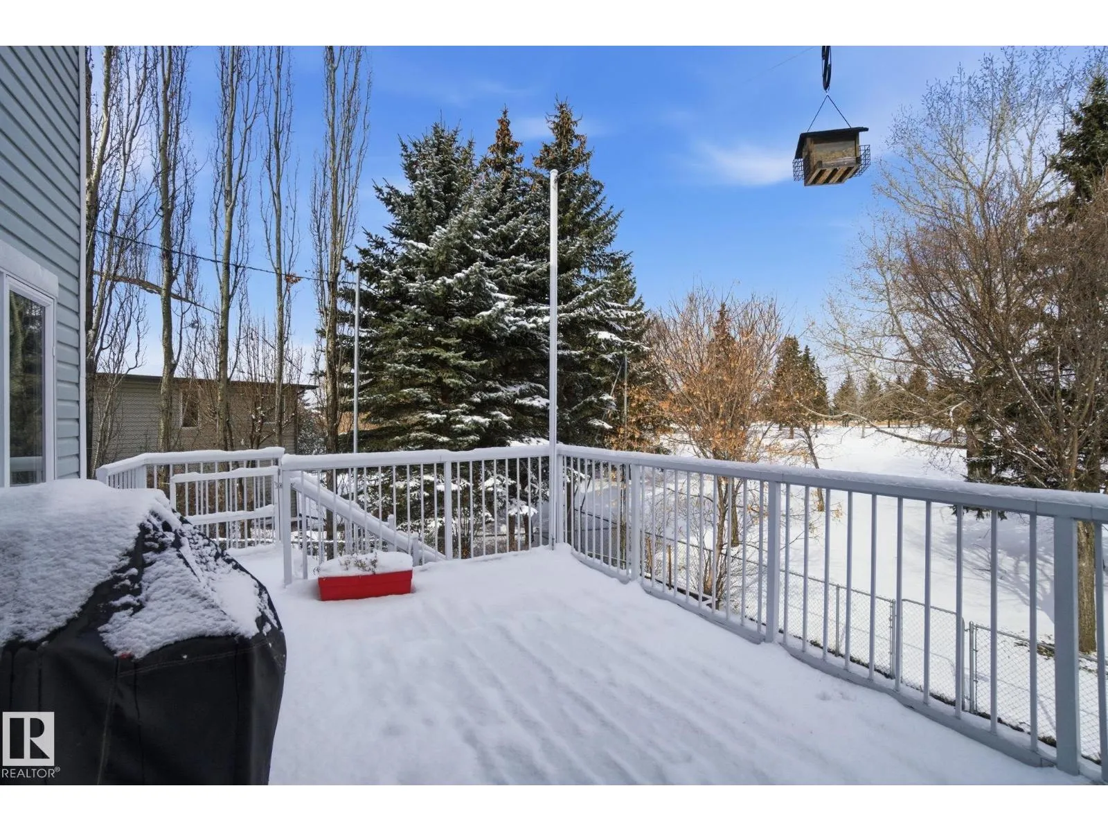 Beautiful WALKOUT 2-storey BACKING the GOLF COURSE in Stony Plain! Over 1500 sq ft PLUS fully finished basement. 18' ceilings greet you as you enter. Front flex room could be a great dining space, home office or formal living room. NEW kitchen is gorgeous with beautiful white cabinets, quartz countertops, corner pantry & updated appliances! Great breakfast nook with room to expand for guests! Large living room for more entertaining with gas fireplace. Tons of natural light through the windows looking onto the mature trees of the golf course. MAIN FLOOR LAUNDRY! Upstairs the master suite is a great size with large walk in closet and newly renovated 4pc ensuite. 2 more bedrooms are great for kids, guests or a home office. Walkout basement has large rec room space. It's even fully plumbed for wet bar or future 2nd kitchen. Another bedroom & 4pc bath. Large deck is great to spend a warm summer evening & yard is fully landscaped including picture, perfect Koi pond. It's your own private oasis!!! (id:27476)