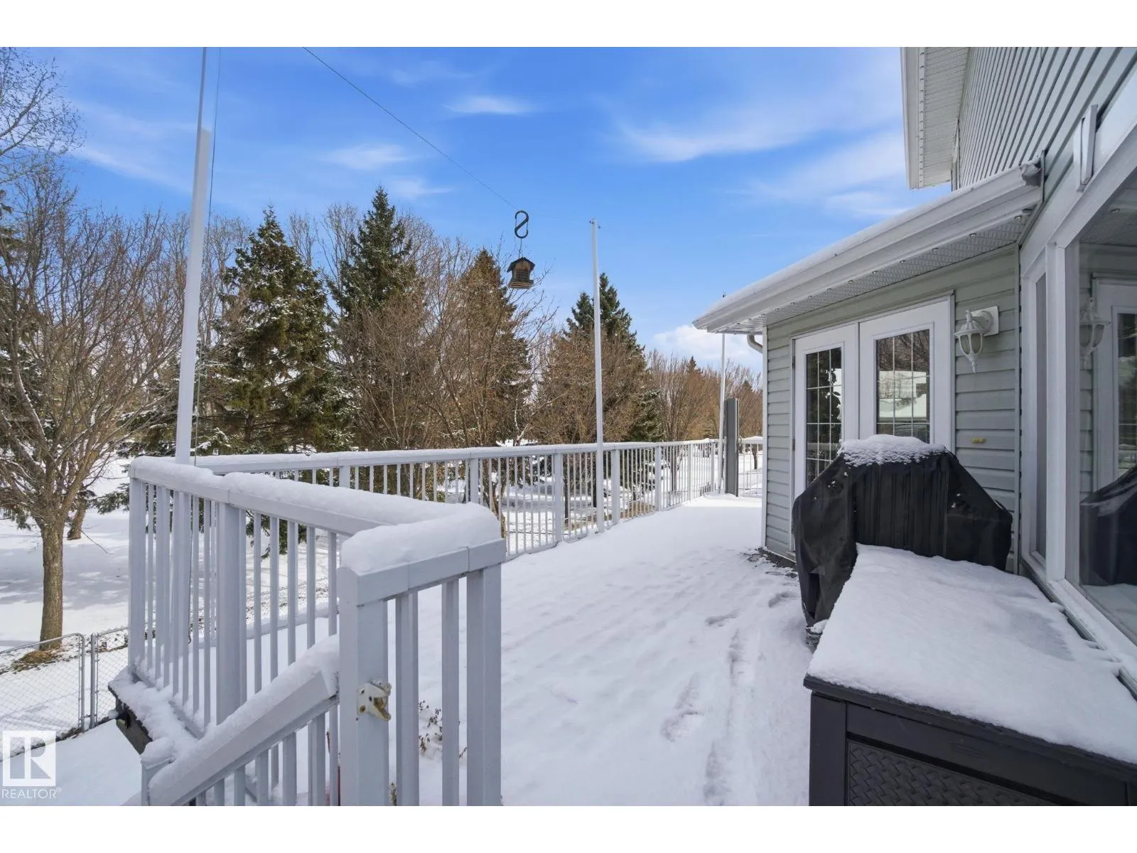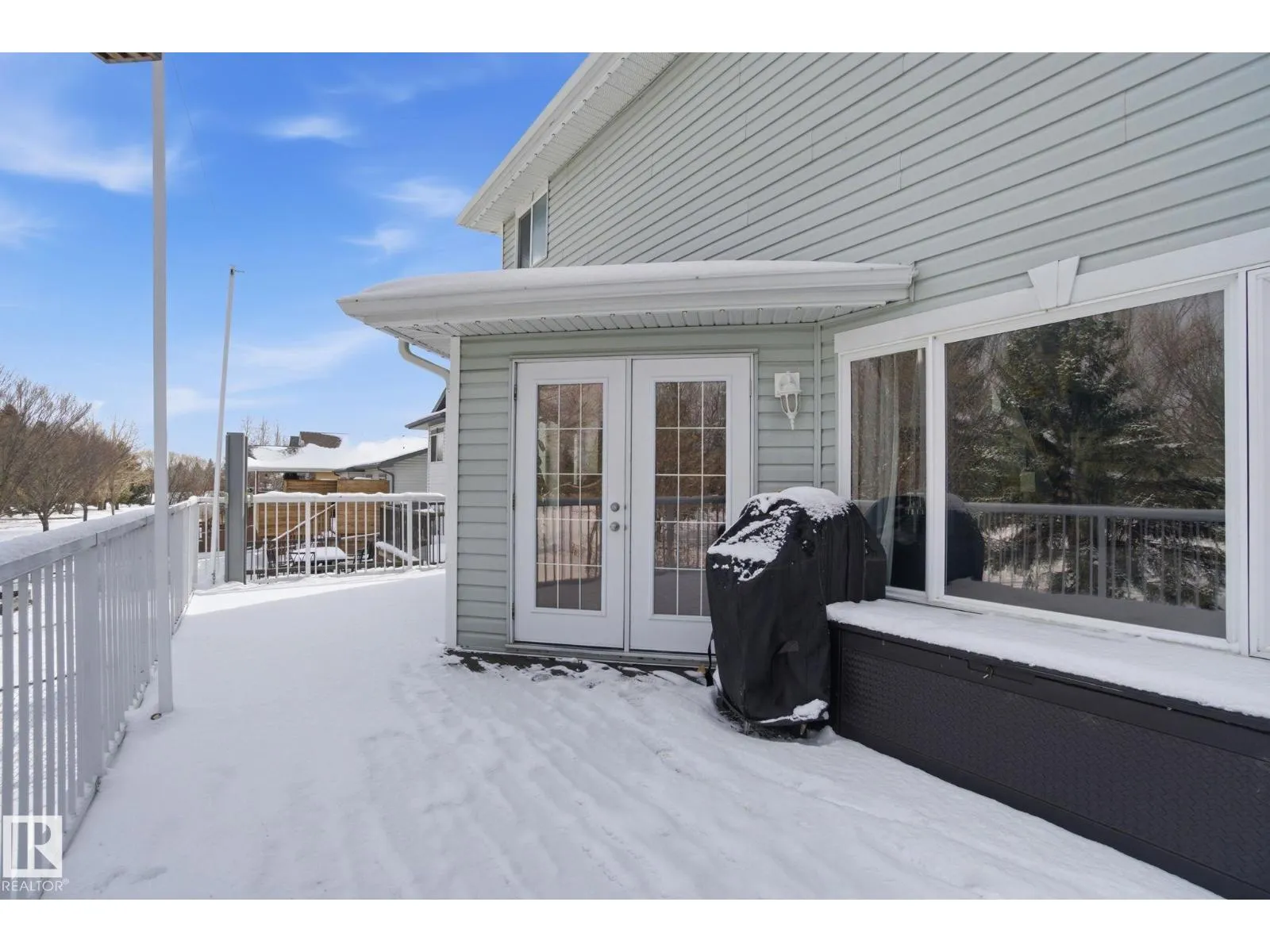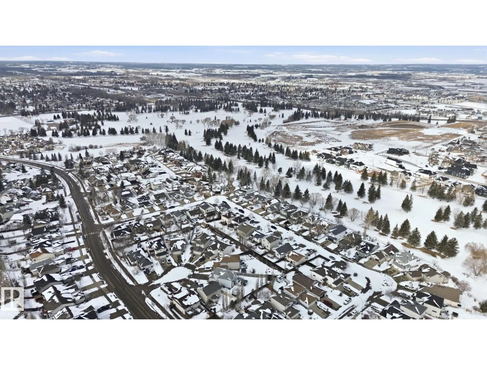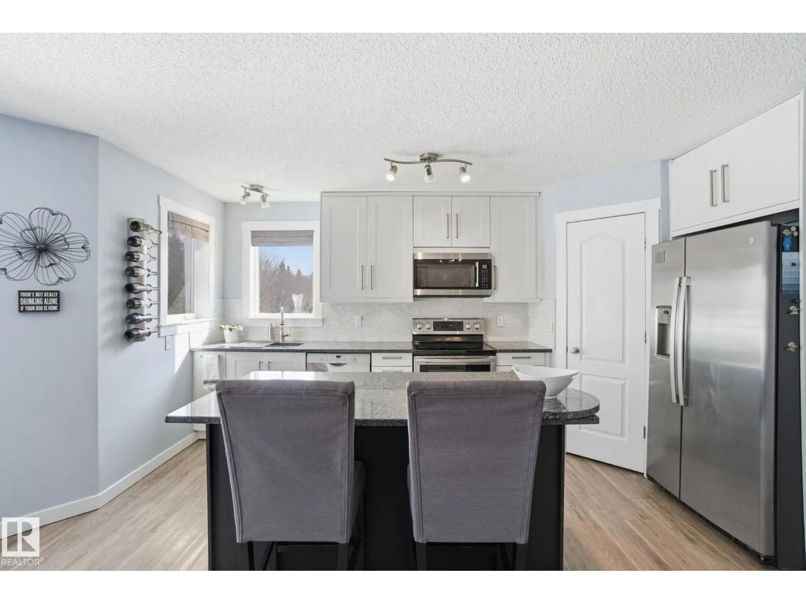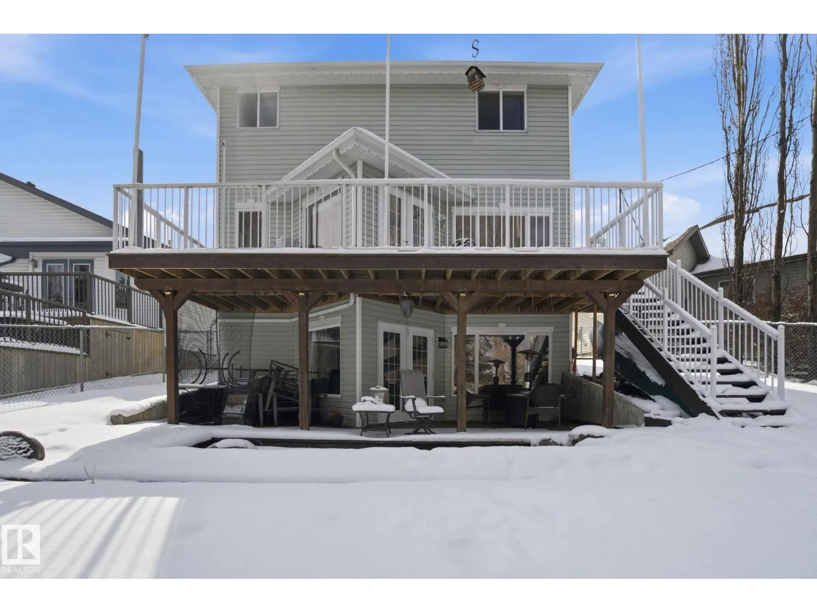 Beautiful WALKOUT 2-storey BACKING the GOLF COURSE in Stony Plain! Over 1500 sq ft PLUS fully finished basement. 18' ceilings greet you as you enter. Front flex room could be a great dining space, home office or formal living room. NEW kitchen is gorgeous with beautiful white cabinets, quartz countertops, corner pantry & updated appliances! Great breakfast nook with room to expand for guests! Large living room for more entertaining with gas fireplace. Tons of natural light through the windows looking onto the mature trees of the golf course. MAIN FLOOR LAUNDRY! Upstairs the master suite is a great size with large walk in closet and newly renovated 4pc ensuite. 2 more bedrooms are great for kids, guests or a home office. Walkout basement has large rec room space. It's even fully plumbed for wet bar or future 2nd kitchen. Another bedroom & 4pc bath. Large deck is great to spend a warm summer evening & yard is fully landscaped including picture, perfect Koi pond. It's your own private oasis!!! (id:27476)